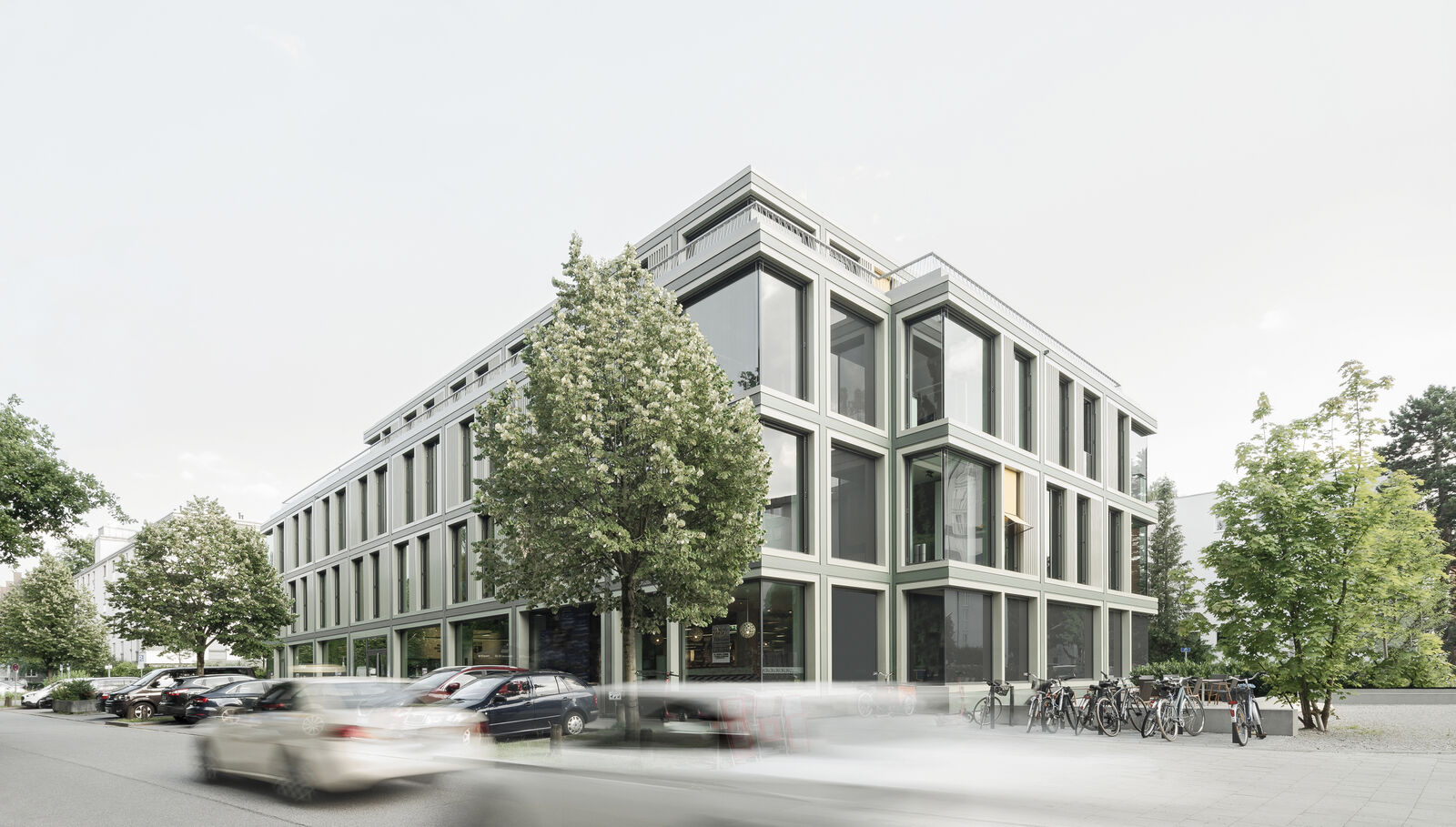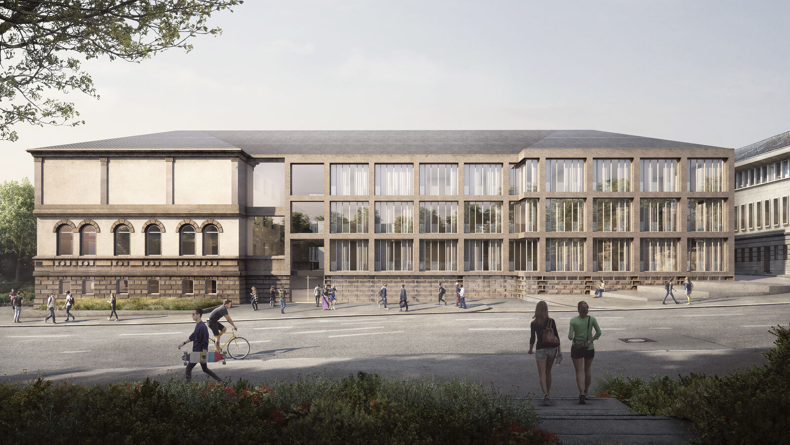 Durch Aufstockung in Holzbauweise, performativen Fassaden sowie Begrünungen wird der 70er-Jahre Bestand zu einem flexibel bespielbarem Stadtbaustein mit öffentlichen Bereichen umgenutzt.