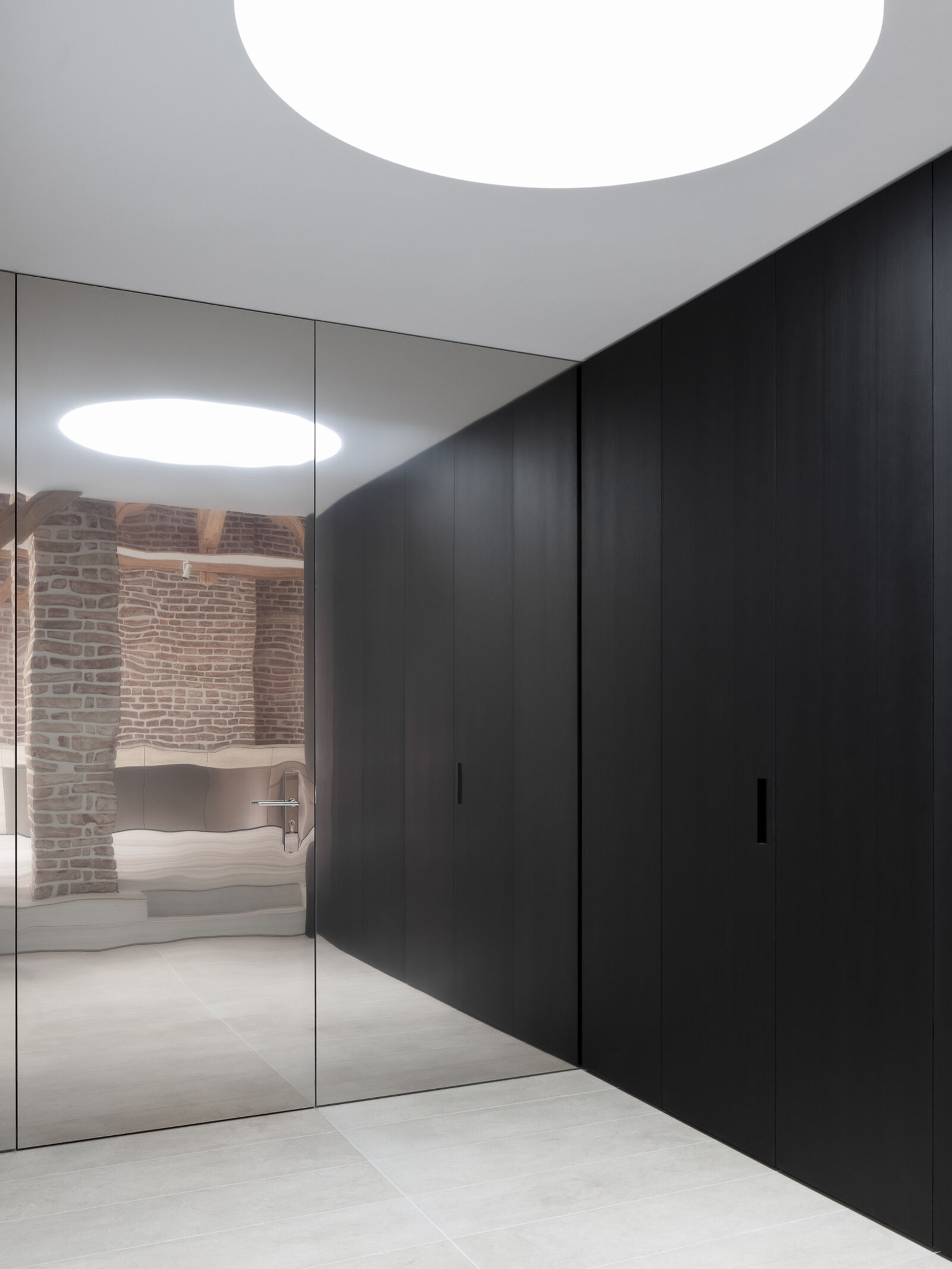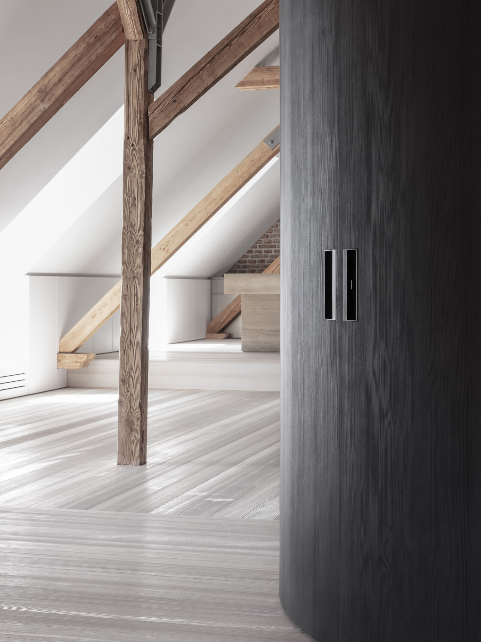 In engem Dialog mit den Auftraggeber*innen wurden auf diese Weise die Raumsequenzen so inszeniert, dass überall nuancierte Atmosphären entstanden: durch freigelegte historische Sichtmauerwerke, großzügige Lichtzylinder für Akzente aus Zenitlicht, große schwellenlose Fensteröffnungen, filigran optimierte Sichtholztragwerke, den handwerklich überarbeiteten Zwiebelturm, eine schwebende Stahlspindeltreppe und maßangefertigte Einbaumöbel.