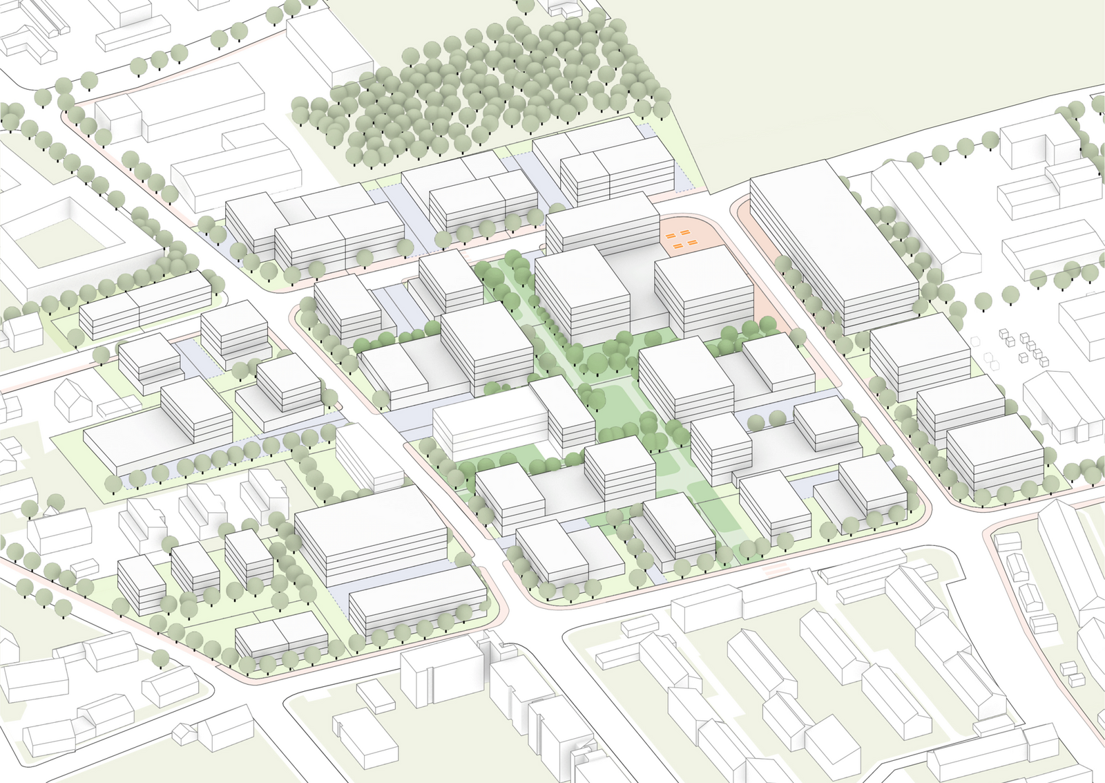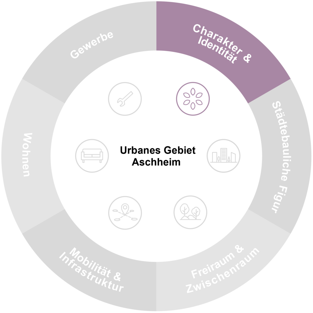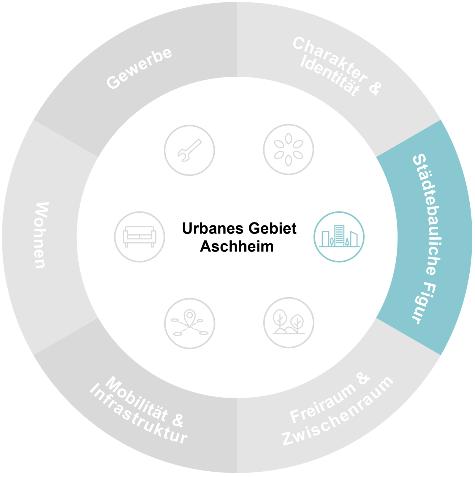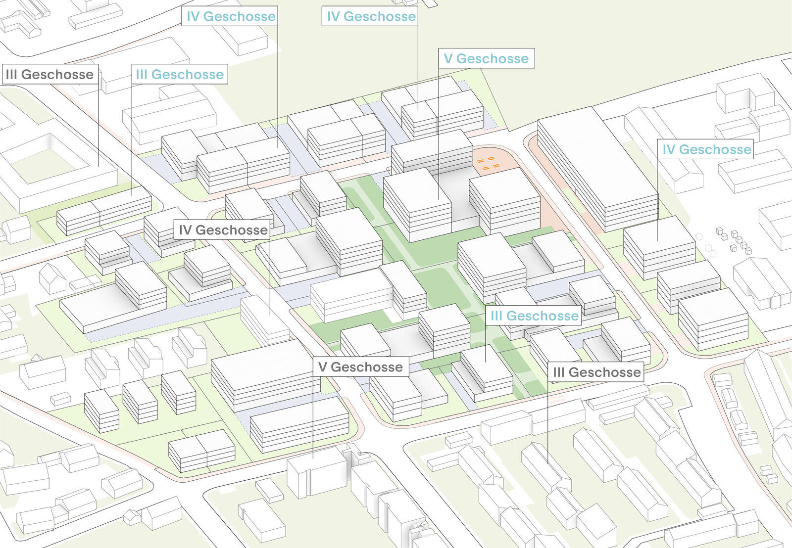 Im neuen 'Urbanen Gebiet Aschheims' wird zur effizienten Nutzung der Fläche mehr bauliche Dichte geschaffen und gleichzeitig mehr Fläche entsiegelt. Innenentwicklung vor Außenentwicklung rückt in den Fokus des Städtebaus. Die Höhenentwicklung knüpft in der Randzone des Quartiers an die Bestandshöhen der Nachbarschaft an und wird zur Quartiersmitte hin auf bis zu fünf Vollgeschosse erhöht. Das neue Quartier fügt sich durch die Höhenstaffelung in die Nachbarschaft ein und schafft gleichzeitig eine Verdichtung in der Kernzone.