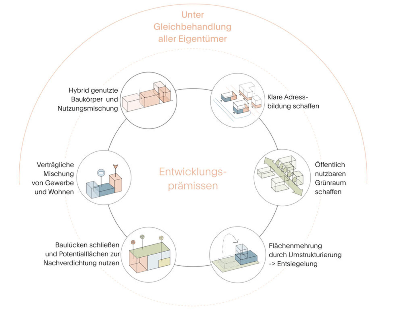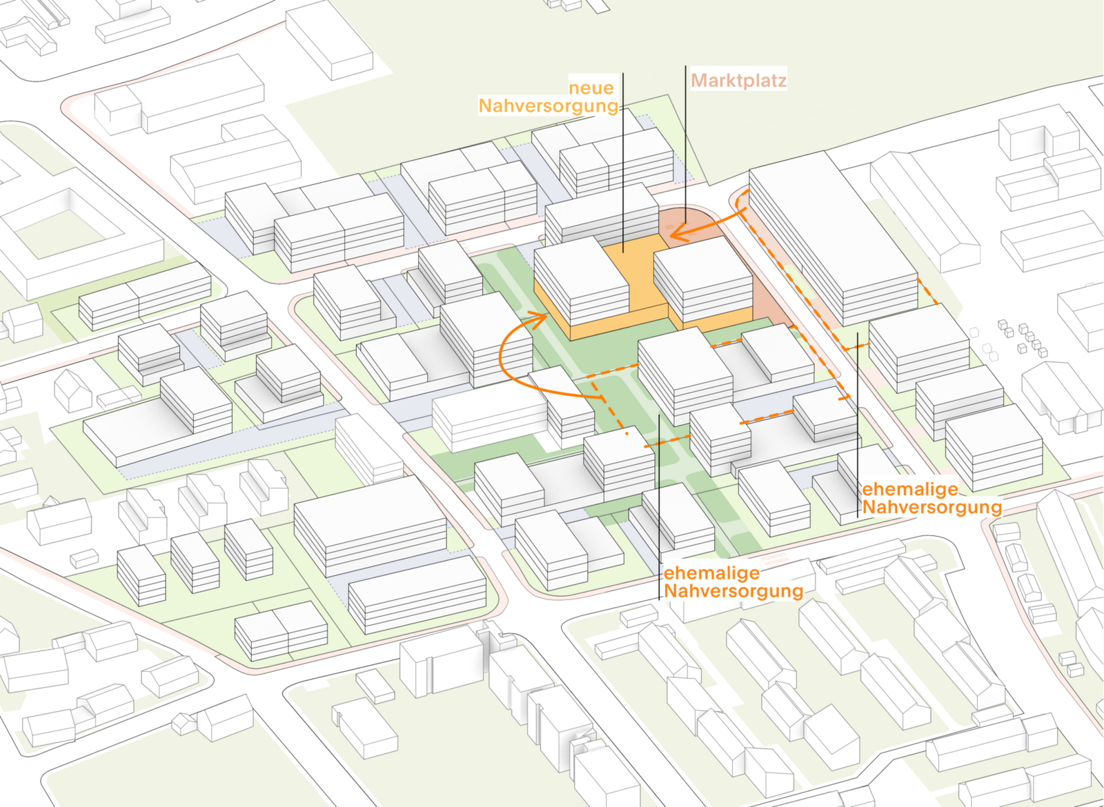 Im Mittelpunkt der städtebaulichen Planung in Aschheim steht die Transformation eines bestehenden innerörtlichen Gewerbegebiets in ein vielseitiges und lebendiges urbanes Gebiet. Dieser neu entstehende urbane Raum wird geprägt durch hybride Gebäudetypologien, welche unterschiedliche Nutzungen in sich vereinen. Neben den Bestandsgewerbe-Strukturen etablieren sich dort Wohnen, Nahversorgung und Bildungseinrichtungen und schaffen so eine Quartiersstruktur, die das tägliche Leben bereichert. Ergänzend dazu fördern öffentliche Einrichtungen und Begegnungsräume wie der zentrale Marktplatz sowie Bildungs- und Kulturangebote die soziale Interaktion und stärken die Identität des Quartiers.