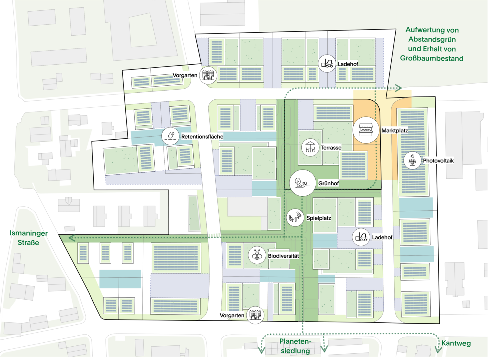 Nachhaltigkeit ist ein zentrales Leitmotiv des Projekts. Das Quartier wird durch gezielte Entsiegelungsmaßnahmen und die Integration von klimafunktionalen Freiräumen aufgewertet. Dachbegrünungen, Photovoltaik-Anlagen und zentrale Grünflächen schaffen ökologische Mehrwerte und verbessern die Aufenthaltsqualität. Das Grünhof-Konzept, das Wohngebäude mit gemeinschaftlich nutzbaren Außenräumen verbindet, ist ein wesentlicher Bestandteil dieser Strategie.