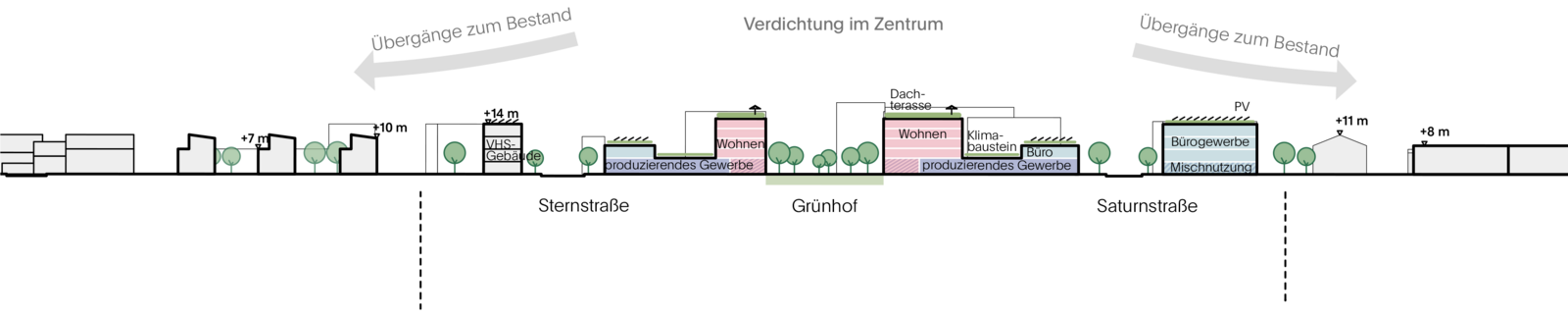 Die Mischung aus Wohnen und Gewerbe wird künftig den Charakter des Gebietes bestimmen. Eine zentrale Rolle für die Identität des Quartiers wird die Kombination aus kompakten, hybriden Bausteinen und großzügigem Freiraum einnehmen. Der Grünhof nimmt Bezug auf die Struktur der Wohnbebauungen in unmittelbarer Umgebung des Areals. Die Dichte verbunden mit ergänzenden öffentlichen Nutzungen schafft einen lebendigen Ort, an dem generationsübergreifend Bewohner*innen Aschheims zusammenkommen können. Von Nahversorgung mit öffentlichem Marktplatz über Gesundheitsversorgung und Bildung bis hin zu sozialen Angeboten entsteht ein lebendiges Stadtquartier der kurzen Wege.