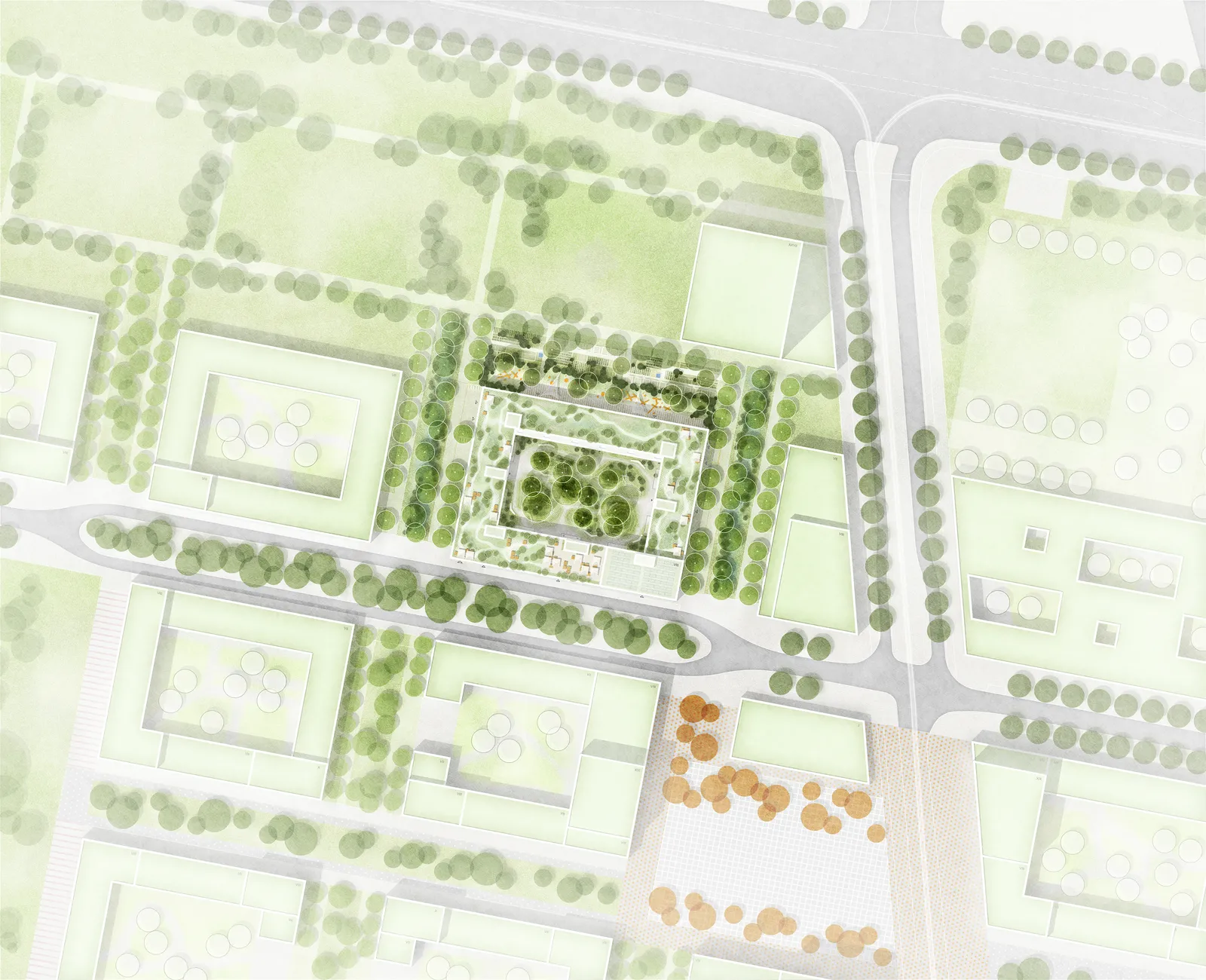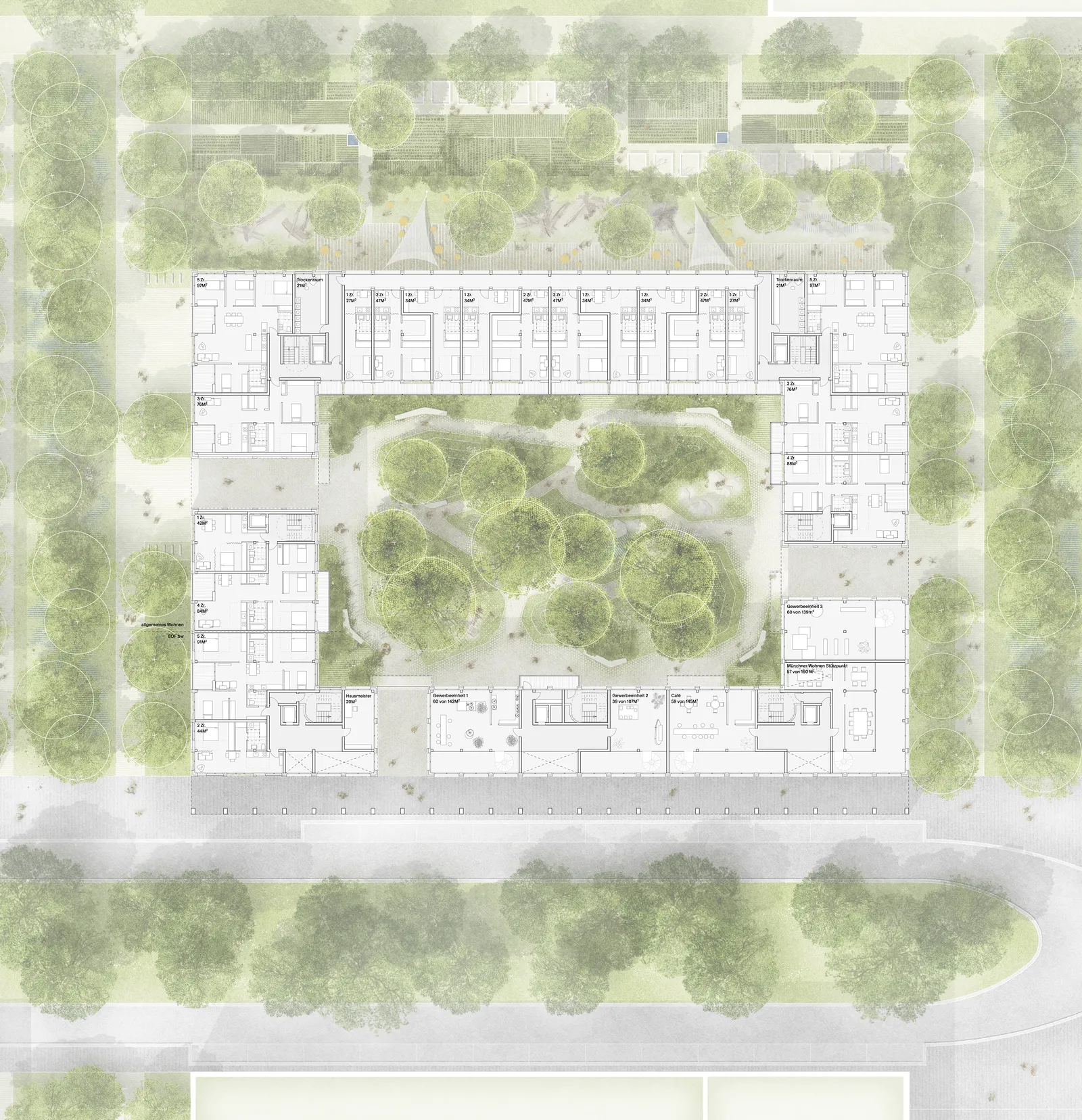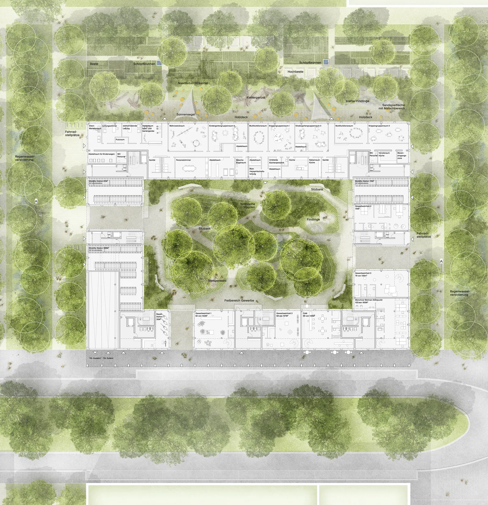 Flexible Gewerbeflächen im Erdgeschoss sorgen für ein lebendiges Quartier, das durch nachhaltige Bauweise und ökologische Materialien zukunftsfähig bleibt. Die Kombination aus Mehrspänner- und Laubengang-Typologie, die vorwiegend durchgesteckte Wohnungstypen ermöglicht, schafft offene und funktionale Grundrisse, die flexibel auf die unterschiedlichen Bedürfnisse der Bewohner eingehen.