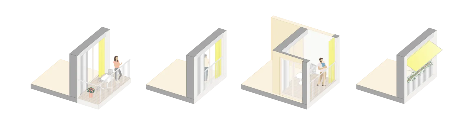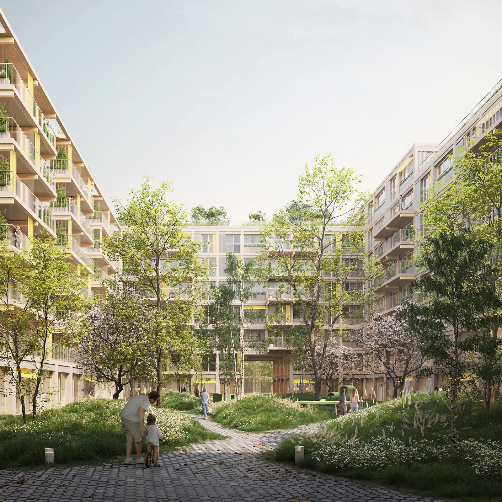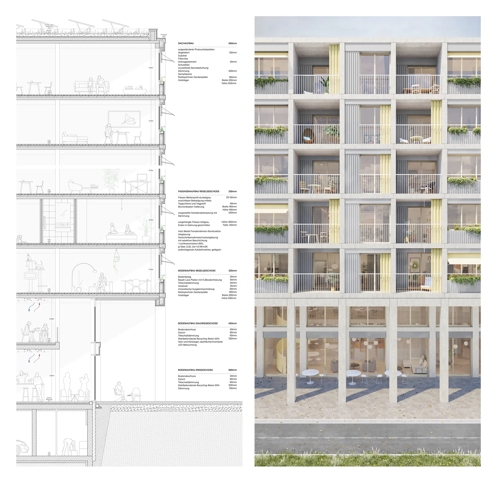 Durch vertikale Elemente; die Loggien, Balkone und französische Fenster sowie horizontale Elemente; die Pflanztrog-Elemente entsteht außerdem ein lebendiges und identitätsstiftendes Erscheinungsbild. Das Projekt vereint nachhaltige Architektur, flexible Nutzungskonzepte und eine starke Gemeinschaftsorientierung, um einen zukunftsweisenden, lebendigen Stadtteil zu schaffen.