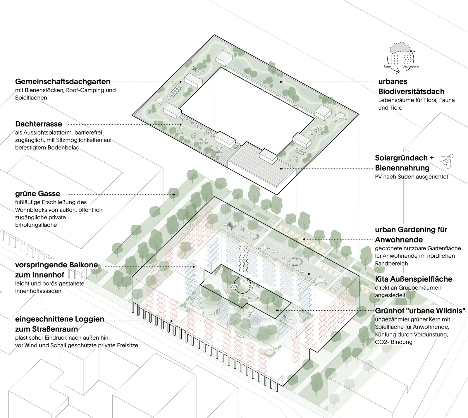 Ein zentrales Element des Gebäudes ist die Adressbildung durch Außenflächen. Der begrünte Innenhof, nach dem Konzept „Urbane Wildnis“ gestaltet, bietet sowohl offene als auch geschützte Aufenthaltsbereiche. Ein Dachgarten fördert die Biodiversität und schafft Raum für kleine Veranstaltungen, während Urban Gardening zur Selbstversorgung beiträgt.