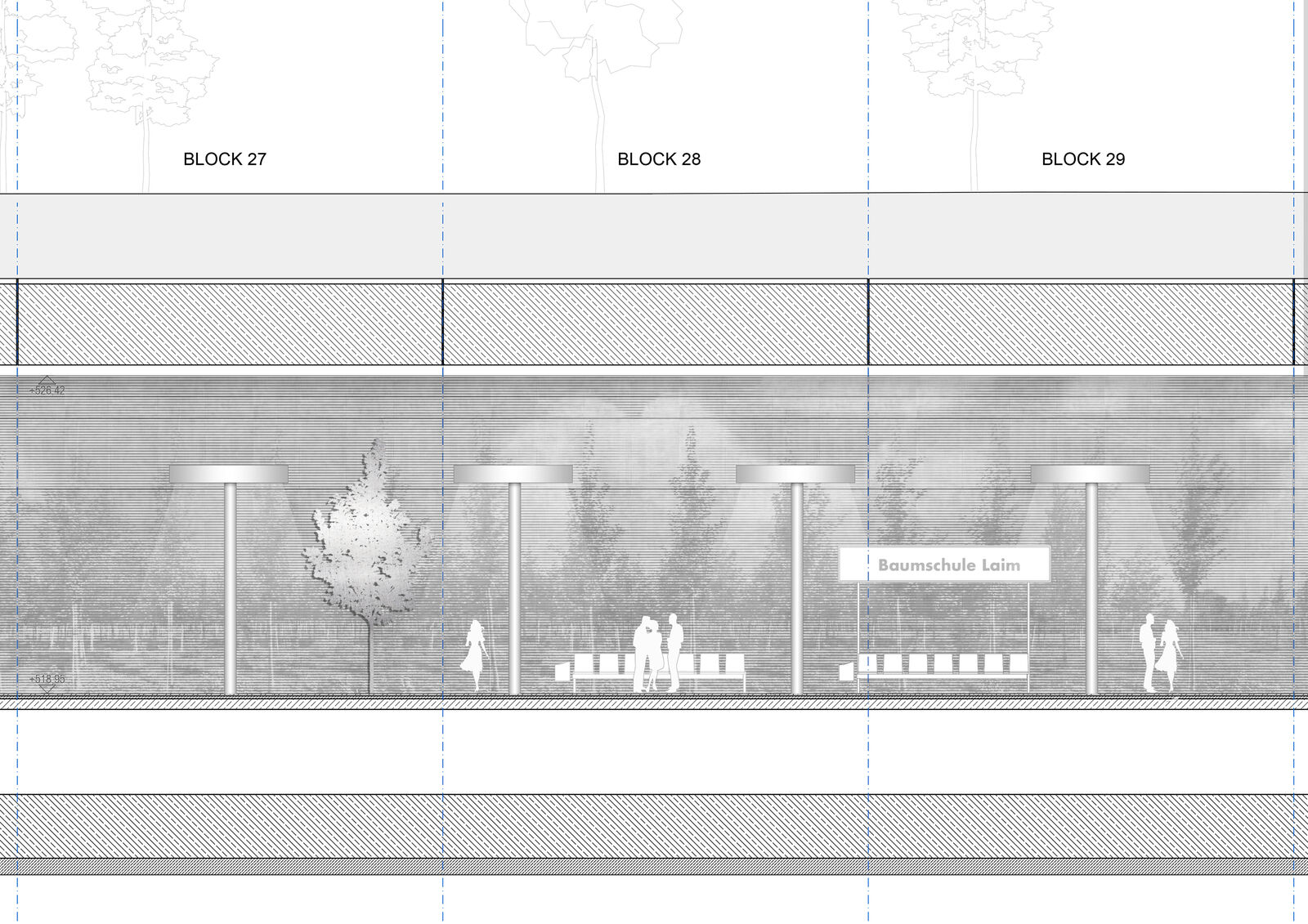 Die Baumschule zeichnet sich durch eine große Baumartenvielfalt und Biodiversität aus. Dabei prägt sie die Örtlichkeit durch die weiten Felder von akkuraten Reihen verschiedener Jungbäume, die durch Alleen großer Bäume miteinander verbunden werden. Auch die Anzucht von widerstandsfähigen Klimabäumen für das Münchner Stadtgrün ist bereits ein wichtiger und fester Bestandteil der Arbeit – die Baumschule Laim ein Genius Loci, ein Narrativ des architektonischen Entwurfes.