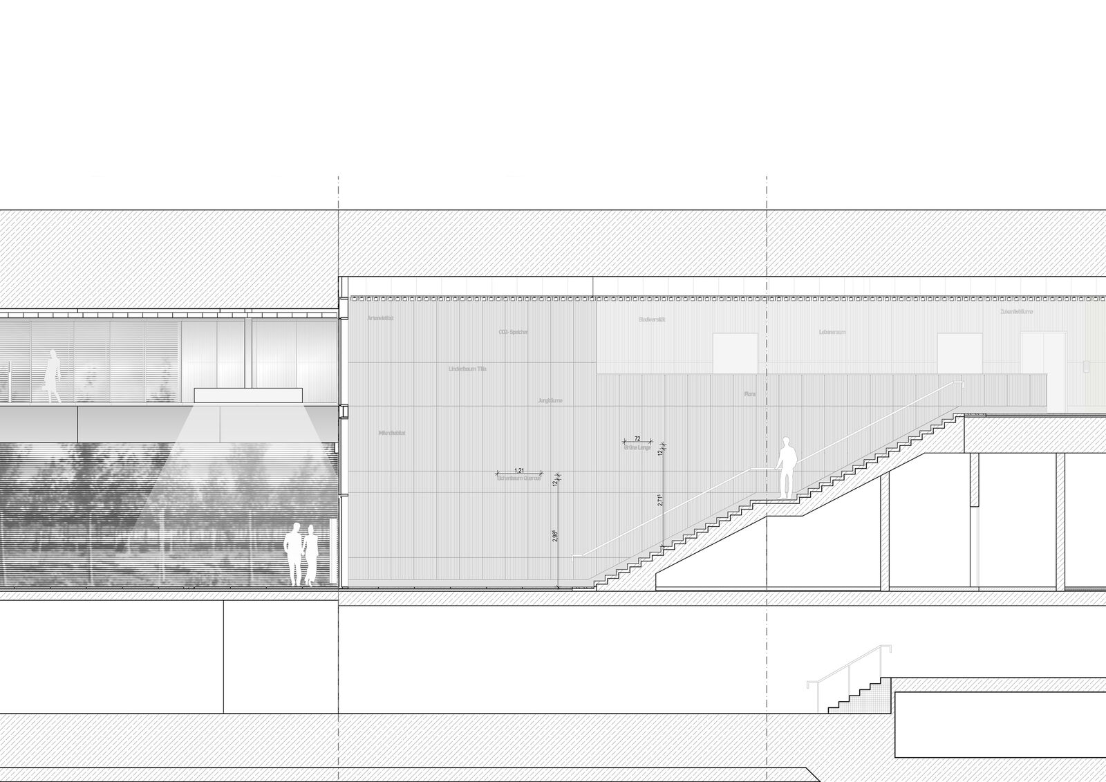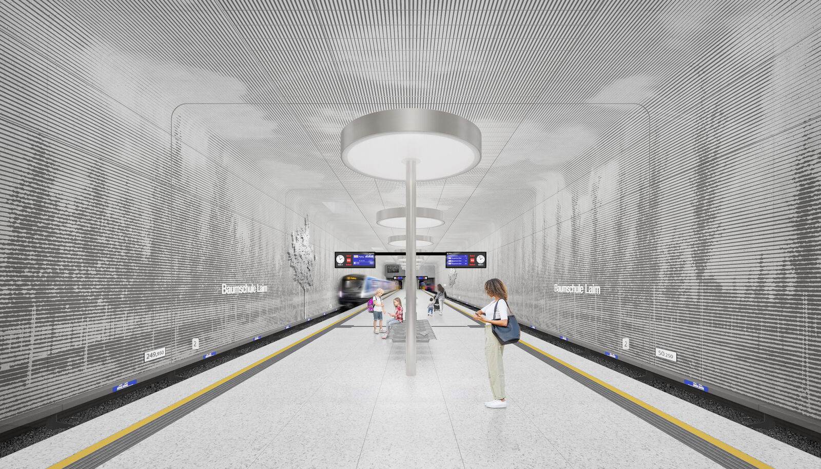 Während in der Verteilerebene die Gestaltung subtil an das Narrativ der Baumschule und ihrer Strukturen erinnert, zeigt sich der Bahnsteig als großer heller Raum mit einem realen Abbild der Baumschule, das sich als Lasur auf der rohen Sichtbetonfläche dreidimensional über Wände und Decke erstreckt. Baumreihen säumen den Weg, szenisches Licht über schlichte, elegante und sich zurücknehmende Leuchten sorgen für eine gleichmäßige Ausleuchtung und natürliche Atmosphäre.