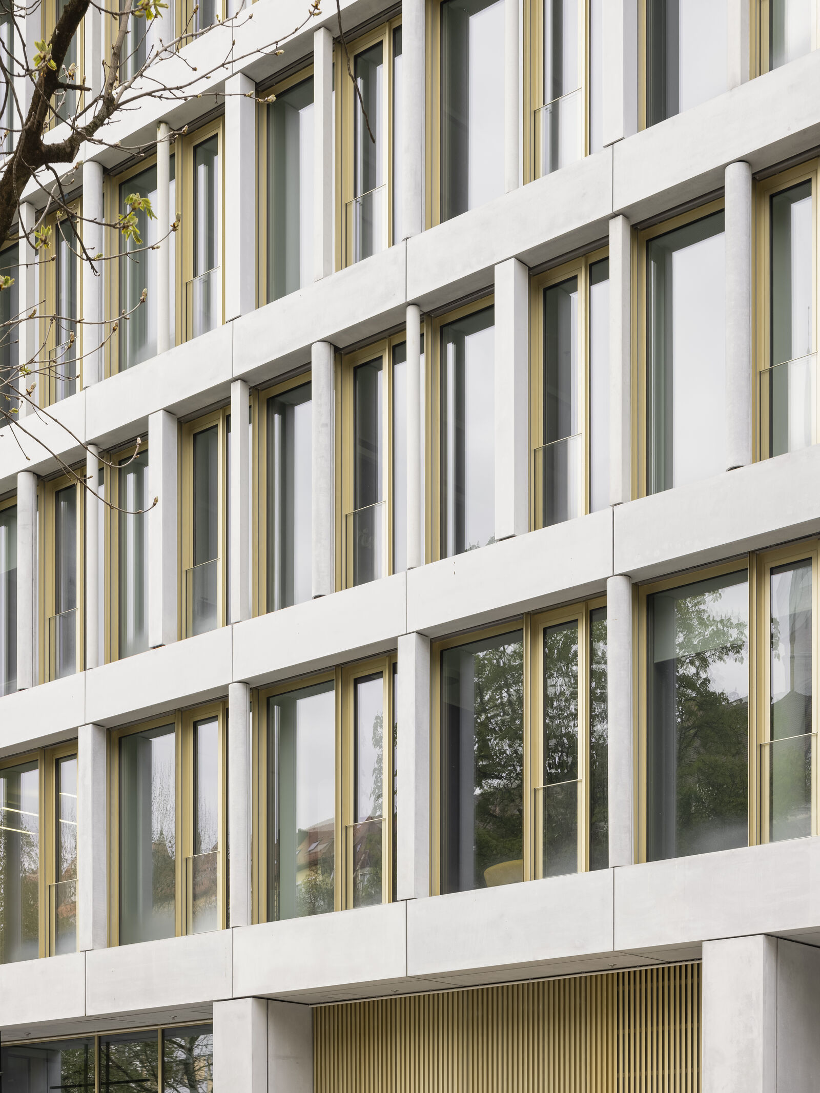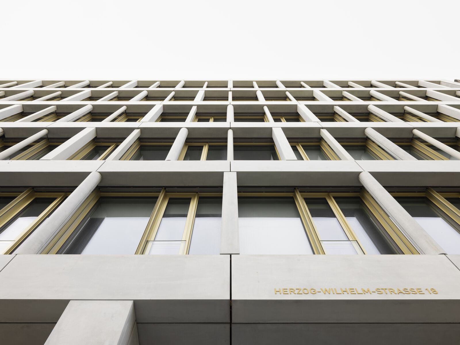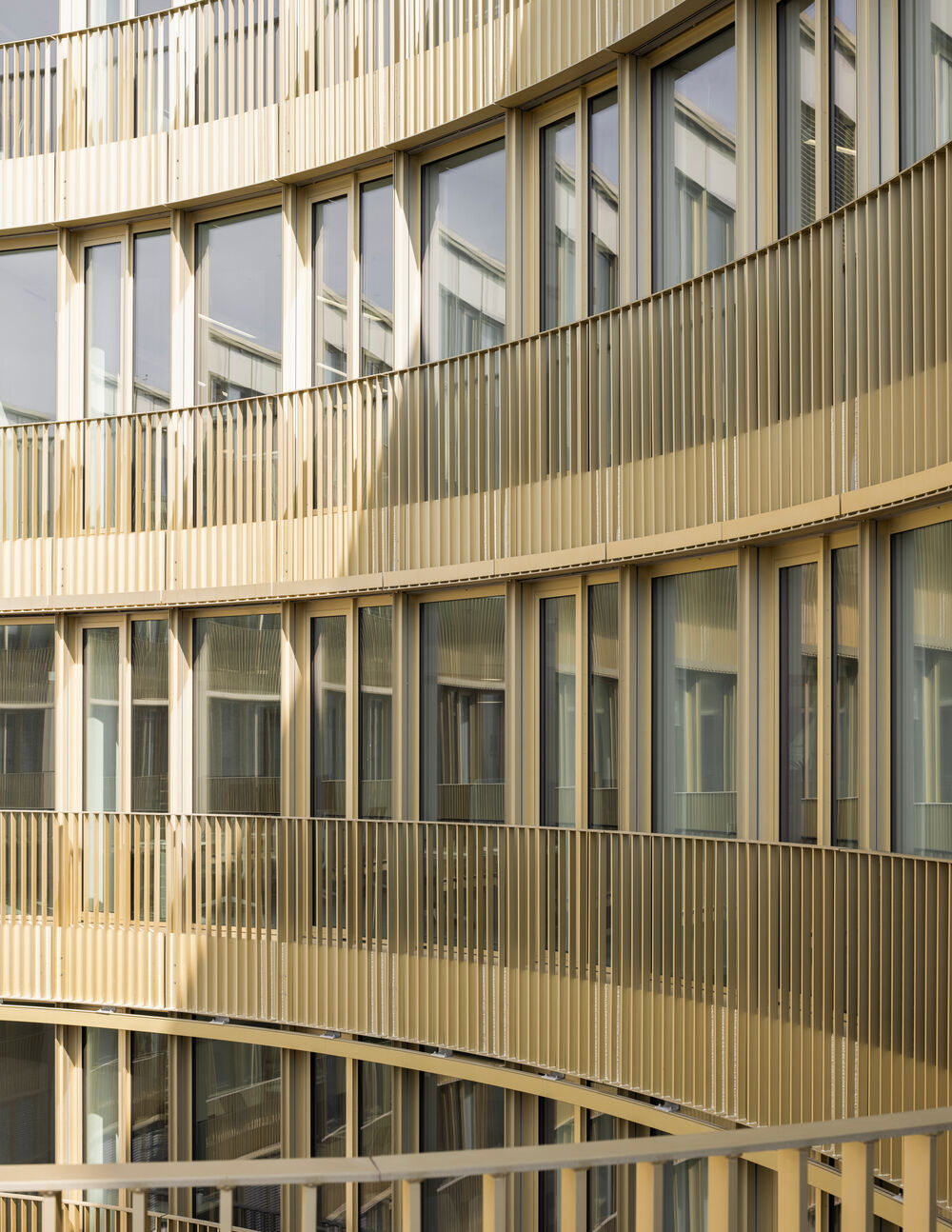 Die äußere Hülle der Fassade kann zur individuellen Lüftung nach außen gefaltet werden. Durch die unterschiedlich weit geöffneten Außenflügel wechselt die Hauptfassade ständig ihr Erscheinungsbild. Diese Vielschichtigkeit wird durch die verwendeten Materialien noch verstärkt. Messingfarbige Metallprofile im zurückgesetzten Erd- und Dachgeschoss sowie in der Fassade des Innenhofes, bilden einen Kontrast zum hellgrauen Beton der Außenhülle des Gebäudes.