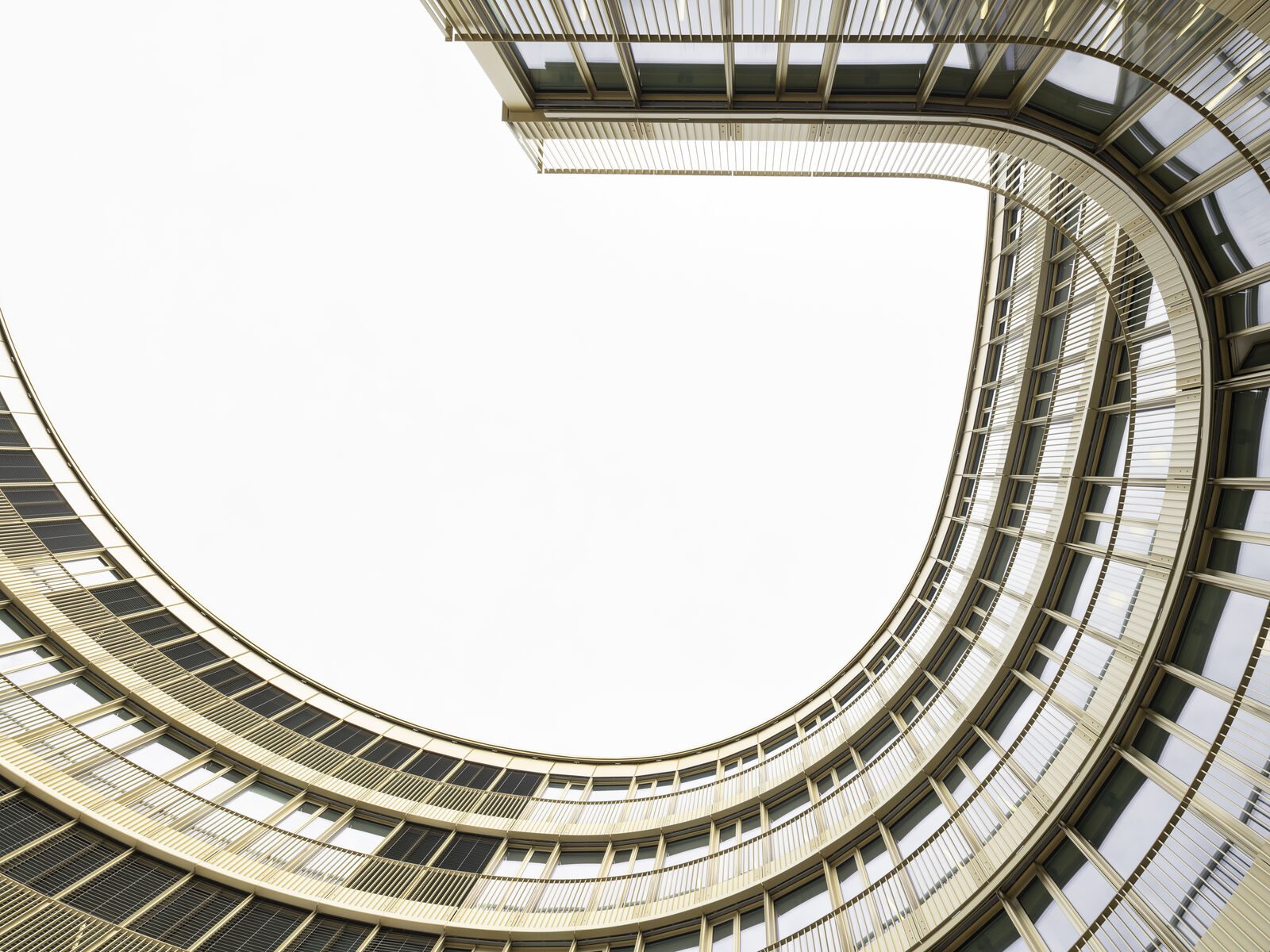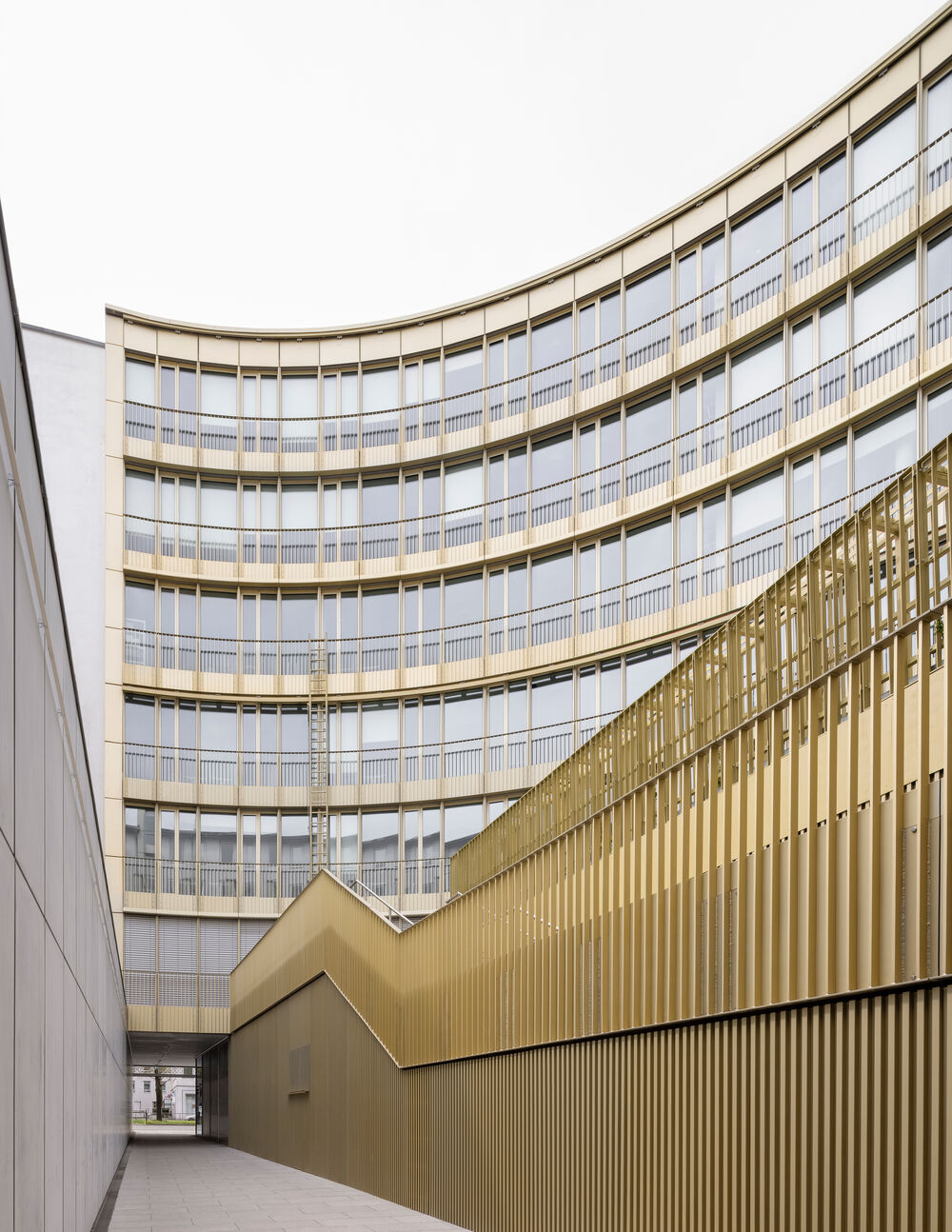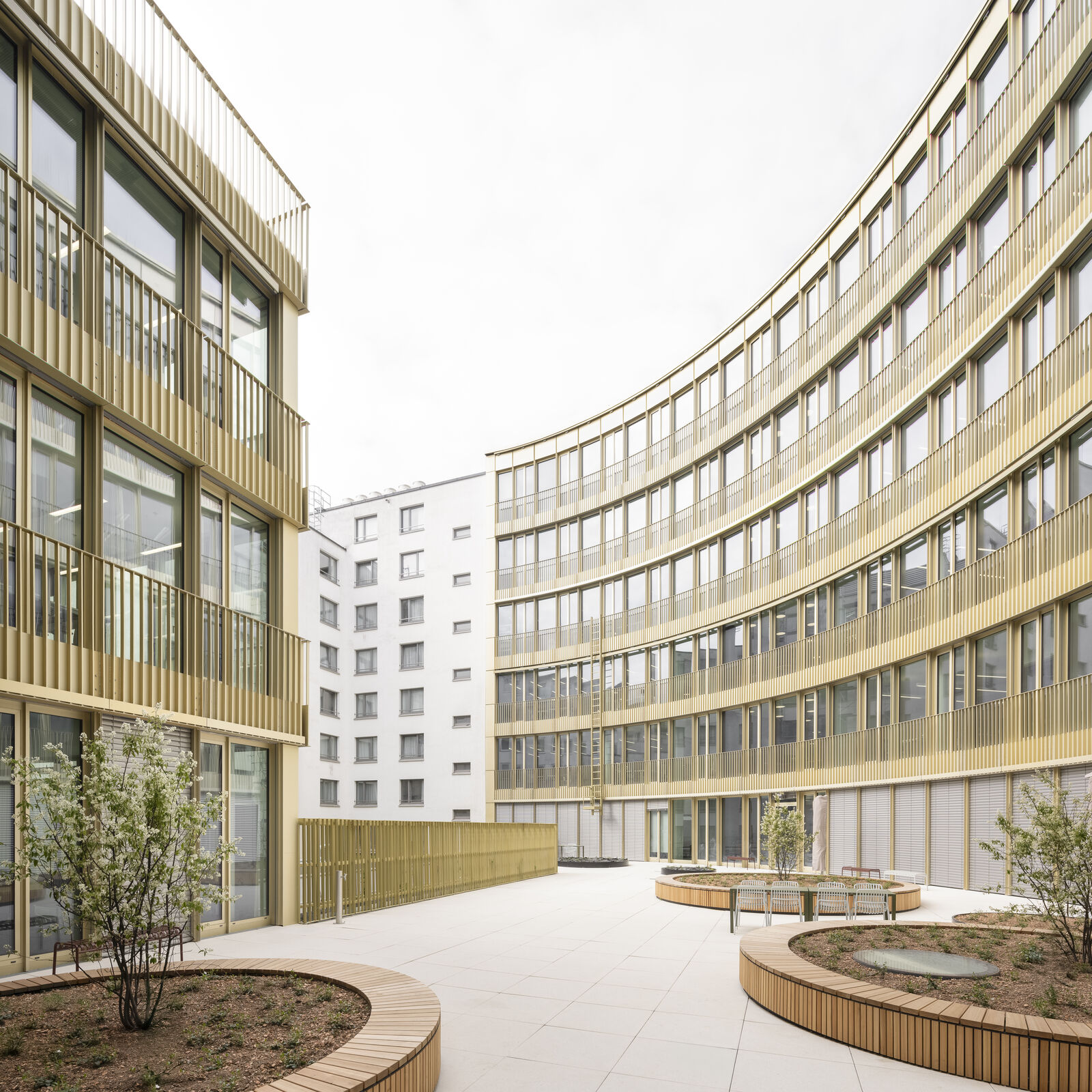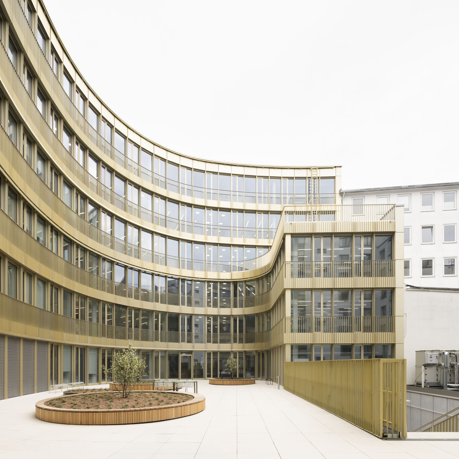 Das Gebäude arrondiert sich als C-förmige Kubatur um den großen Innenhof und sorgt so ganzjährig für eine maximale Ausnutzung des Sonnenlichtes. Für das Klimakonzept wurde der Verlauf der Sonne und die tatsächliche Lichteinstrahlung auf die Fassade genauestens analysiert. Sonnen-, Blendschutz- und Kühlsysteme sorgen für eine angenehme Verschattung und Kühlung der Räume in den Sommermonaten.