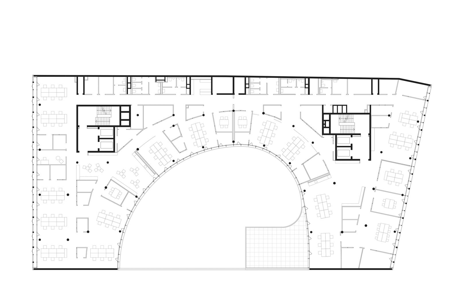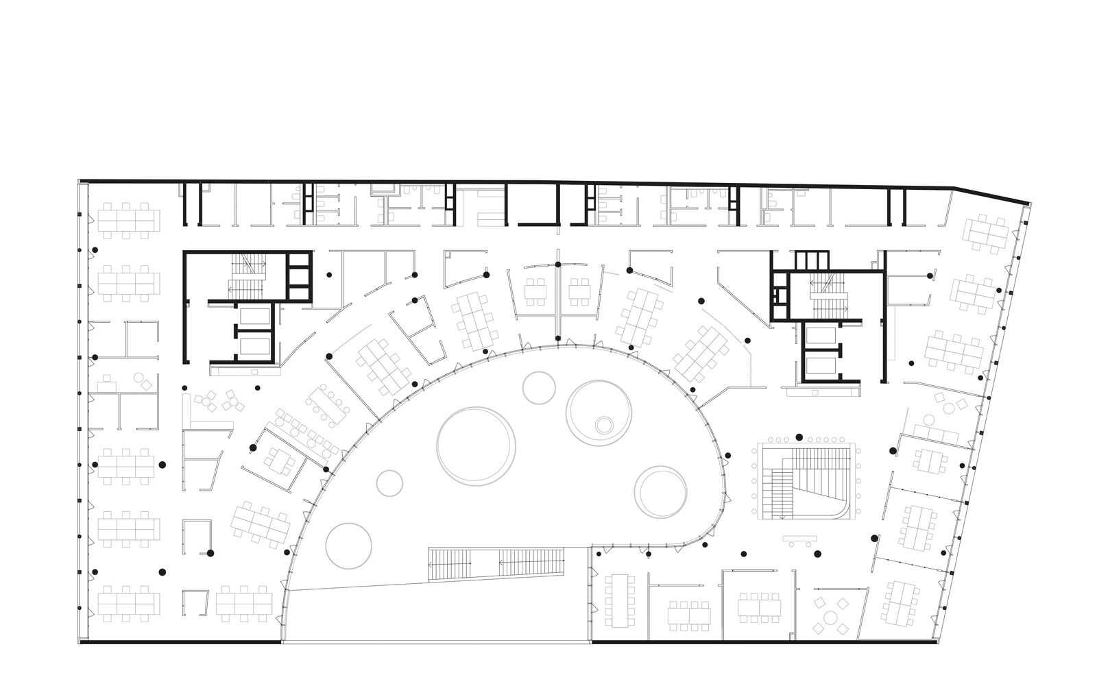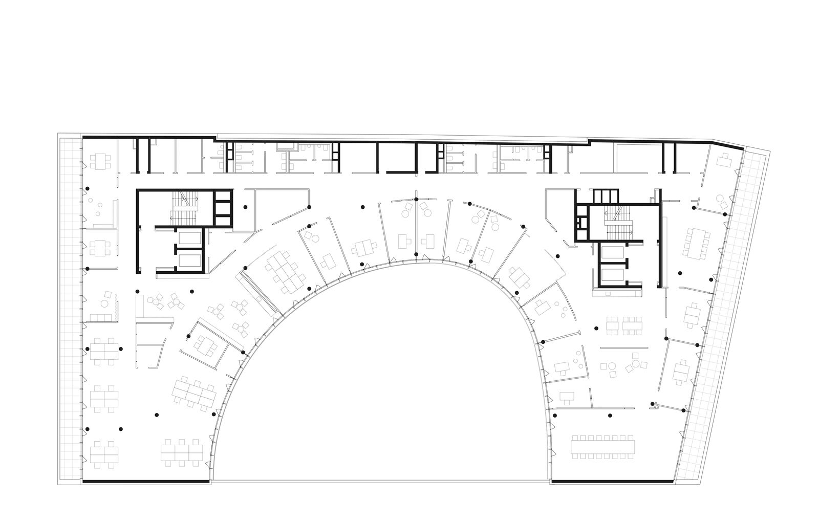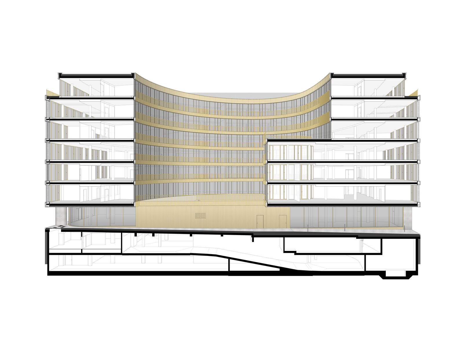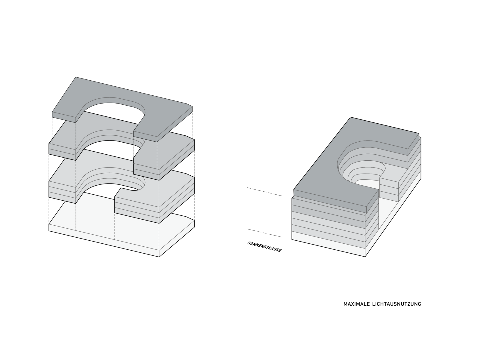 Das Gebäude arrondiert sich als C-förmige Kubatur um den großen Innenhof und sorgt so ganzjährig für eine maximale Ausnutzung des Sonnenlichtes. Für das Klimakonzept wurde der Verlauf der Sonne und die tatsächliche Lichteinstrahlung auf die Fassade genauestens analysiert. Sonnen-, Blendschutz- und Kühlsysteme sorgen für eine angenehme Verschattung und Kühlung der Räume in den Sommermonaten.