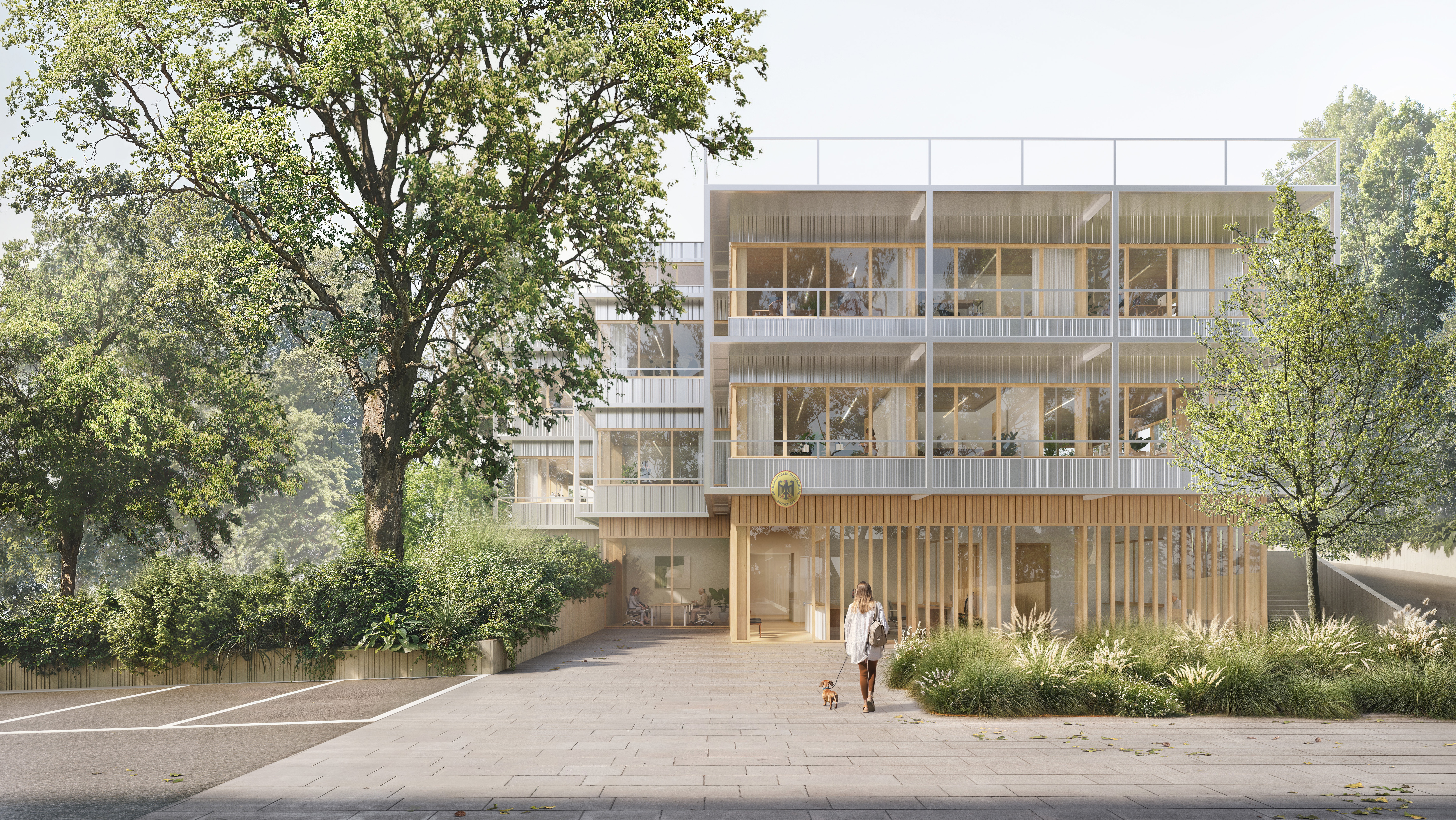 Während das Hanggeschoss mit seinen erdberührten Bauteilen als robuste Stahlbetonkonstruktion ausgeführt wird, entstehen die darüberliegenden Geschosse in ökologisch und gestalterisch hochwertiger Holzbauweise. Diese Kombination vereint statische Effizienz mit einer ressourcenschonenden Bauweise und schafft zugleich Räume von hoher ästhetischer und atmosphärischer Qualität. So entstehen gesunde, inspirierende und attraktive Arbeits- und Lebenswelten, die den hohen funktionalen und repräsentativen Ansprüchen der Botschaft gerecht werden.