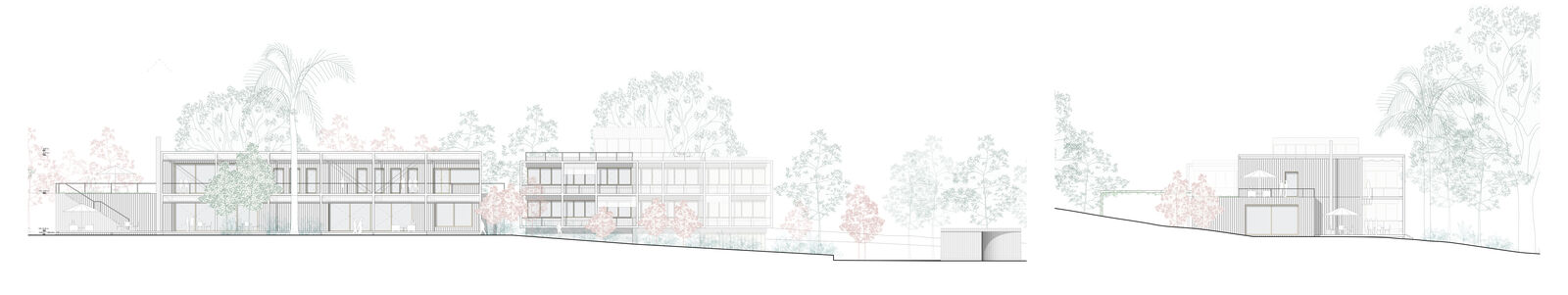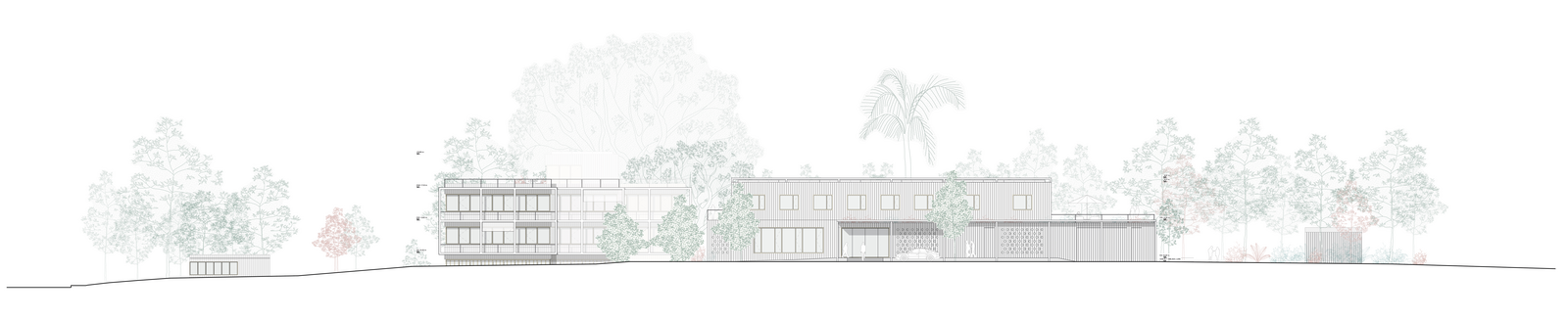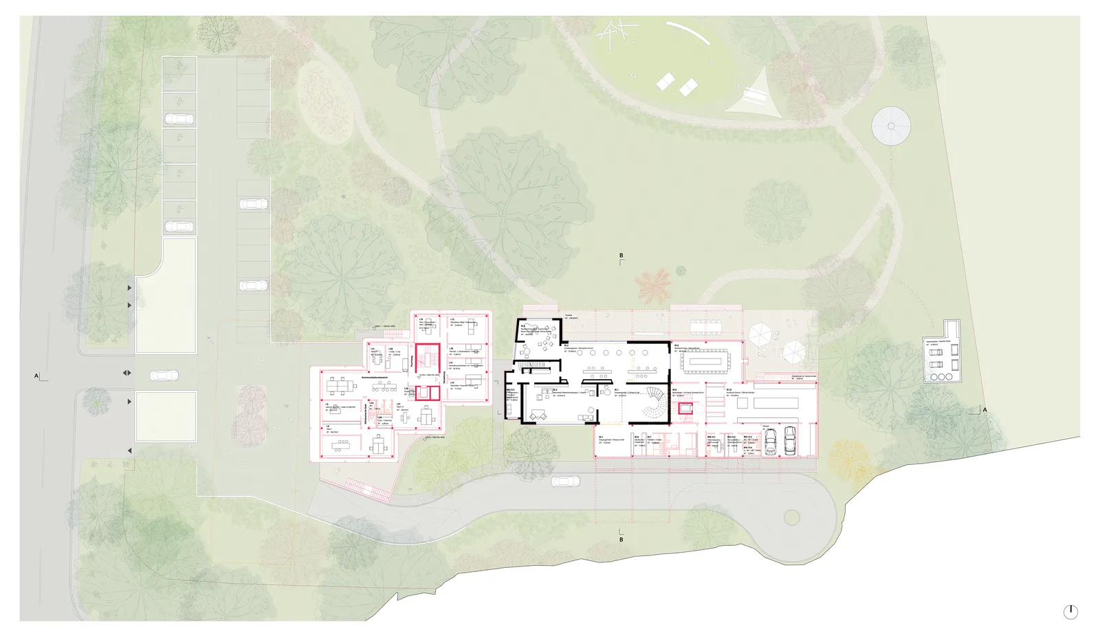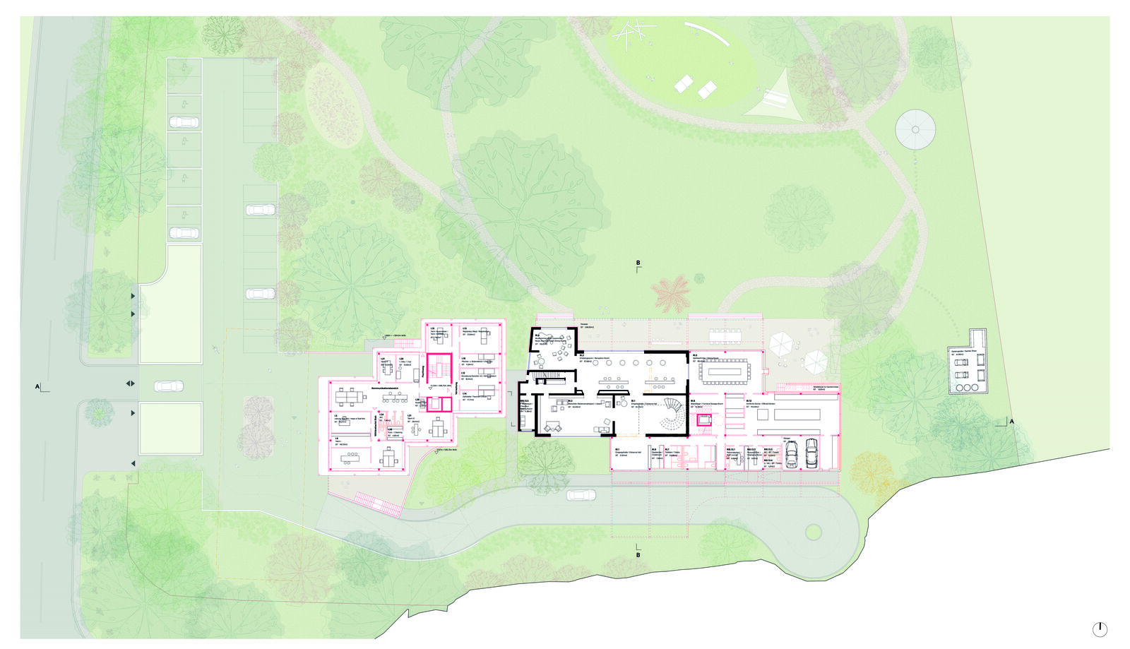 Ein besonderer Fokus liegt auf der Minimierung versiegelter Flächen. Der parkähnliche Garten soll als zentrales Gestaltungselement erhalten und in seiner Qualität gestärkt werden. Ziel ist es, durch behutsame Eingriffe und den Erhalt möglichst vieler Bestandsstrukturen nicht nur den Charakter des Ortes zu bewahren, sondern auch graue Energie effizient zu nutzen. Die Gebäude orientieren sich folgerichtig in Nord-Süd-Richtung, um sowohl energetisch als auch funktional optimale Bedingungen zu schaffen.