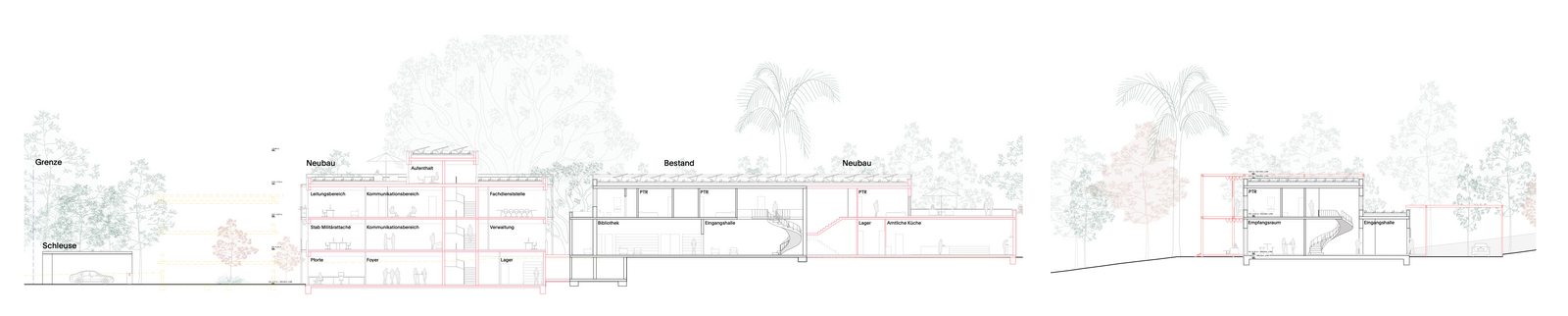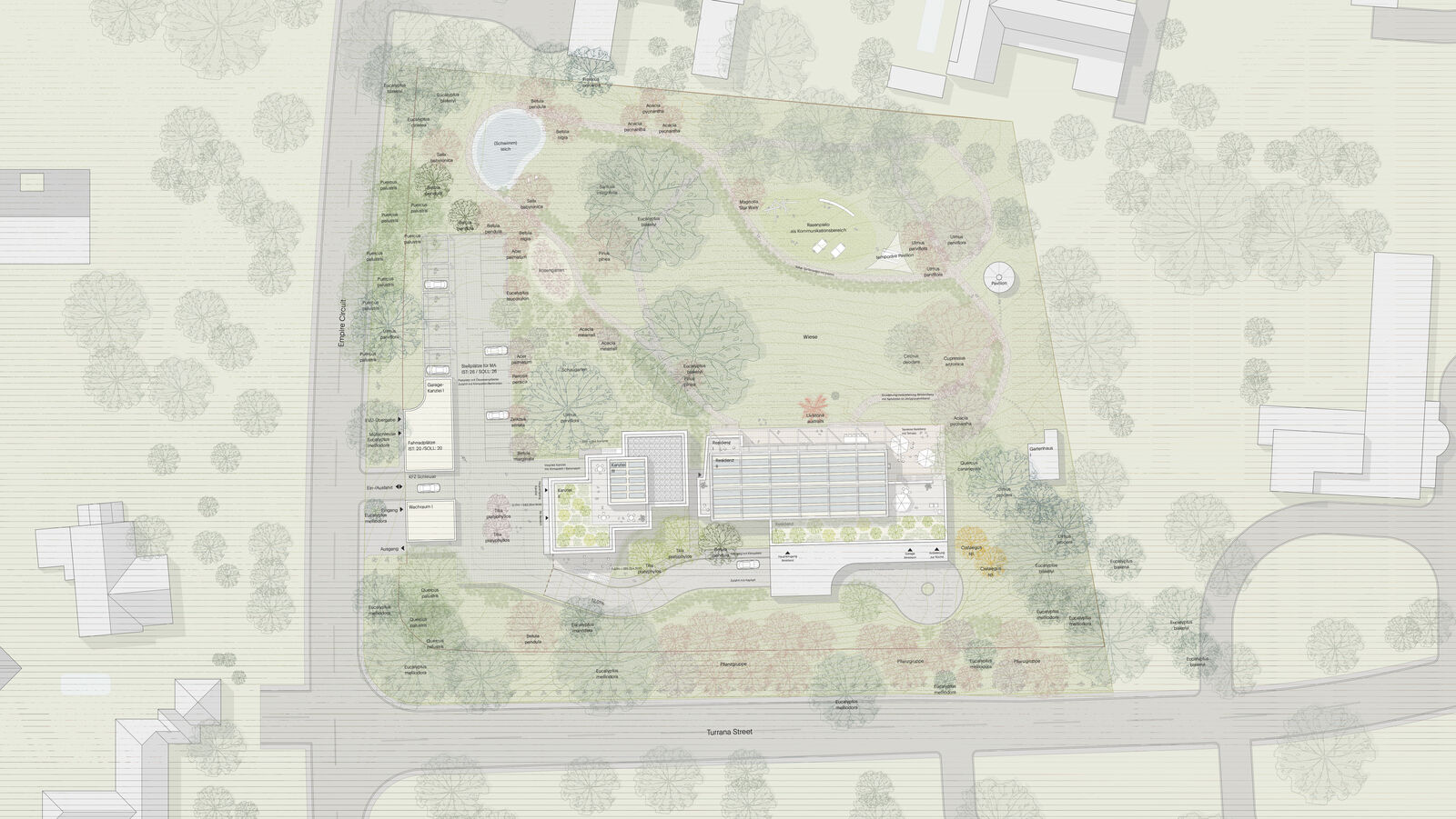 Auf dem Grundstück an der Ecke Empire Circuit/Turrana Road sollen die Kanzlei und die Residenz für die Deutsche Botschaft in Canberra, Australien, neu errichtet werden. Aktuell stehen dort Gebäude, die im Jahr 1958 errichtet wurden. Ein Abriss und Neubau der Kanzlei sowie eine Instandsetzung bzw. ein teilweiser Erhalt des Residenzgebäudes werden als nachhaltigste und wirtschaftlichste Lösung erachtet. Zentrales Ziel des städtebaulichen Konzepts ist die sensible Einbindung der neuen Baukörper in die bestehende Umgebung. Die starke, landschaftlich geprägte Topografie des Grundstücks sowie der wertvolle, teils jahrzehntealte Baumbestand bilden den Ausgangspunkt der Entwurfsüberlegungen. Diese natürlichen Gegebenheiten werden nicht als Einschränkungen, sondern als identitätsstiftende Elemente verstanden, die maßgeblich die Positionierung und Ausformulierung der Bauvolumina prägen.