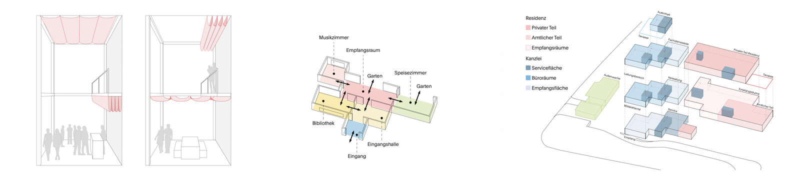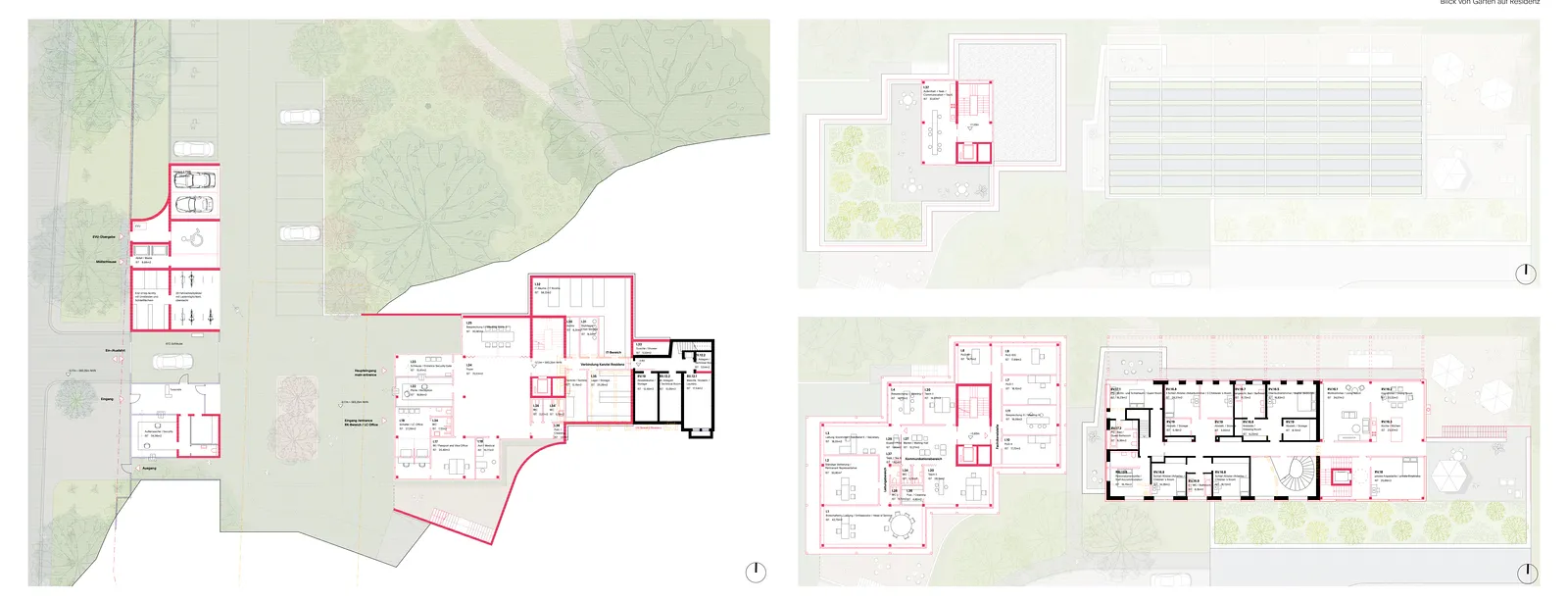 Durch die bewusste Konzentration der Baukörper im südlichen Grundstücksbereich werden die Flächen für Verkehrs- und Erschließungswege deutlich reduziert. Die neue Kanzlei wird so platziert, dass deren Errichtung und Inbetriebnahme bereits während des Rückbaus der bestehenden Bebauung möglich ist. Die entstehende Baugrube wird in das Konzept integriert: Hier entstehen ein neuer Vorplatz sowie der Zugang zur Kanzlei unterhalb des Erdgeschosses der Residenz. Die neue Kanzlei selbst wird als zweigeschossiger Bau mit ausgebautem Hanggeschoss und einem gemeinschaftlich nutzbaren Aufenthaltsbereich auf dem Dach konzipiert. Letzterer öffnet sich zu einer großzügigen Dachterrasse und bietet qualitätsvolle Räume für Pausen, Austausch und Begegnung.