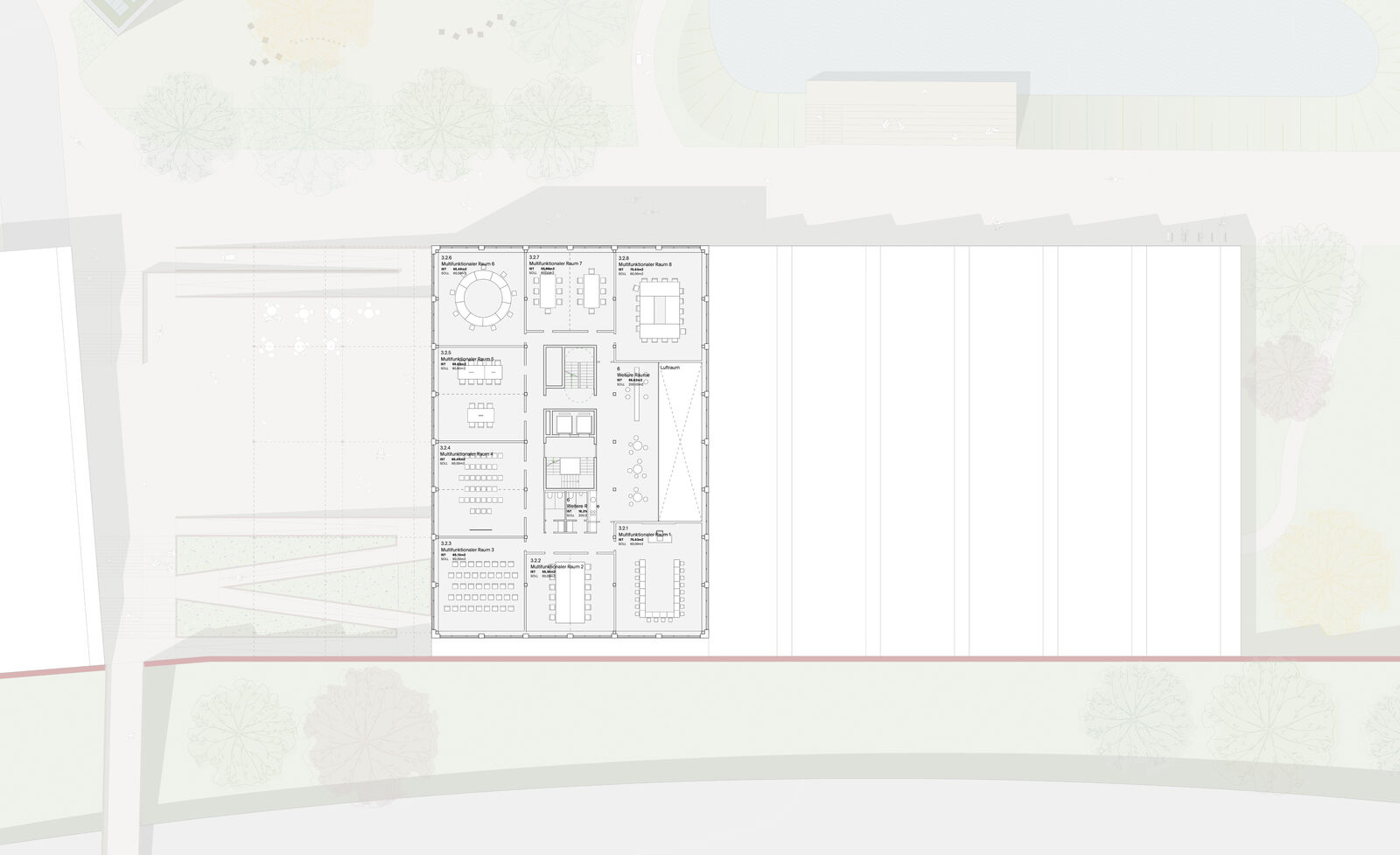 Beide Freiräume ergänzen sich funktional wie atmosphärisch: Die großzügige Promenade dient nicht nur als zentrale Erschließungsachse für den Fuß- und Radverkehr, sondern lädt mit ihrer Gestaltung auch zum Verweilen und Flanieren ein. Die Eingänge zum Schwimmbad und zum Haus der Vereine/Akademie, sowie die Kreativräume und das Innovationslabor der Akademie öffnen sich so den Besuchern und laden ein einzutreten.