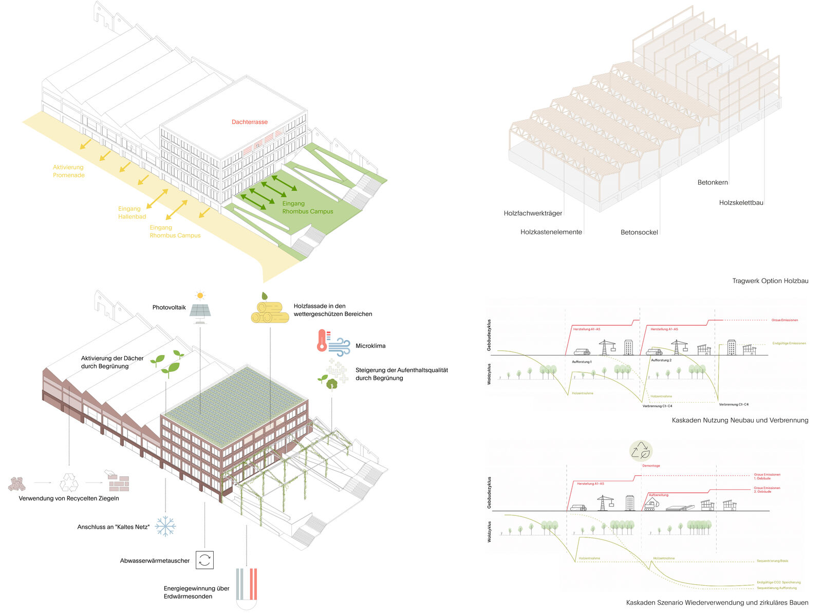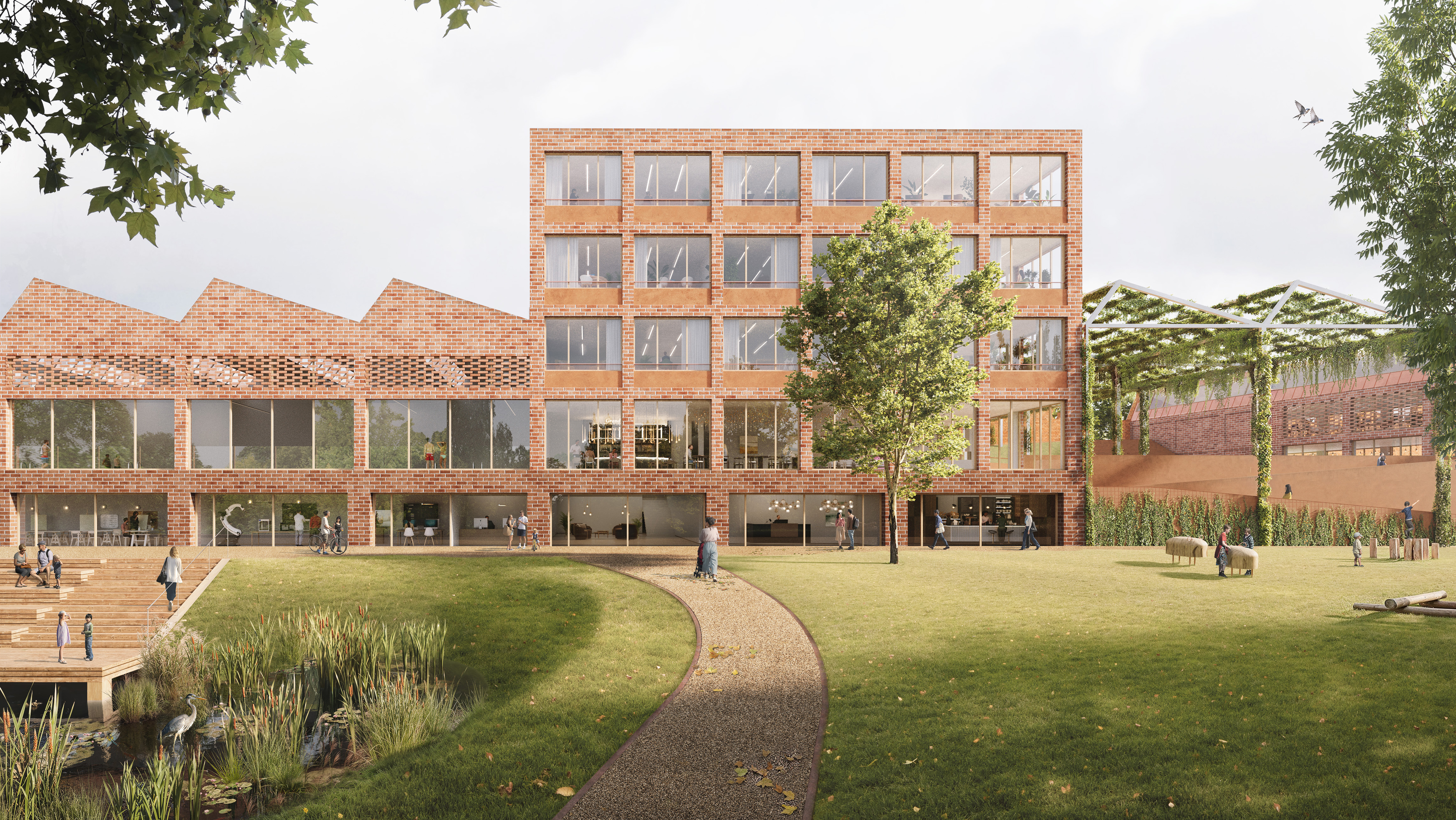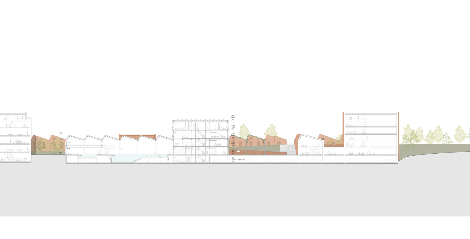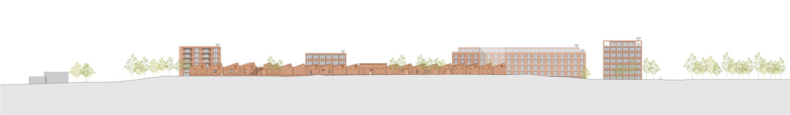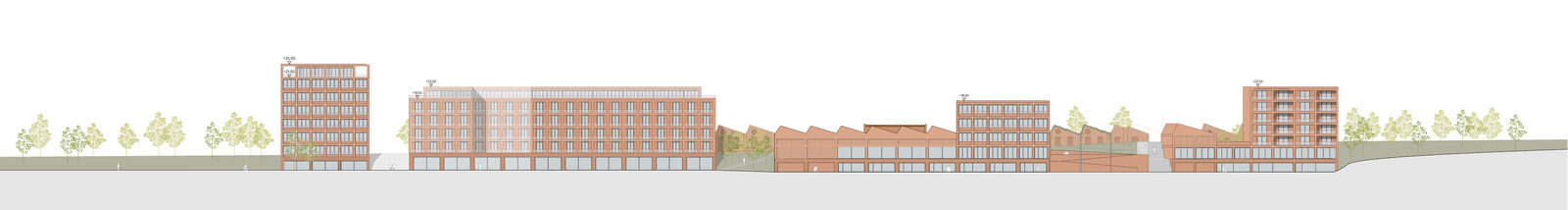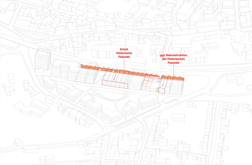 Der Entwurf greift die Materialität der historischen Shed-Fassade auf und erzeugt durch den Einsatz von Ziegeln ein harmonisches und ortstypisches Gesamtbild. Die Neubauten stehen durch eine ähnliche Materialisierung in Verbindung miteinander. Ein durchgehender, großzügig gestalteter Sockel entlang der Promenade sowie eine strukturierende Ziegelfassade in den Obergeschossen bilden verbindende architektonische Elemente, die das Ensemble visuell zusammenführen. Gleichzeitig ermöglicht die differenzierte Ausgestaltung der Fassadenfelder eine flexible Anpassung an die jeweilige Nutzung.