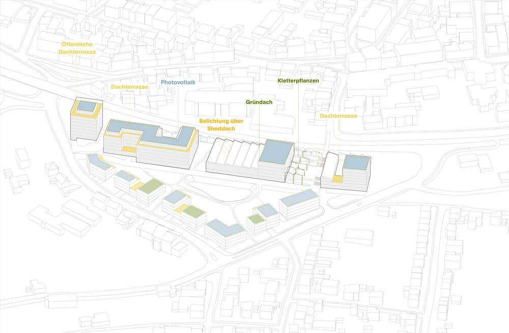 In den Zwischenräumen wird die historische Mauer immer wieder sichtbar, während an anderen Stellen architektonische Analogien geschaffen werden. Ein Beispiel dafür ist der Rhombus Campus, in dem die Schwimmhalle die charakteristische Formsprache aufgreift. Ein besonderes gestalterisches Element bildet das freistehende Stahlgerüst auf dem Quartiersplatz, das die verbleibende Shed-Fassade stützt und diese visuell bis zur Promenade weiterführt. So wird das industrielle Erbe des Areals in vielfältiger und identitätsstiftender Weise in die neue Quartiersstruktur eingebettet.