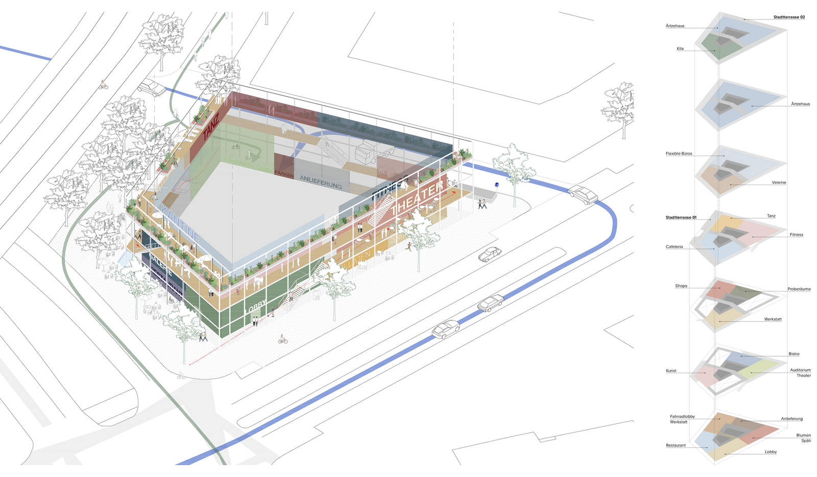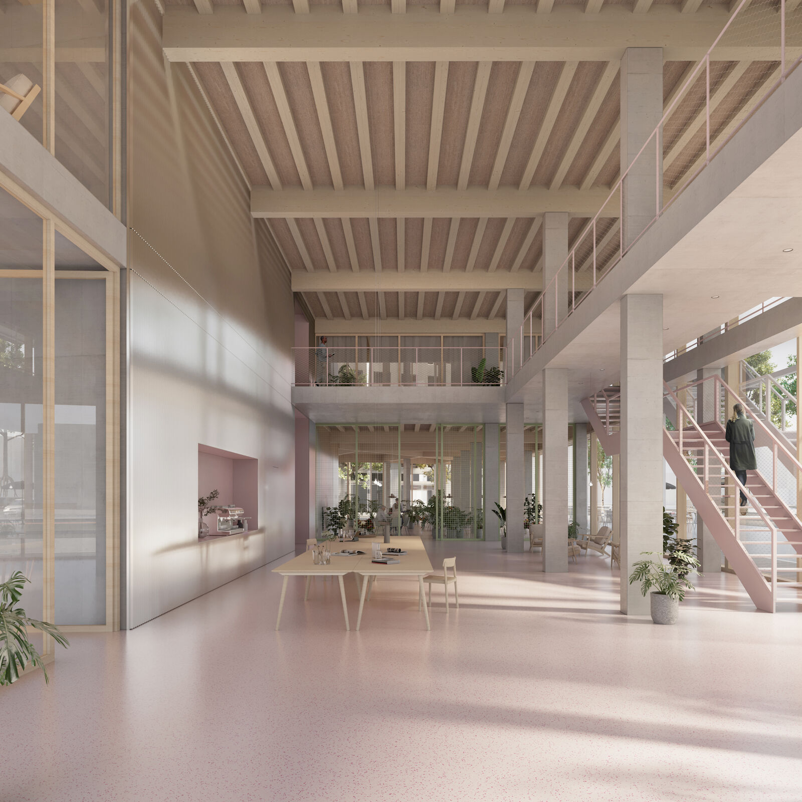 Die Fassade spiegelt ein widerstandsfähiges und anpassungsfähiges Gerüst wider, das Photovoltaik-Panele, Grünflächen und öffentliche Annehmlichkeiten aufnimmt und über seine gesamte Höhe verteilt. Das Nutzungskonzept des Gebäudes folgt einem multifunktionalen Ansatz mit einer ausgewogenen Verteilung zwischen kommerziellen und nicht-kommerziellen Räumen, um vielfältigen Gemeinschaftsbedürfnissen gerecht zu werden.