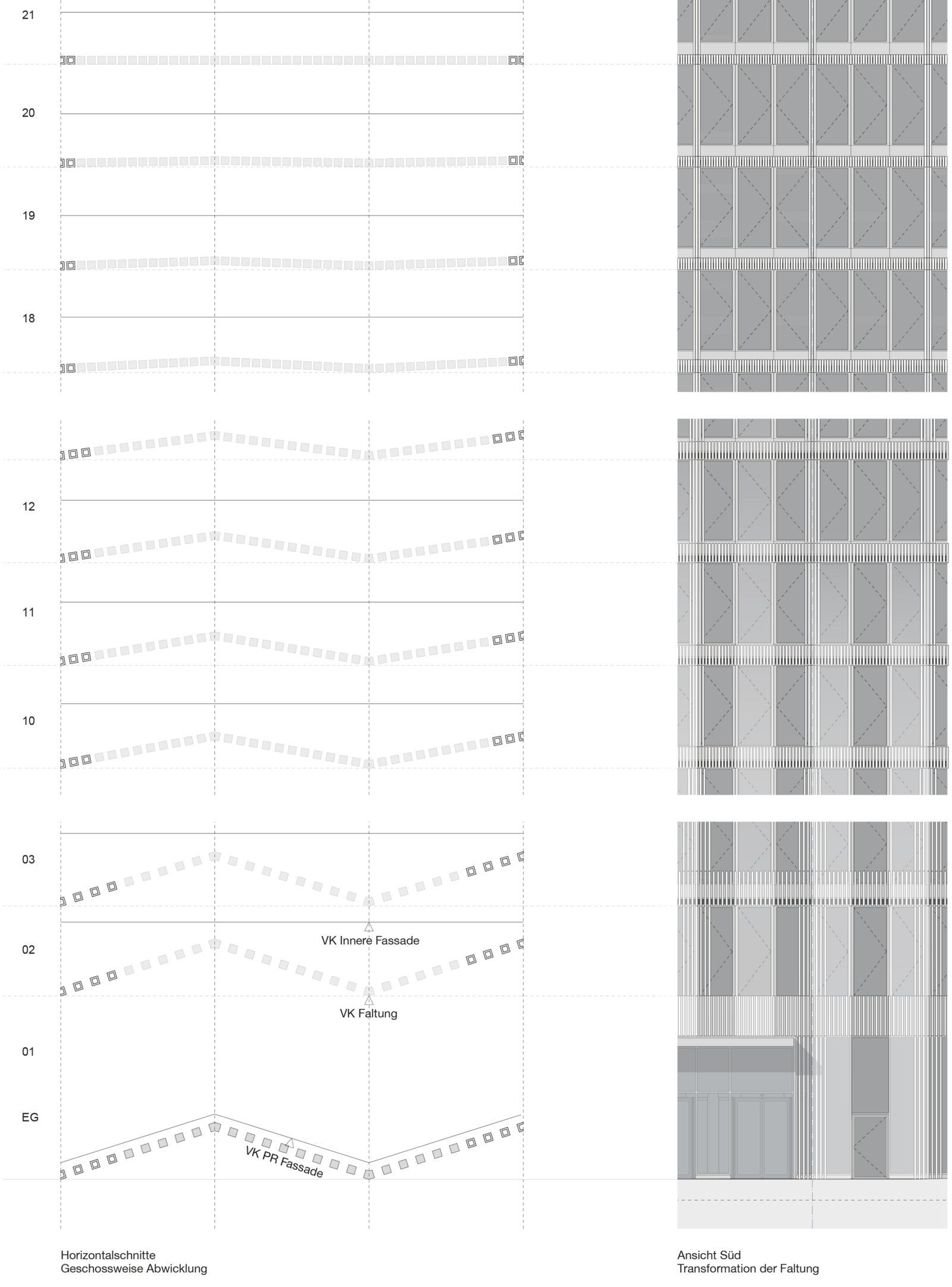 Zudem faltet sich die Fassade in den unteren Bereichen und wird im Verlauf nach oben glatt. Das Gebäude öffnet sich nach oben hin, indem sich der Vorhang aus hellen Aluminiumstäben in den oberen Geschossen bei gleichzeitiger Verdichtung der Stäbe optisch aufzieht und einen Panoramablick über Berlin ermöglicht.