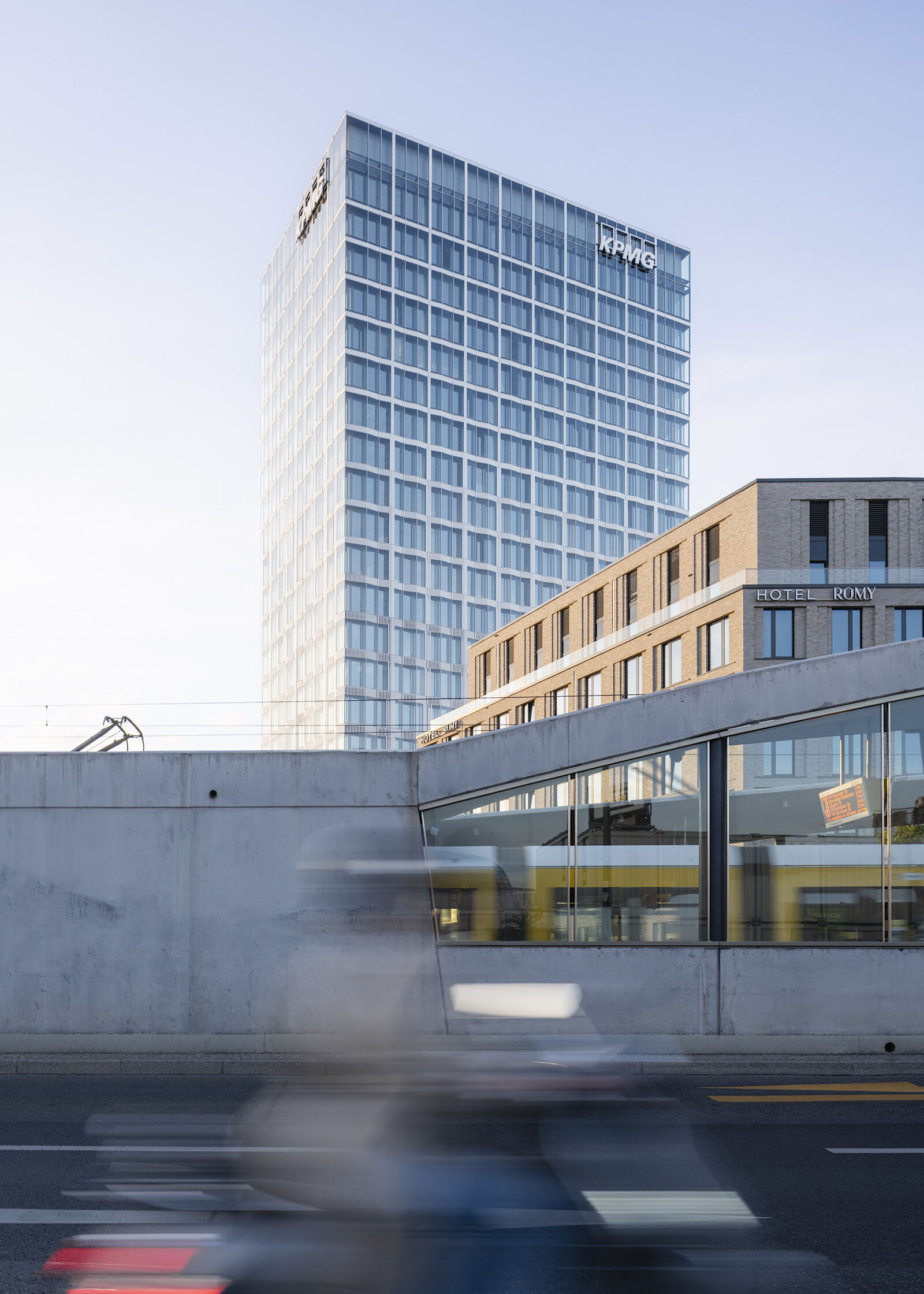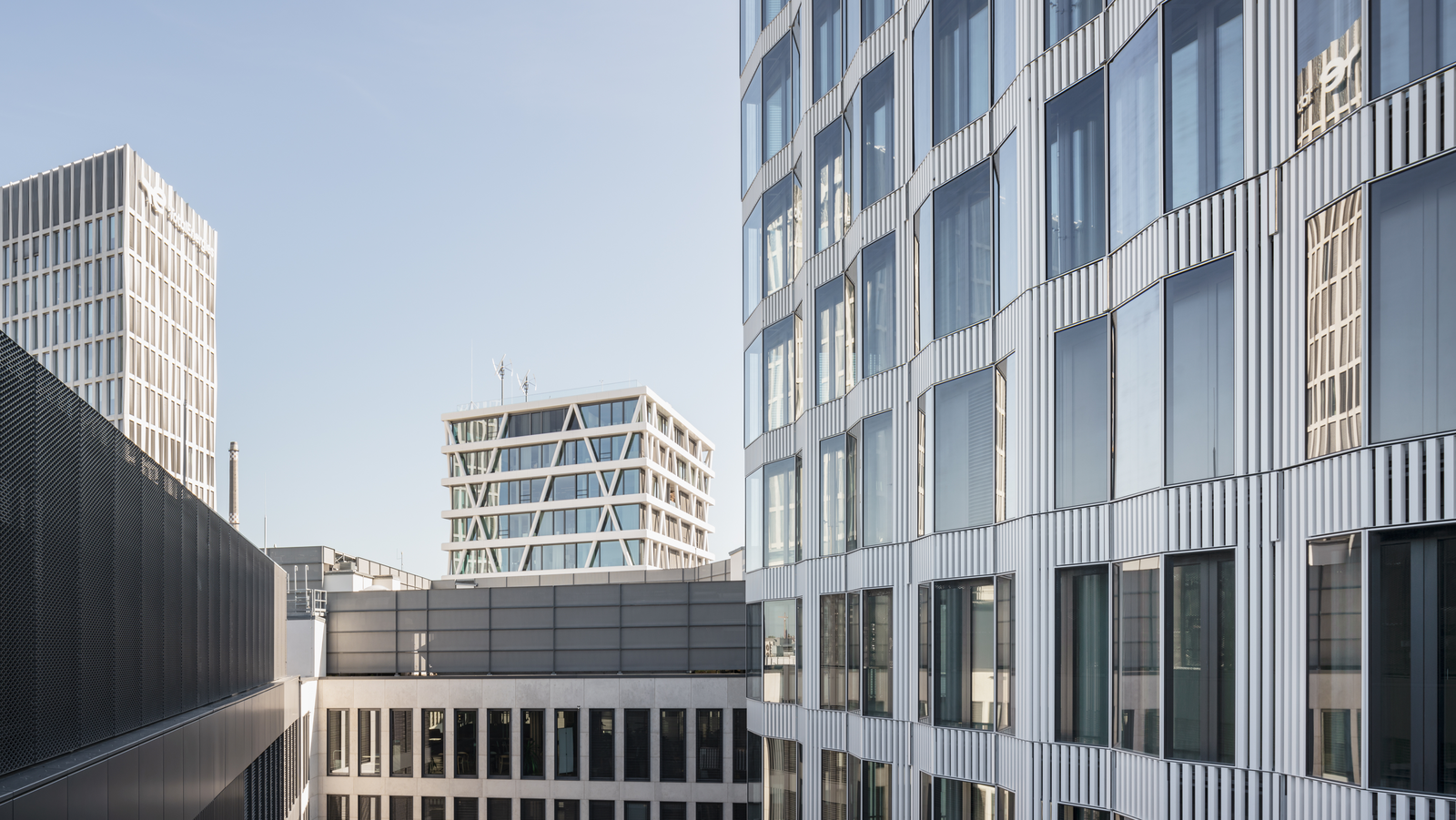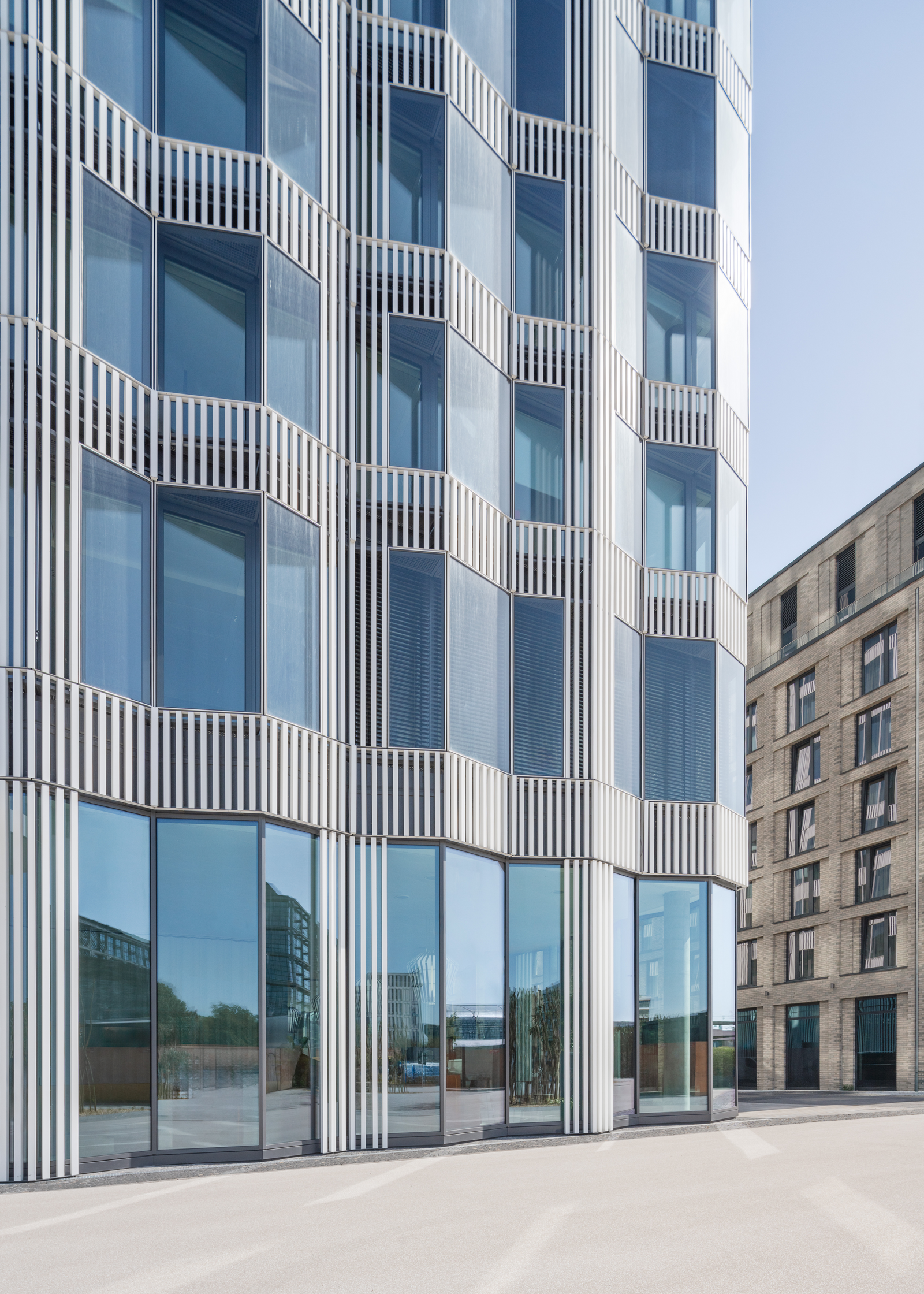 Das Hochhaus fungiert als prominentes Entrée in das neue Quartier Europacity in Berlin und bildet mit den bestehenden Hochhäusern einen profilbildenden Dreiklang. In seiner äußeren Erscheinung bezieht das Gebäude selbstbewusst Position und tritt in Dialog mit den beiden anderen Türmen. Während die Struktur des Total Tower von vertikalen Betonelementen bzw. die des 50-Hertz-Gebäudes durch horizontale Metallbänder geprägt ist, spielt das neue Gebäude mit der Gliederung durch ein ungerichtetes Raster aus sich verdichtenden Aluminiumstäben.