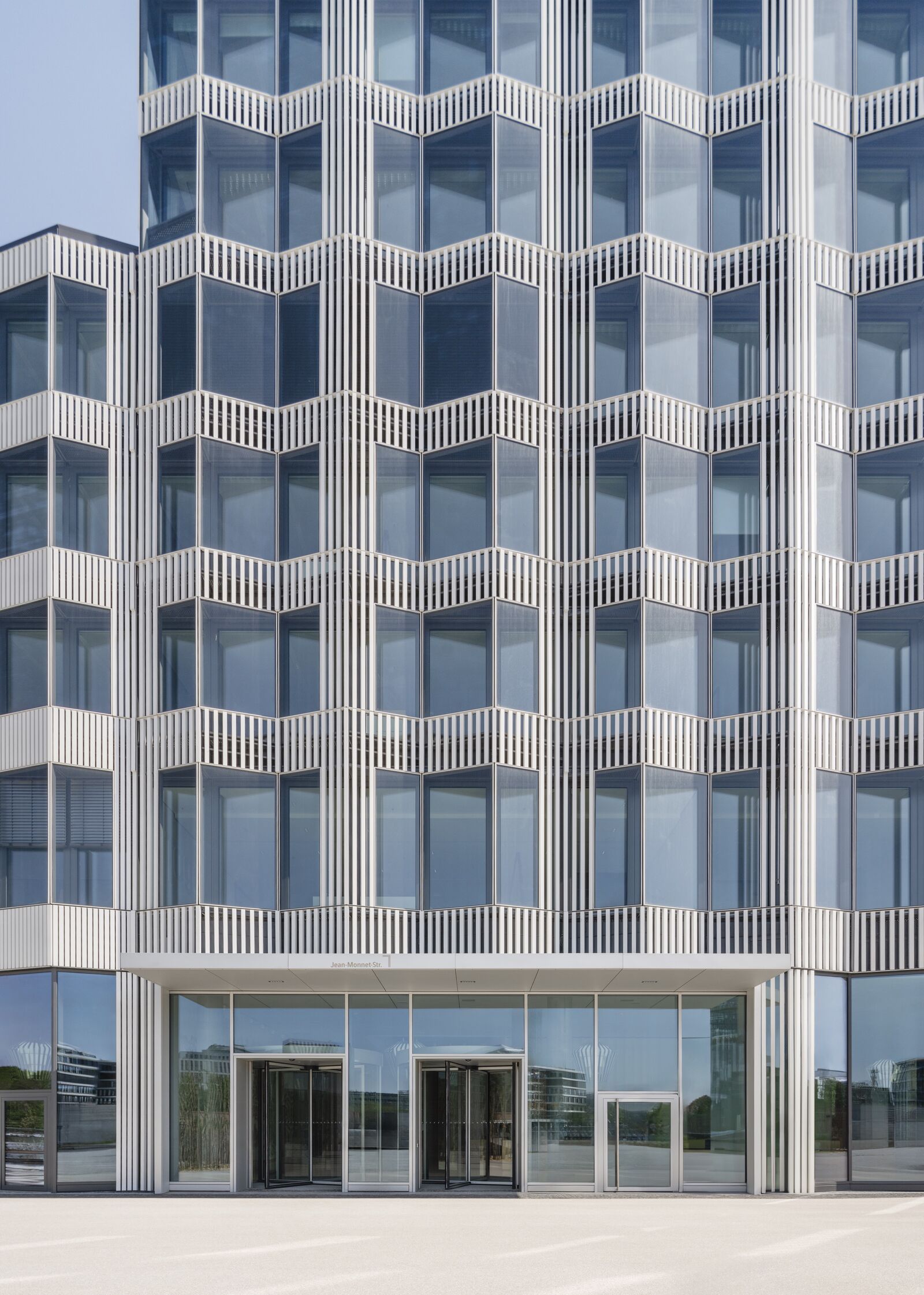 Die Stäbe, die oben dicht an dicht gesetzt sind, fächern sich in den unteren Geschossen auf und hängen so als feiner Vorhang vor der Fassade. Als einladende Geste öffnet sich der Vorhang im doppelgeschossigen Erdgeschoss zum Europaplatz hin.