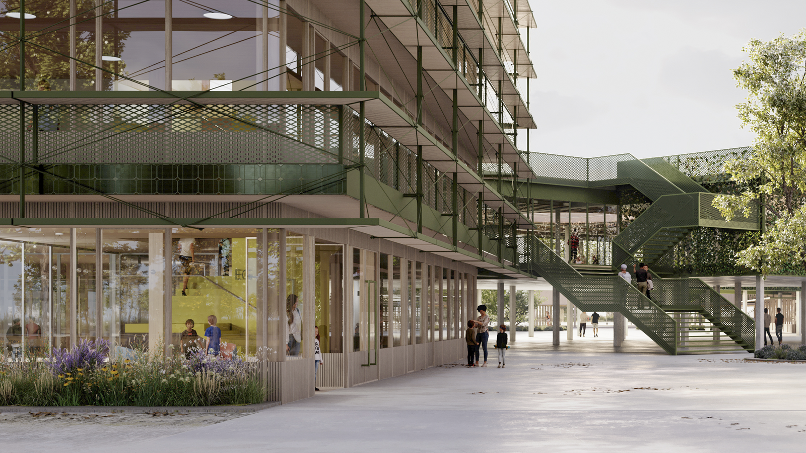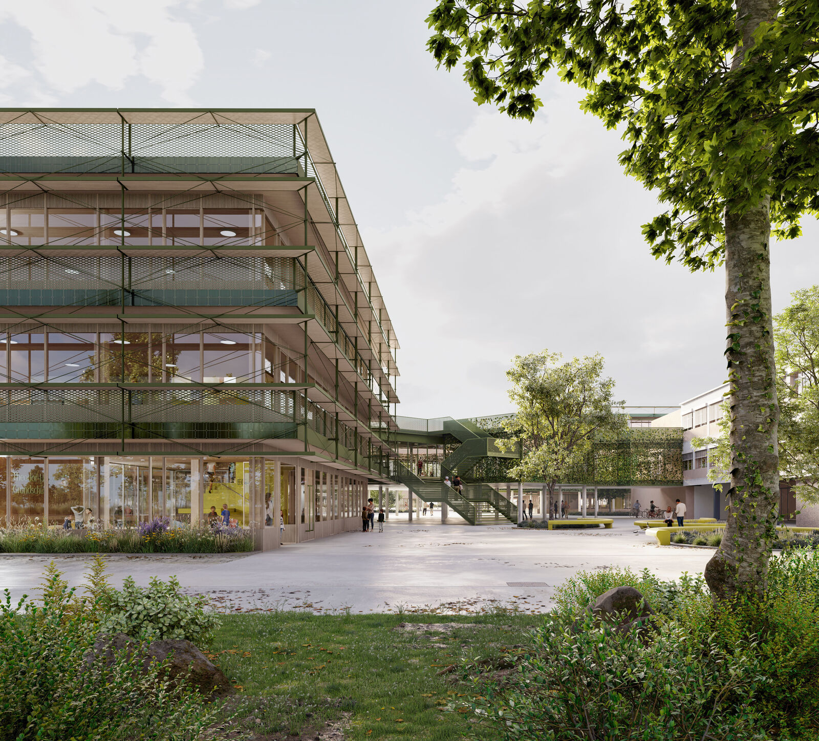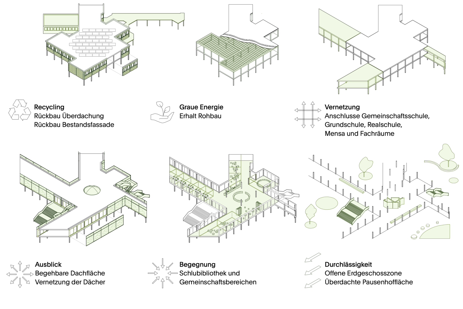 Das Projekt entwickelt einen für Schülerinnen angemessenen Maßstab und bietet viele informelle Lern- und Begegnungsflächen in Clustern an. Die Übersichtlichkeit und Orientierung erleichtert die Identifikation mit dem Ort und verbessert das Wohlbefinden der Schüler*innen. Die Mensa inklusive Aula ist flexibel für unterschiedlichste interne und externe Veranstaltungsformate ausgelegt und bietet einen großzügig überdachten Eingangsbereich. Das Projekt zielt darauf ab, ein Gemeinschaftsgefühl und eine Begegnungskultur zwischen Schüler*innen unterschiedlicher Schulen und Altersstufen zu fördern.