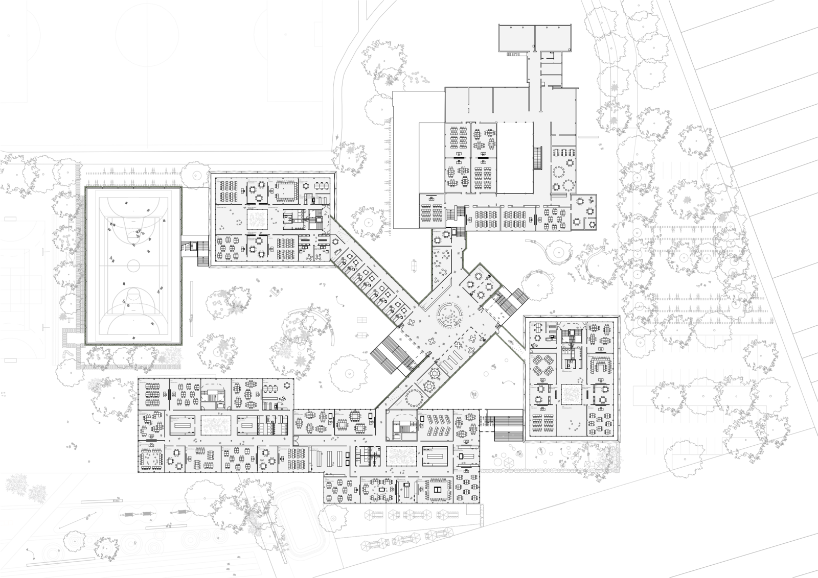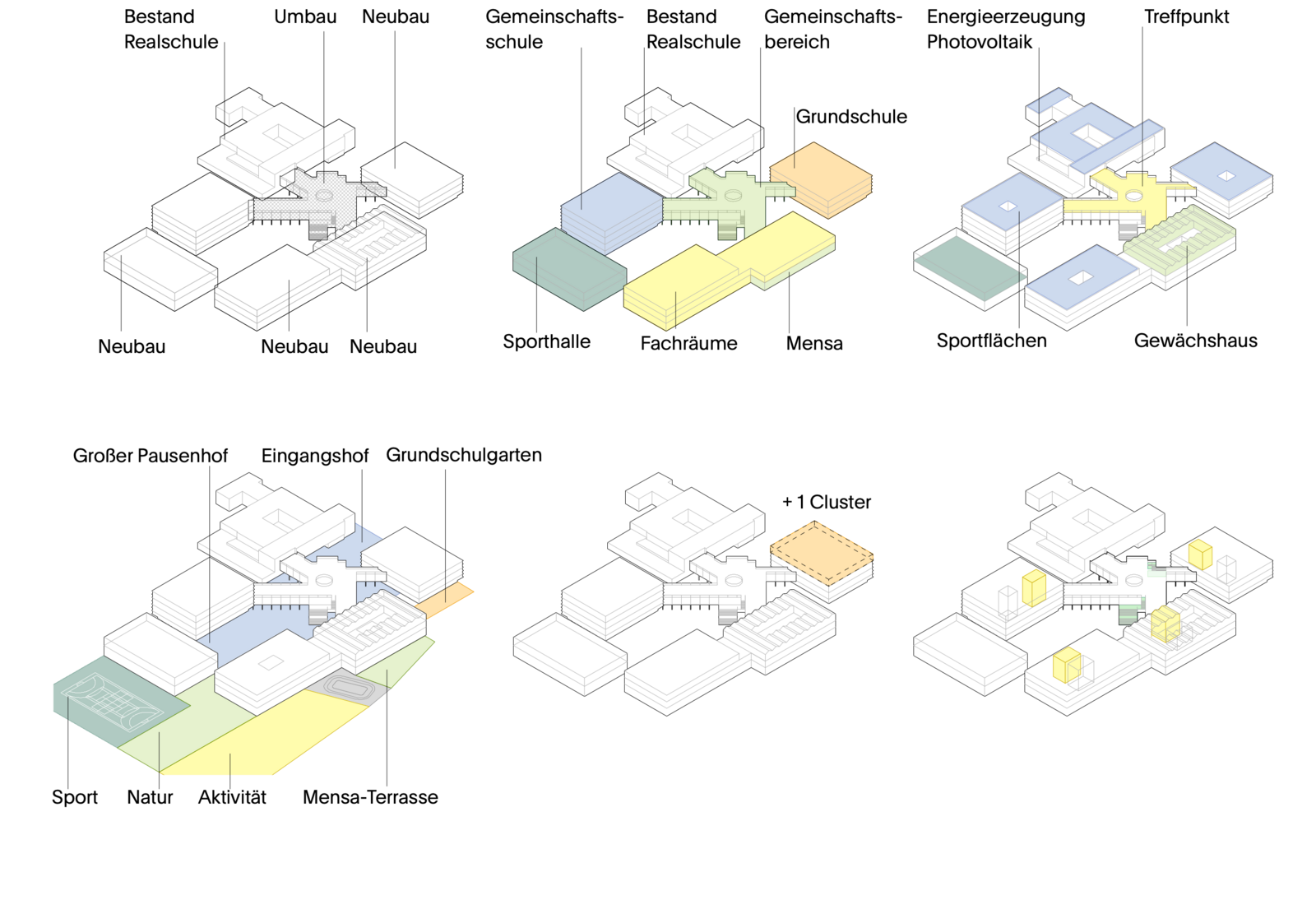Die konzentrisch um dieses zentrale Sterngebäude angeordneten Baukörper stehen durch variierende Abstände, Geschossigkeiten und Verbindungen in einem spannungsvollen Verhältnis zueinander und erzeugen räumliche Situationen, die Aufenthaltsqualität und Gemeinschaftsgefühl fördern. Jedes der neuen Gebäude ist aus seiner inneren, funktionalen Ordnung heraus entwickelt und mit eigenständiger Kubatur, Ausrichtung bzw. Höhenentwicklung im Campus erkennbar. Auch die Sporthalle ist räumlich integriert, um das Projekt in der Gesamtheit als Einheit zu stärken.