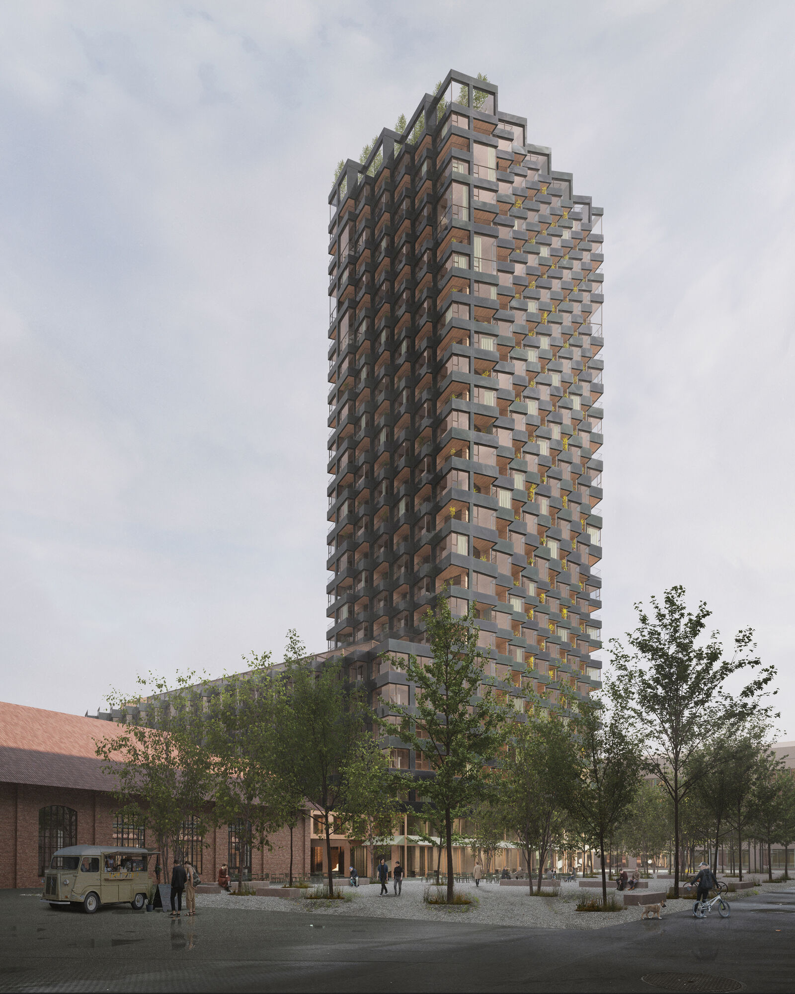 Dabei markiert „Rocket & Tigerli“ den städtebaulichen Abschluss der im Masterplan ausgewiesenen Hochpunkte für das transformierte Areal. Signifikant ist die Plissee-Faltung der Fassade, die das Sheddach motivisch aufgreift und in die Vertikale übersetzt. Die vorgelagerte Raumschicht bewirkt eine skulpturale Erscheinung des Hochhauses. Das Wechselspiel von Erkern und Loggien verleiht der Fassade Tiefe, Plastizität und eine variierende Dynamik, die sich spannungsvoll auch über die Gebäudeecken hinweg entwickelt und den Eindruck einer Torsion entstehen lässt. Die Faltung erhöht zudem die Fassadenabwicklung, sodass Photovoltaik-Module effizient zum Einsatz kommen. Die schwarz-grüne, leicht irisierende Oberfläche nimmt die Farbgebung der historischen „Tigerli“ Dampflokomotive auf.