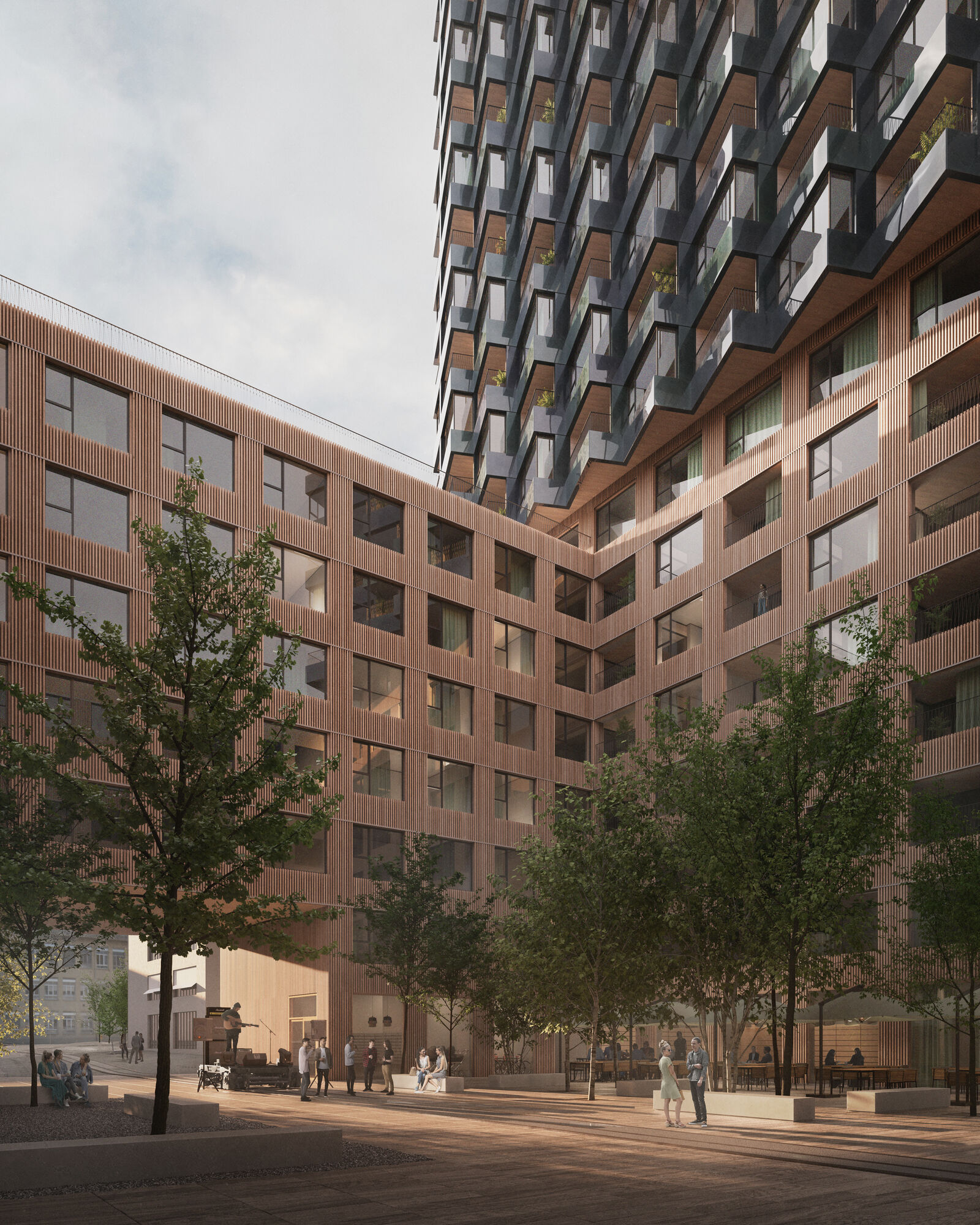 Die Übergänge von den öffentlichen zu den privaten Bereichen sind nuanciert gestaltet. Insbesondere die vielfältigen Außenräumqualitäten sichern ein sozial nachhaltiges Gelingen von Nachbarschaft und Gemeinschaft. Auf dem Dach des Hochhauses steht unter anderem eine großzügige Rooftop-Bar für die Öffentlichkeit bereit, – mit weitläufigem Ausblick in die Alpenregion.