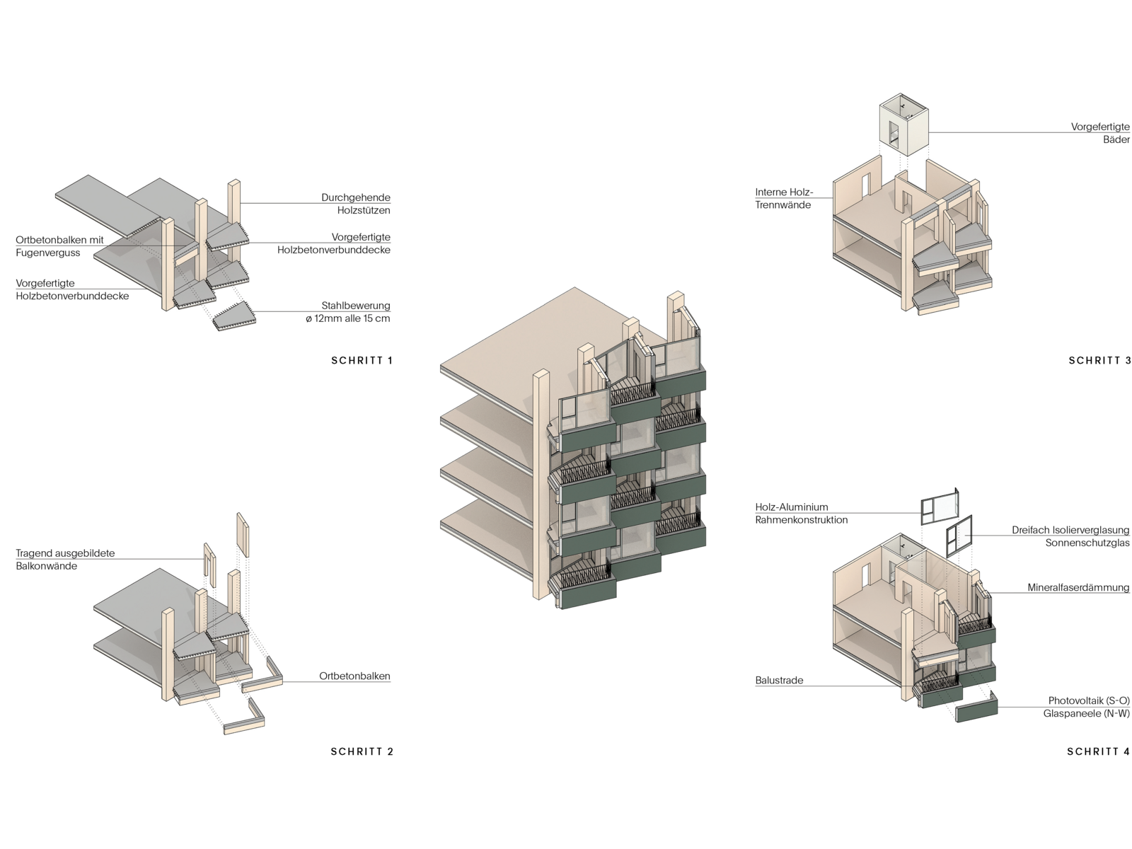 Die gesamte Konstruktion und ein Großteil der Fassaden können vollständig in den geschlossen Wertstoffkreislauf zurückgeführt werden, und ersetzen somit einen Primärrohstoff von mindestens gleicher Materialgüte. Optimierte Stütz- und Tragraster gestatten einen breiten Wohnungsmix und flexible Anpassungen an sich ändernde Nutzungsprofile. Differenzierte Erschließungstypen bieten unterschiedliche Wohn- und Begegnungsräume, je nach den Bedürfnissen der Nutzer*innen.
