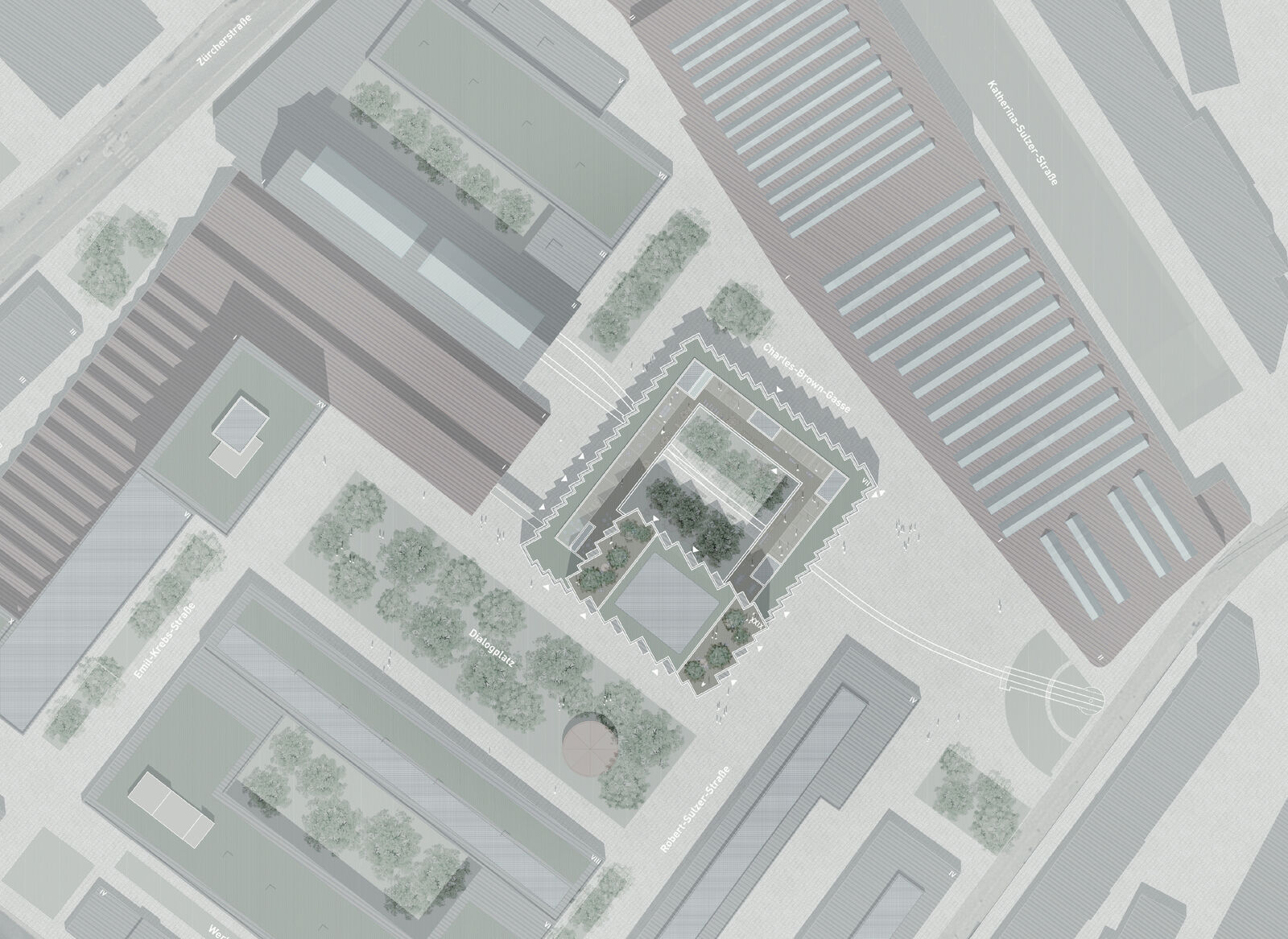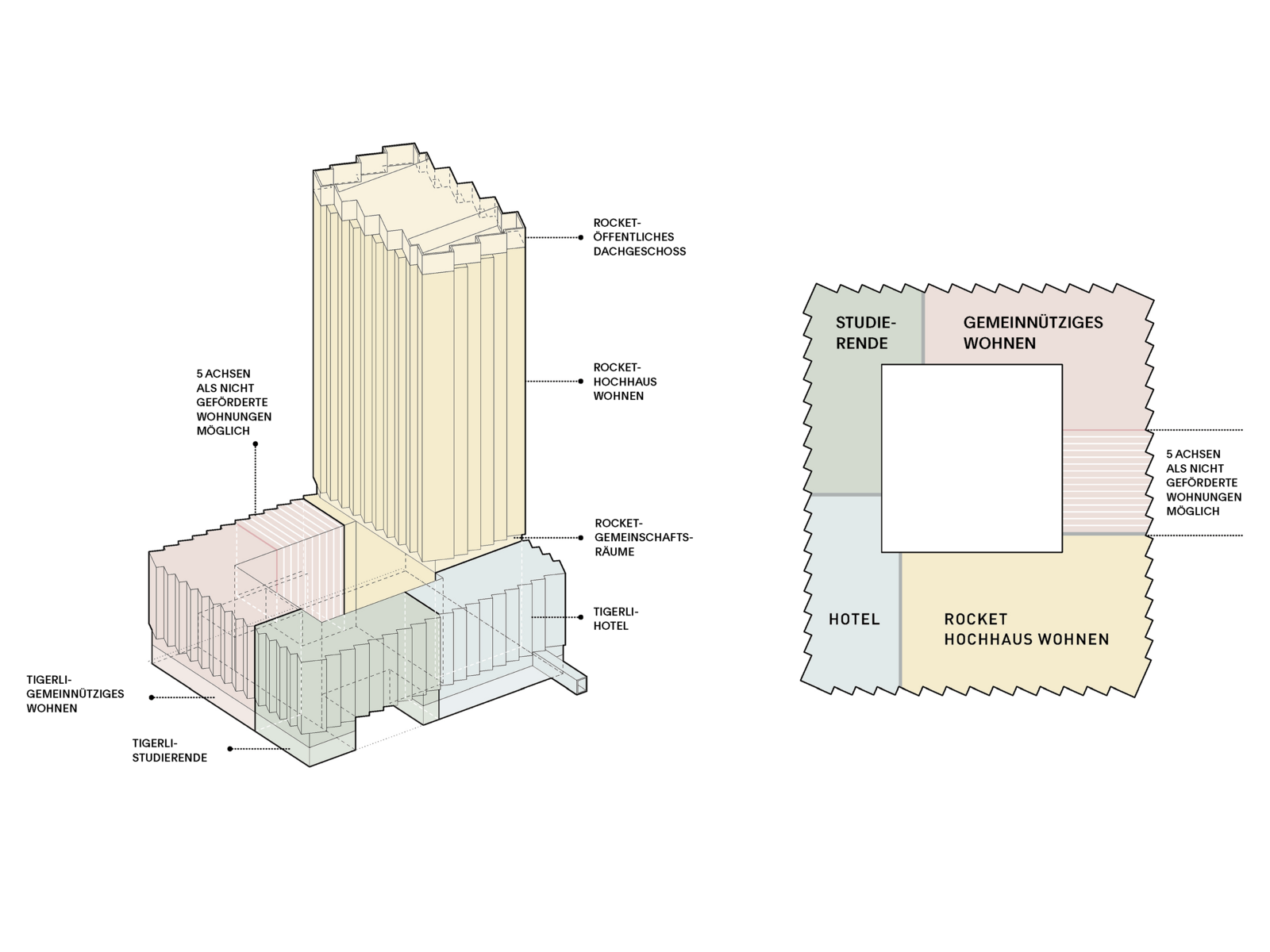 In dieses Ensemble reiht sich das weltweit höchste Holzhochhaus „Rocket & Tigerli“ räumlich und strukturell ein. Neben der zentralen Vorgabe des nachhaltigen Bauens gilt es, ein ebenso kontextbezogenes wie selbstbewusstes, ikonografisches wie einladendes Gebäude als Landmarke zu platzieren, das auch mit den Charakteristika des Ortes wirkungsvoll umgeht.