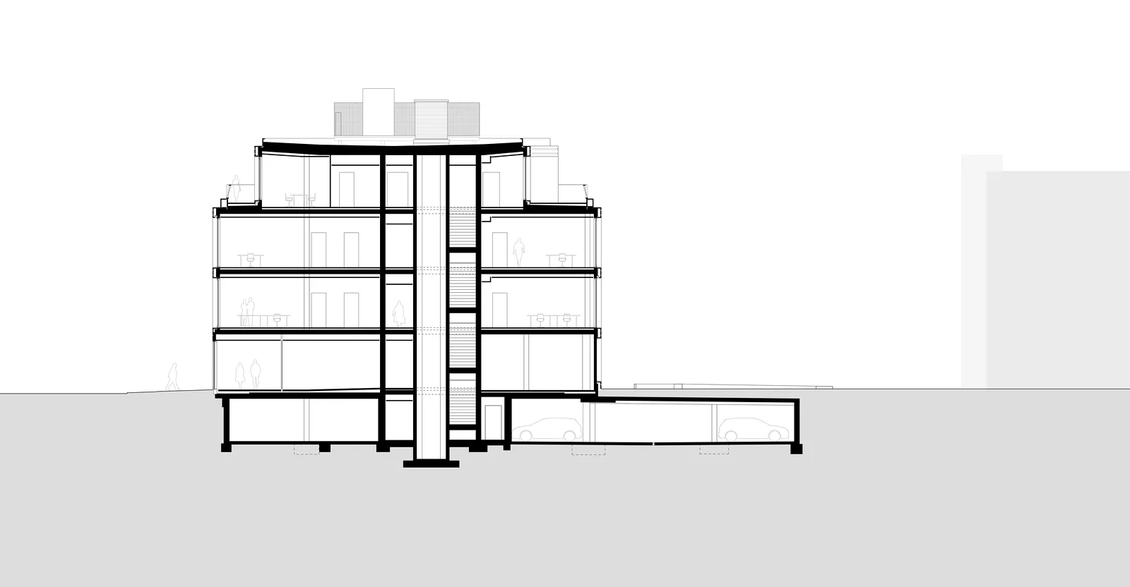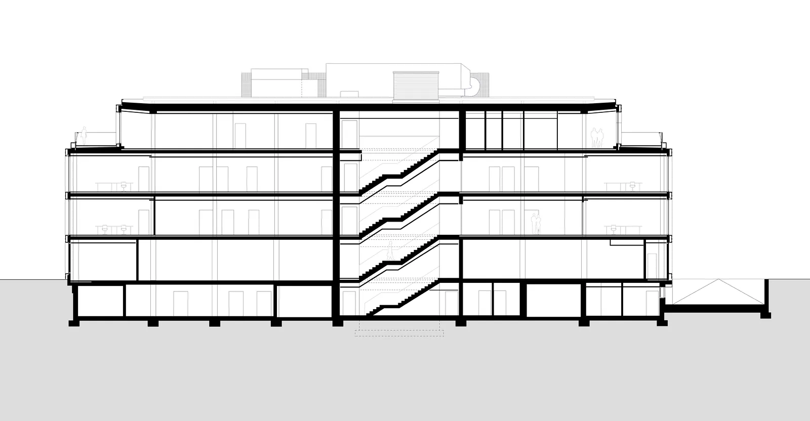 Auf Rücksprünge und freie Stützenstellungen im Erdgeschoss wird verzichtet, zugunsten eines klar konturierten Baukörpers, der sich nun mit drei Regelgeschossen und einem zurückgesetzten Dachgeschoss zeigt.