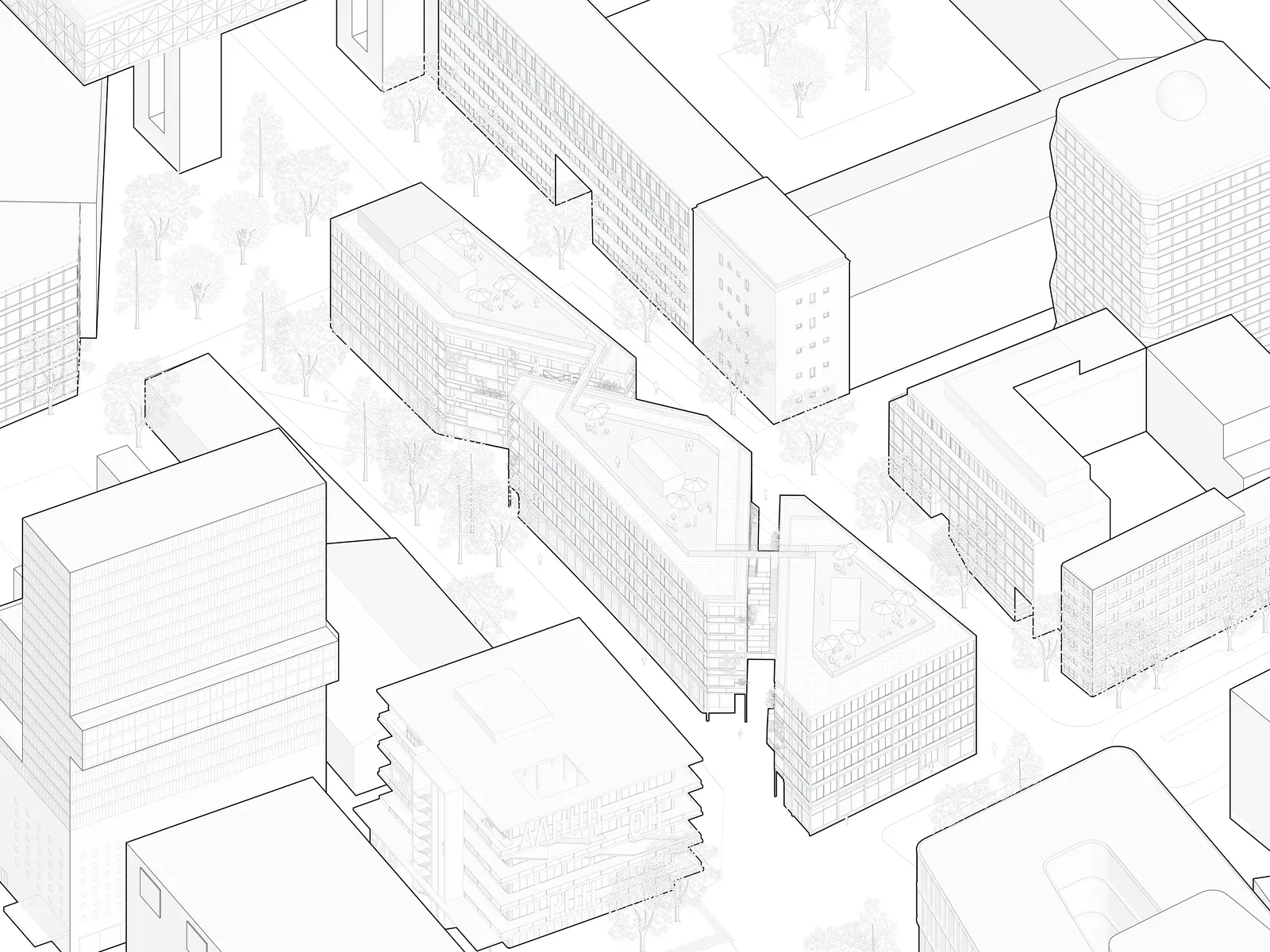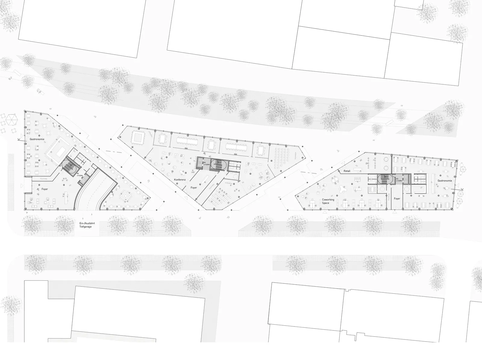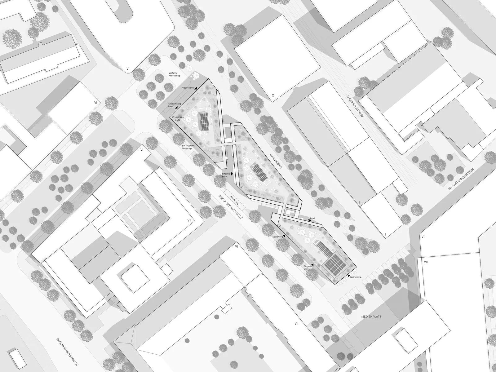 Der Entwurf entspricht dem „Geist“ des neuen Stadtquartiers, so wie er im Gestaltungsleitfaden des Bebauungsplans formuliert ist und im Quartier durch hochwertige und abwechslungsreiche Architektur bereits gelebt wird. Im Kontext der spezifischen Grundstücksform und der übergeordneten Wegeführung des Baufeldes entstehen drei miteinander verbundene Gebäude. Sie werden durch ihr robustes, industriell geprägtes Erscheinungsbild als ein Stadtbaustein wahrgenommen.