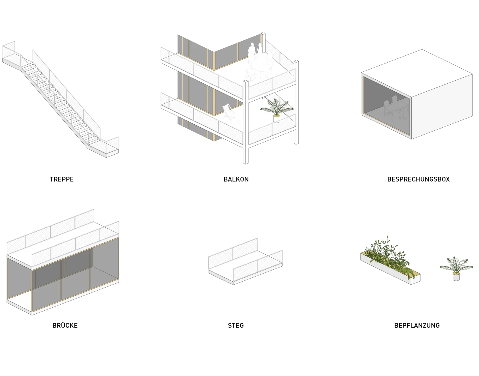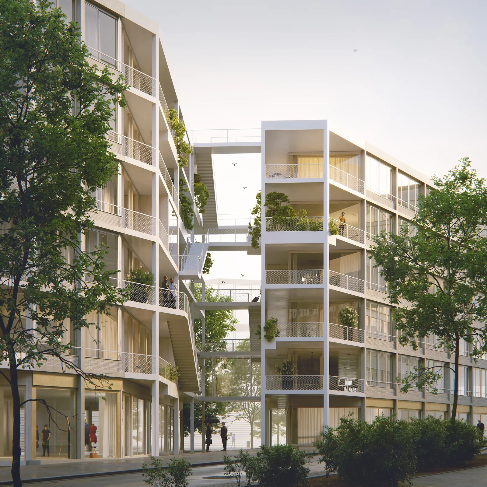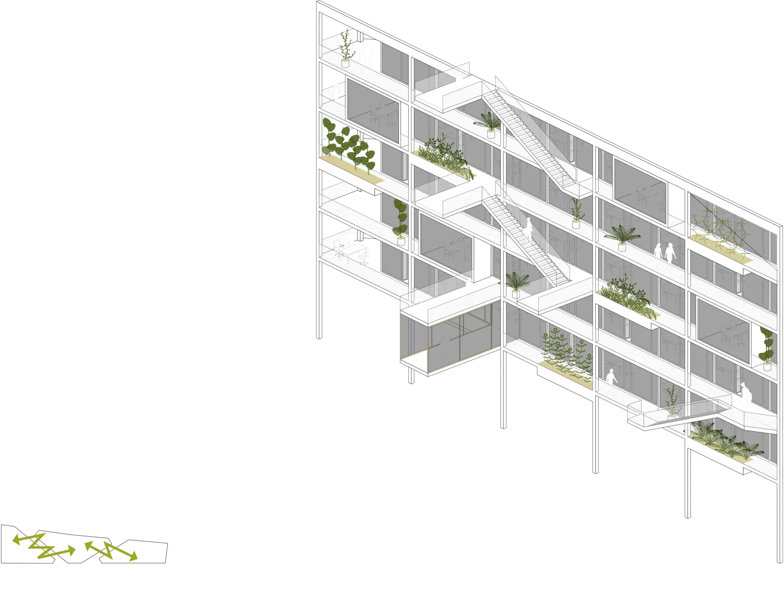 Durchwegungen zur öffentlichen Nutzung im Erdgeschoss und äquivalente Verbindungen über Stege zwischen den Obergeschossen sind zentrale Elemente des architektonischen Konzeptes.