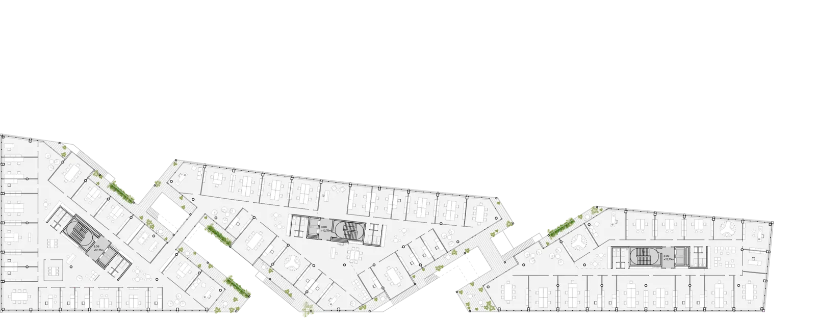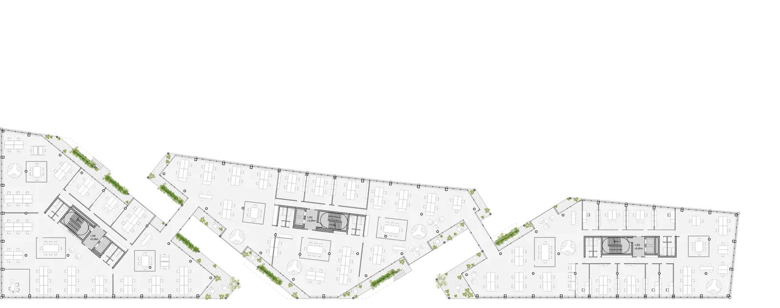 Die Dachterrassen und Fugen zwischen den Gebäuden ergänzen die Arbeitsflächen um attraktive Freiräume. Sämtliche Grundrisse sind vielseitig programmierbar und lassen sich je nach Bedarf flexibel konfigurieren.