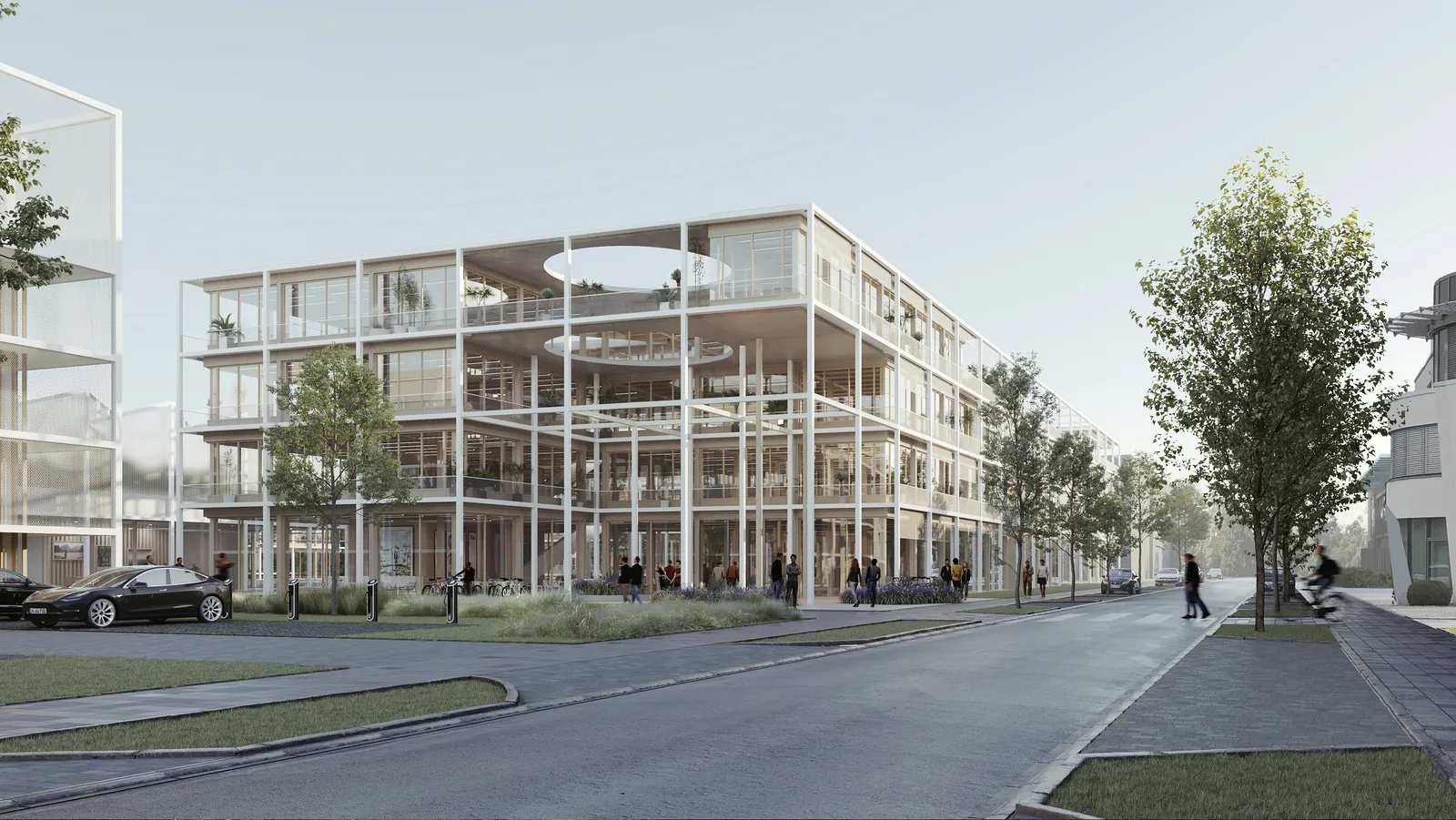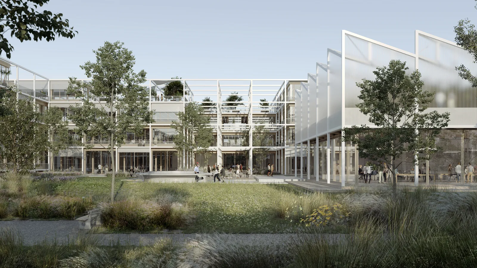 Der Entwurf für den neuen Forschung- und Bürocampus kreiert ein identitätsstiftendes Gebäudeensemble, das durch Offenheit, Transparenz und egalitäre Räume geprägt ist und den Außenraum konzeptionell einbindet. Die Bestandsgebäude werden durch einen Vorplatz räumlich und ideell adressbildend integriert.