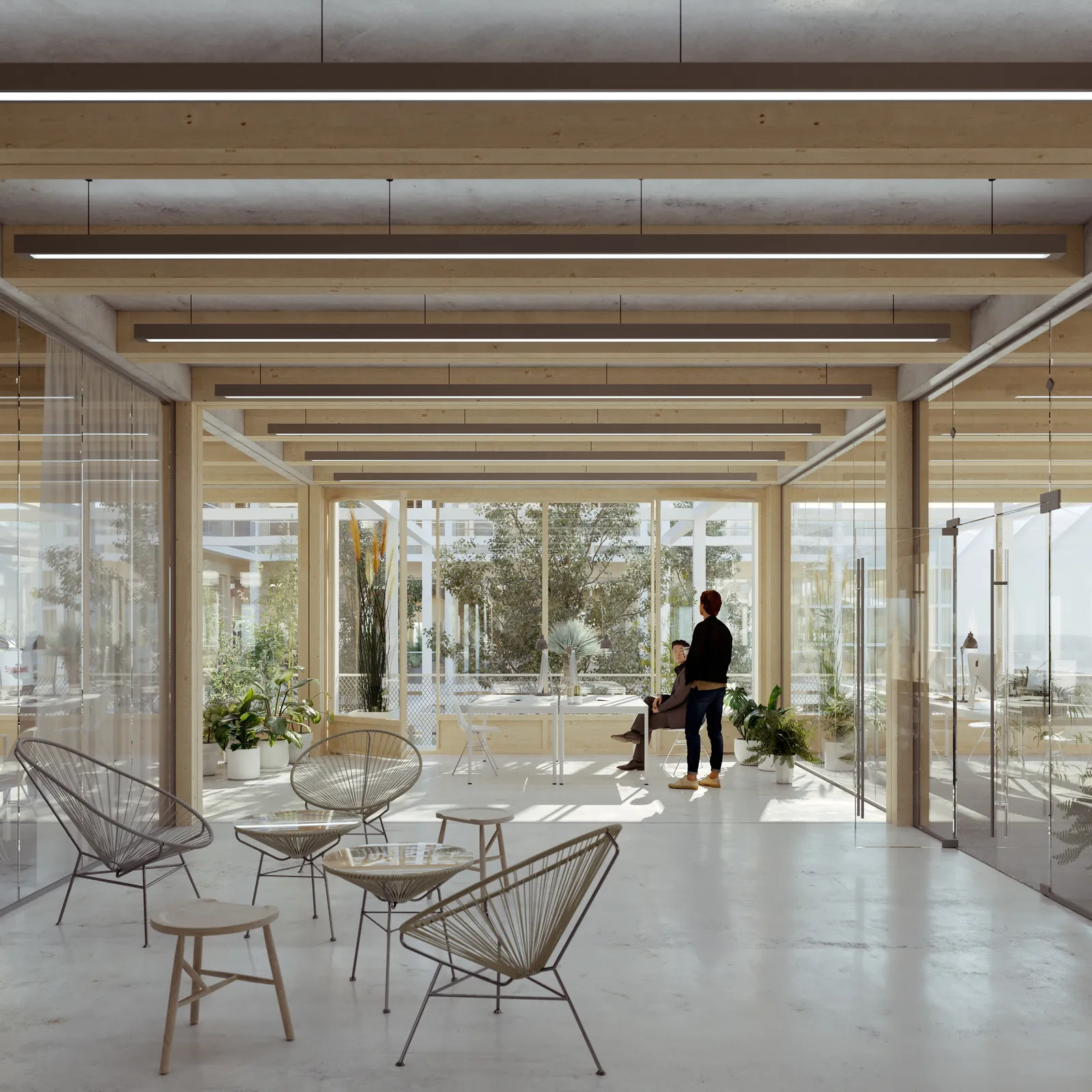 Sie bieten Austrittsmöglichkeiten und Kommunikationsflächen im Freien und vernetzen die Freiflächen visuell mit dem Arbeitsraum. Die Unternehmenshaltung, die sich dem Wohl der Mitarbeiter und Besucher verpflichtet hat, wird so in der Architektur sichtbar. Gleichzeitig wird ein größtmögliches Maß an Flexibilität in den Grundrissen ermöglicht.