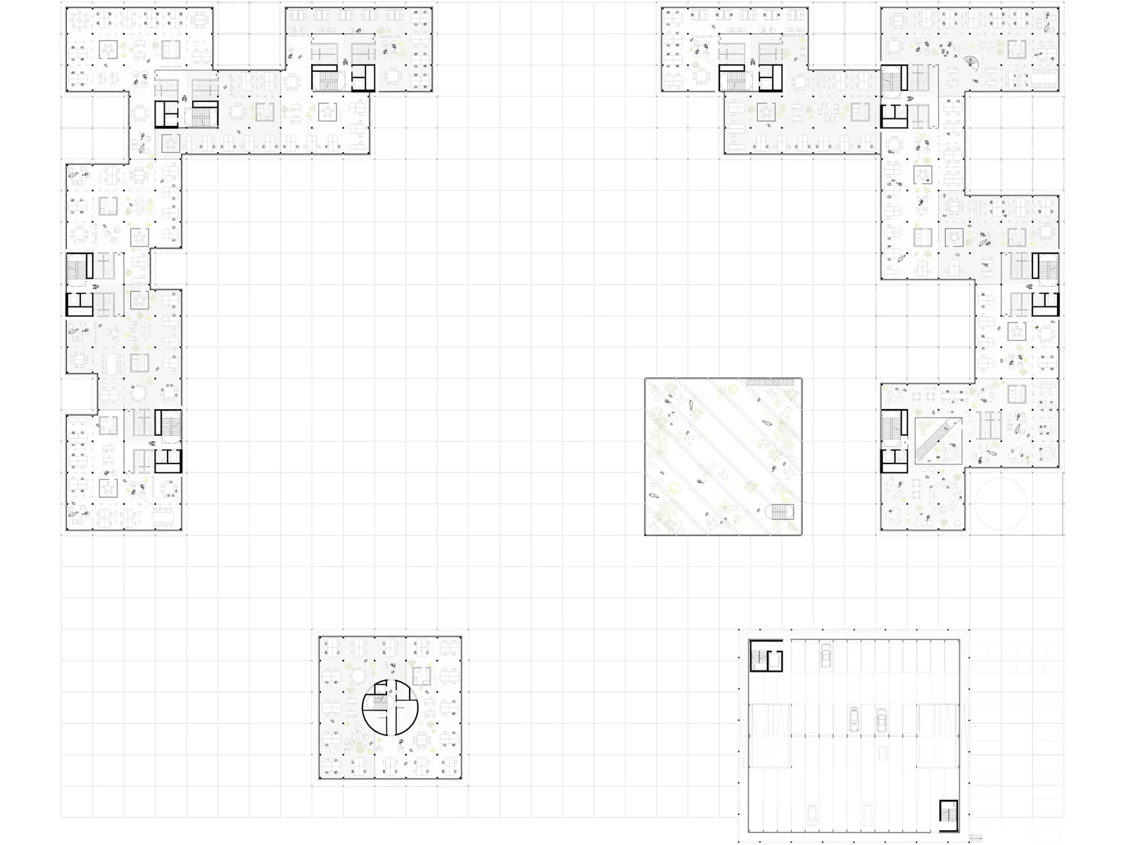 Der gesamte Campus, inklusive der Freiflächen, ist auf einem durchgängigen quadratischen Raster aufgebaut. Höfe in den einzelnen Gebäudemäandern sorgen für optimale Tagesbelichtung der Büroflächen und schaffen eine helle, freundliche Arbeitsatmosphäre.