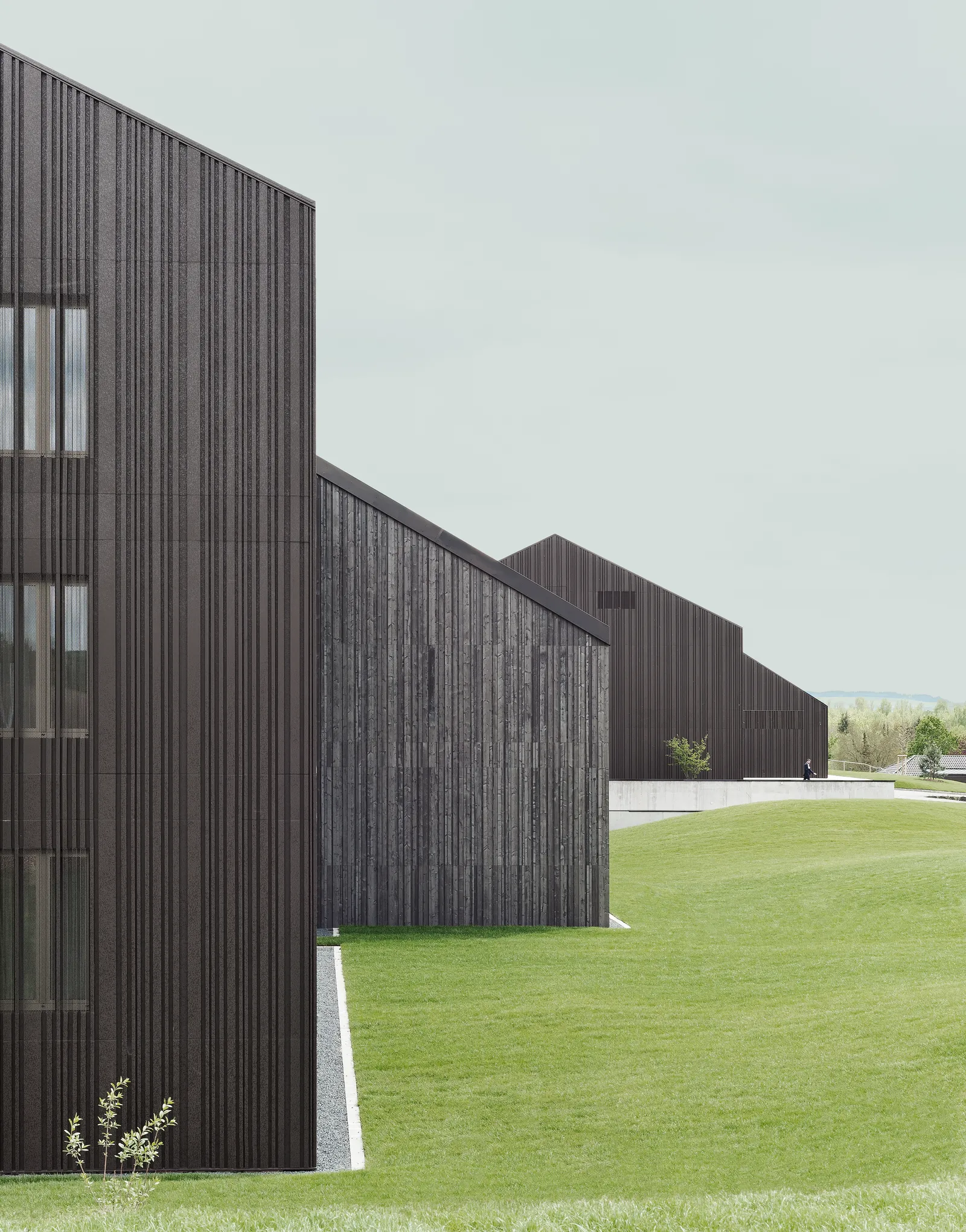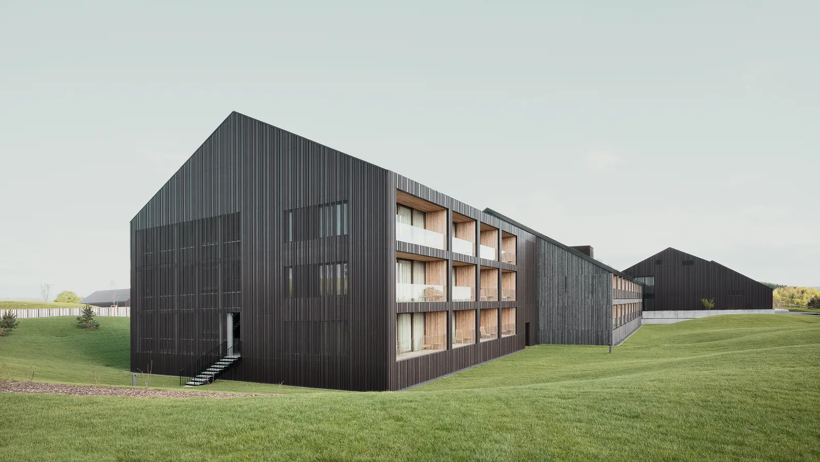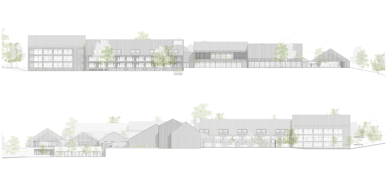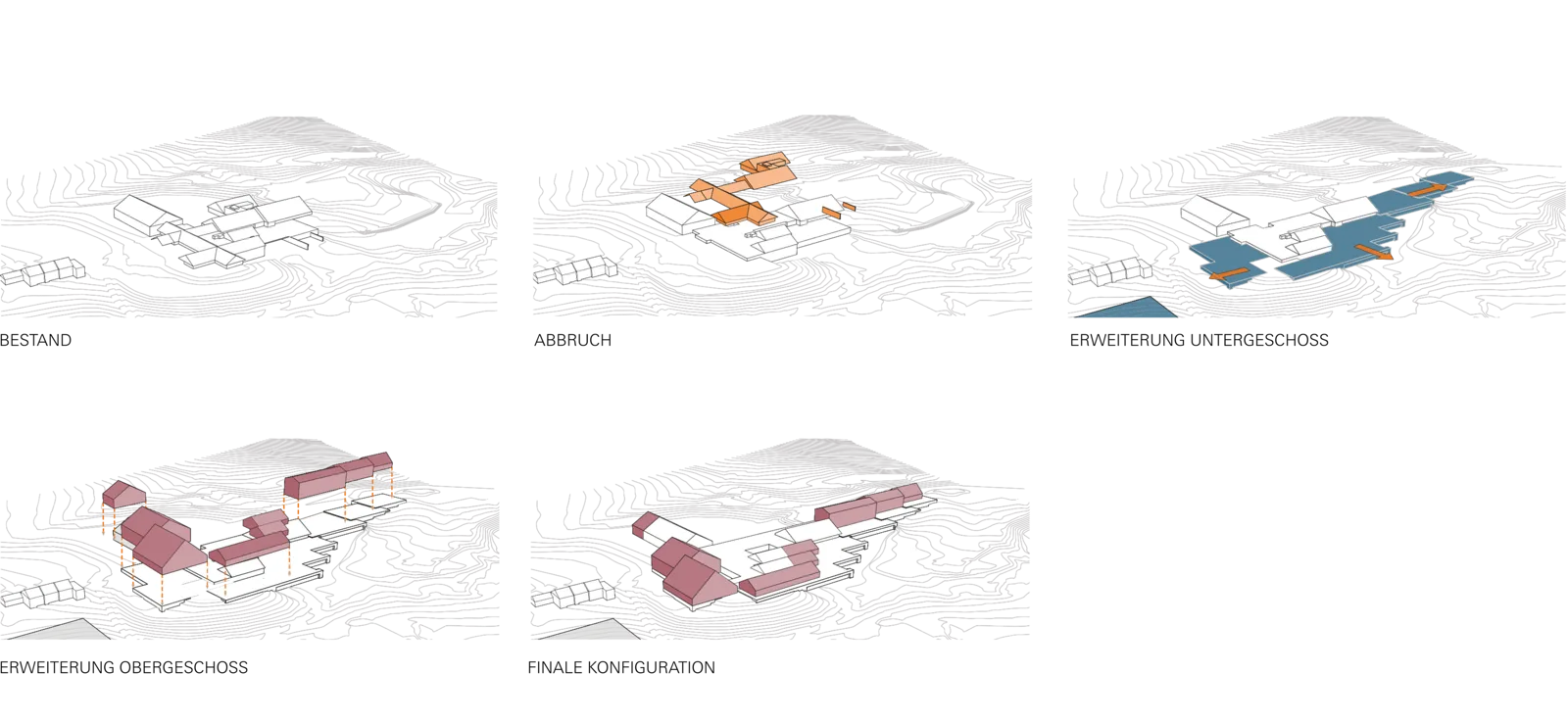 Der Bestand wurde behutsam entkernt, in seiner Kubatur reduziert und durch weitere in Lage und Höhe gestaffelte Baukörper ergänzt. Das architektonische Konzept zitiert den Archetypus des Gehöfts aus einzelnen und in Gruppen stehenden Satteldachhäusern. Ihre Anordnung verweist auf eine sensible, maßstäbliche Einbindung in den Landschaftsraum.
