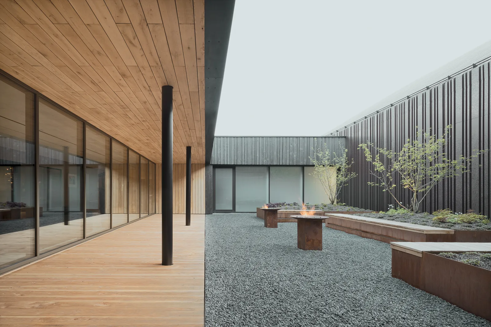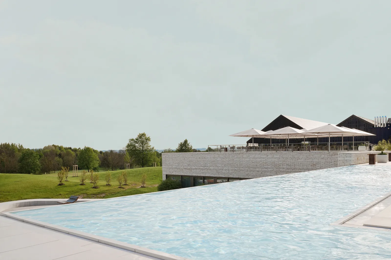 Es entstanden eine neue Empfangshalle, ein modernes Tagungszentrum, ein erweiterter Spa-Bereich und 125 neu ausgestattete Hotelzimmer. Essentieller Bestandteil des Entwurfs war die Einbettung des Freiraums in das Gebäudeensemble: Haus und Terrasse fügen sich zu einer symbiotischen Einheit und grenzen sich eindeutig vom Landschaftsraum ab.