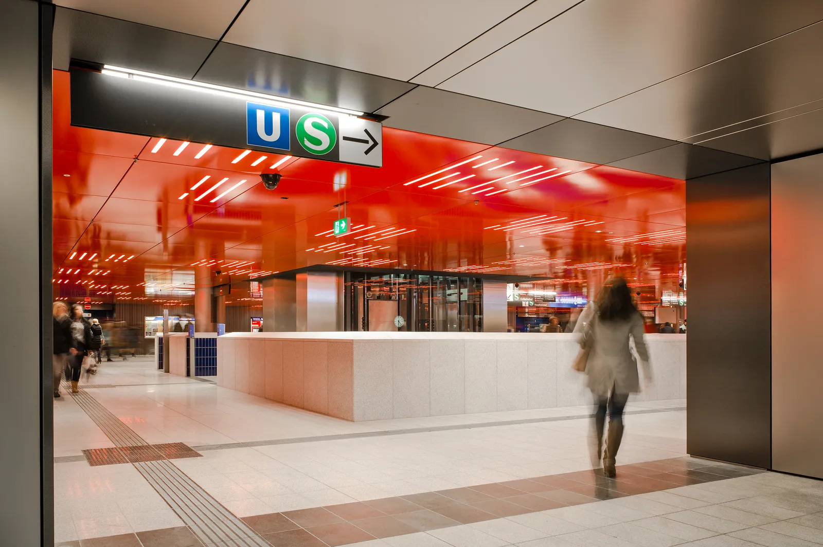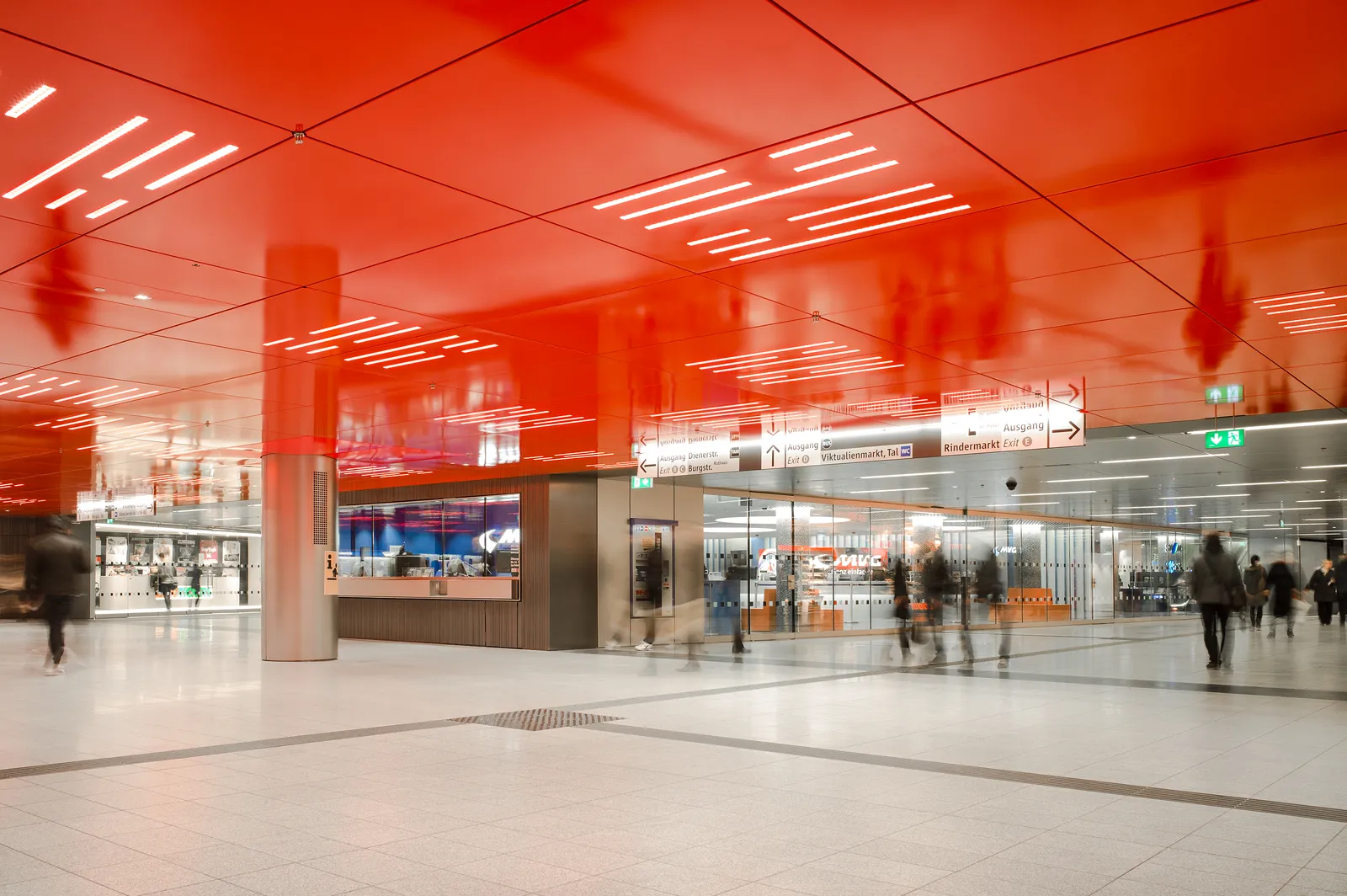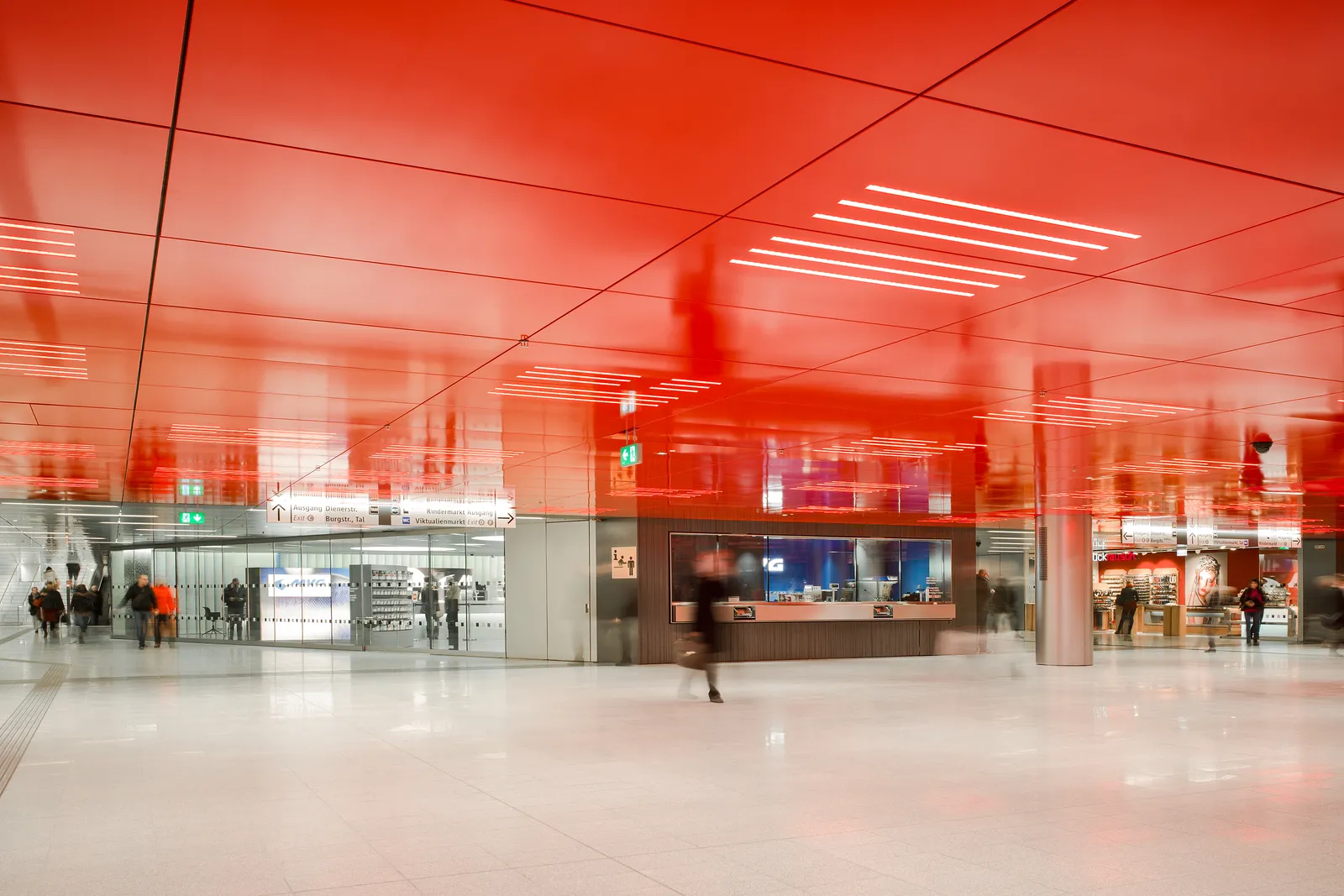 Als Bezug zu den bereits seit den 70er Jahren bestehenden Bahnsteigen wurde für das Lichtkonzept die Farbe Orangerot ausgewählt. Das Sperrengeschoss im Marienplatz ist heute ein unverwechselbarer Stadtraum mit einer eigenen Identität – lebhaft, stark frequentiert und mit speziellem Flair.