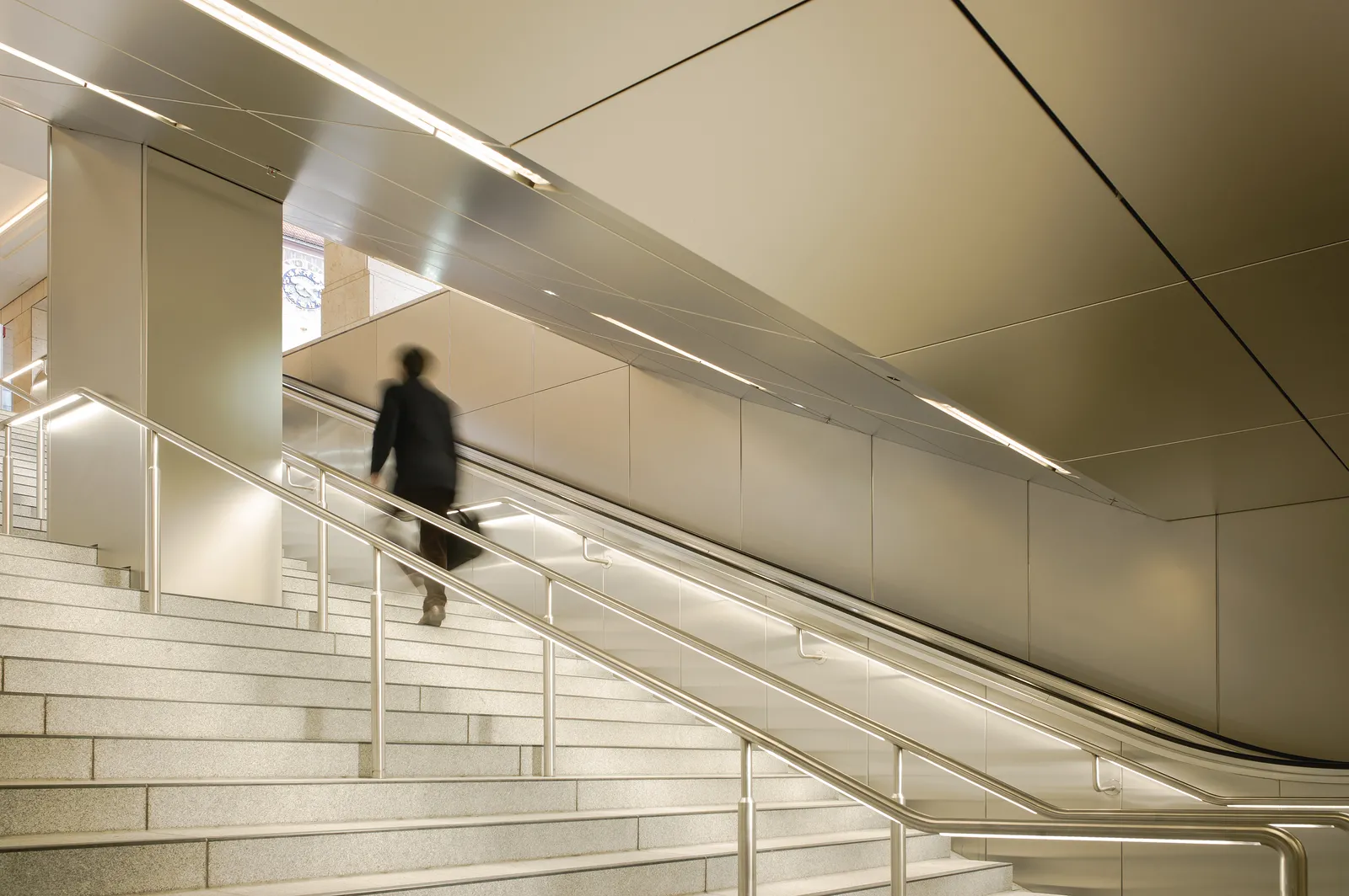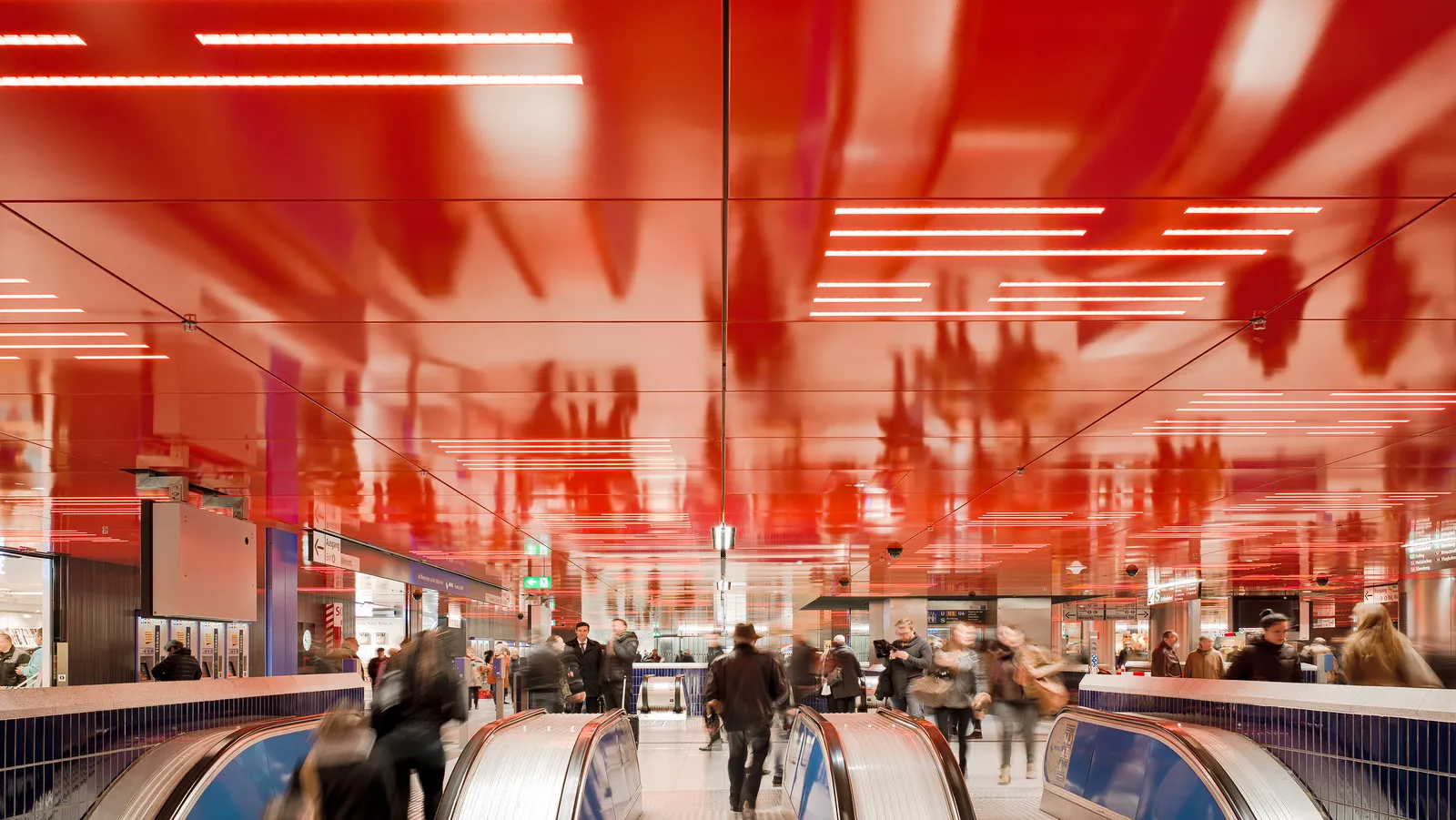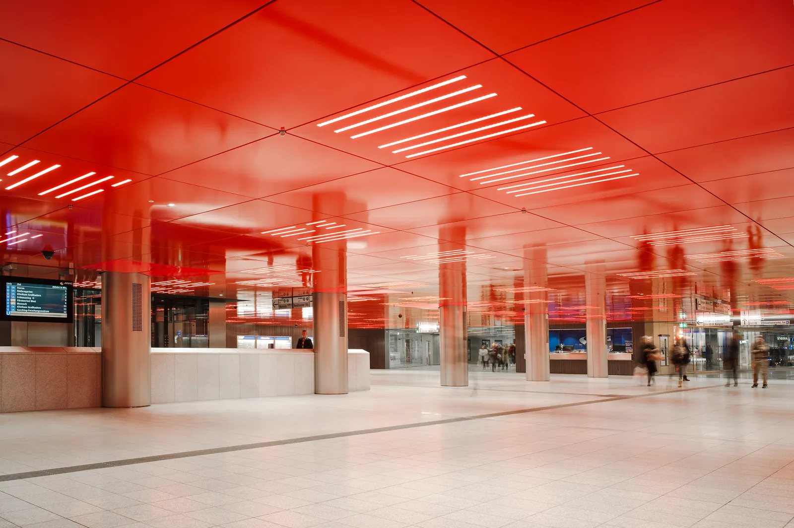 Als Bezug zu den bereits seit den 70er Jahren bestehenden Bahnsteigen wurde für das Lichtkonzept die Farbe Orangerot ausgewählt. Das Sperrengeschoss im Marienplatz ist heute ein unverwechselbarer Stadtraum mit einer eigenen Identität – lebhaft, stark frequentiert und mit speziellem Flair.