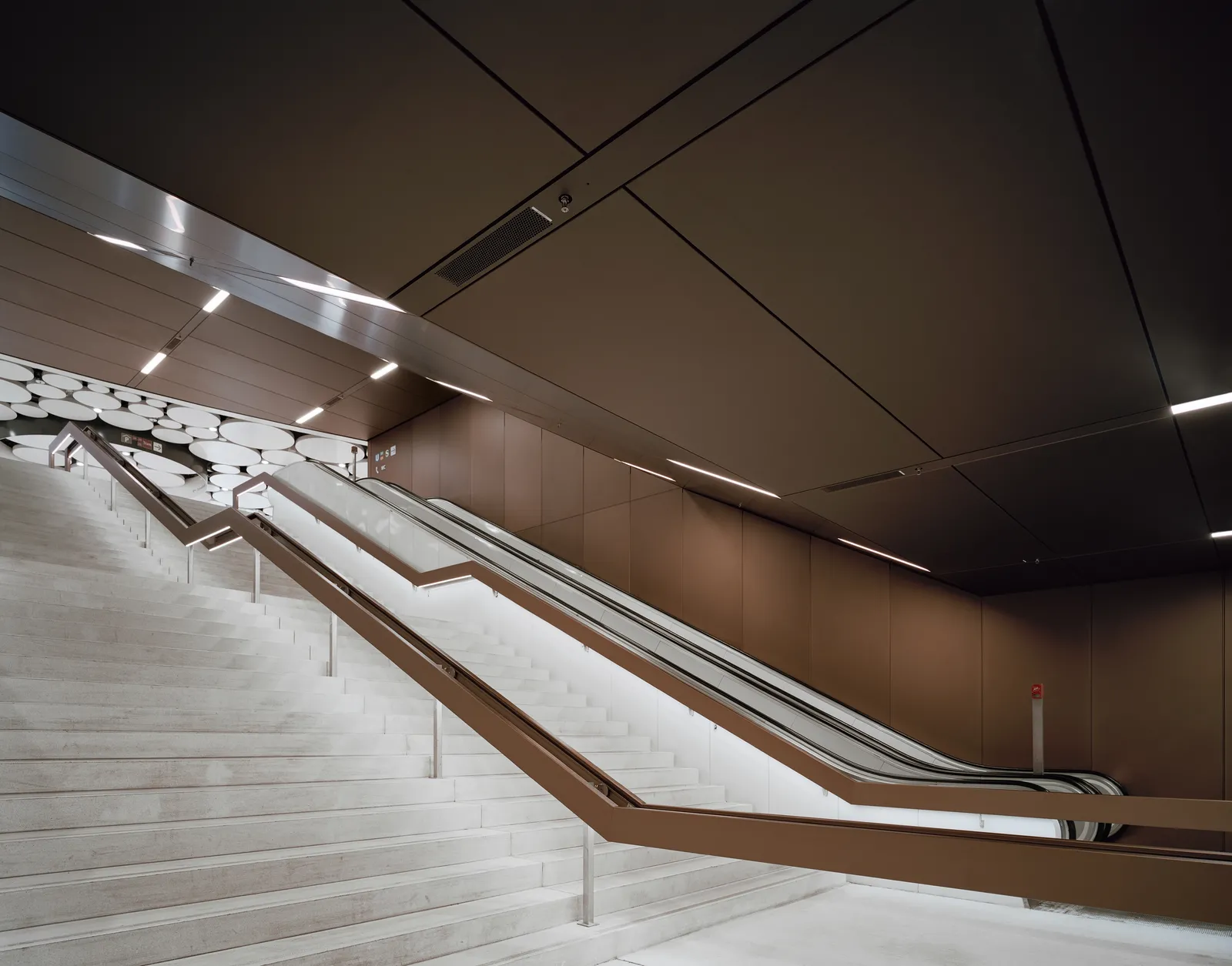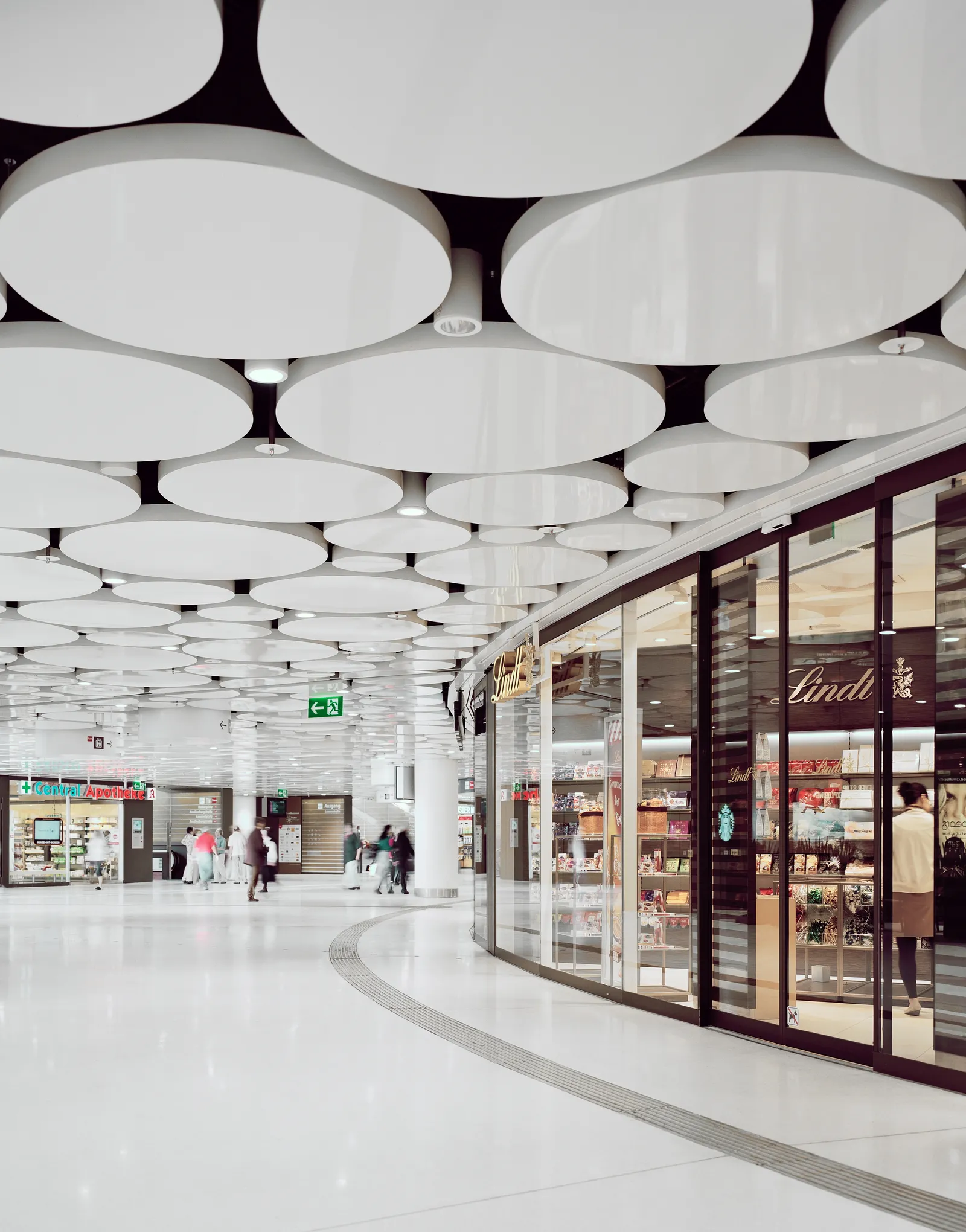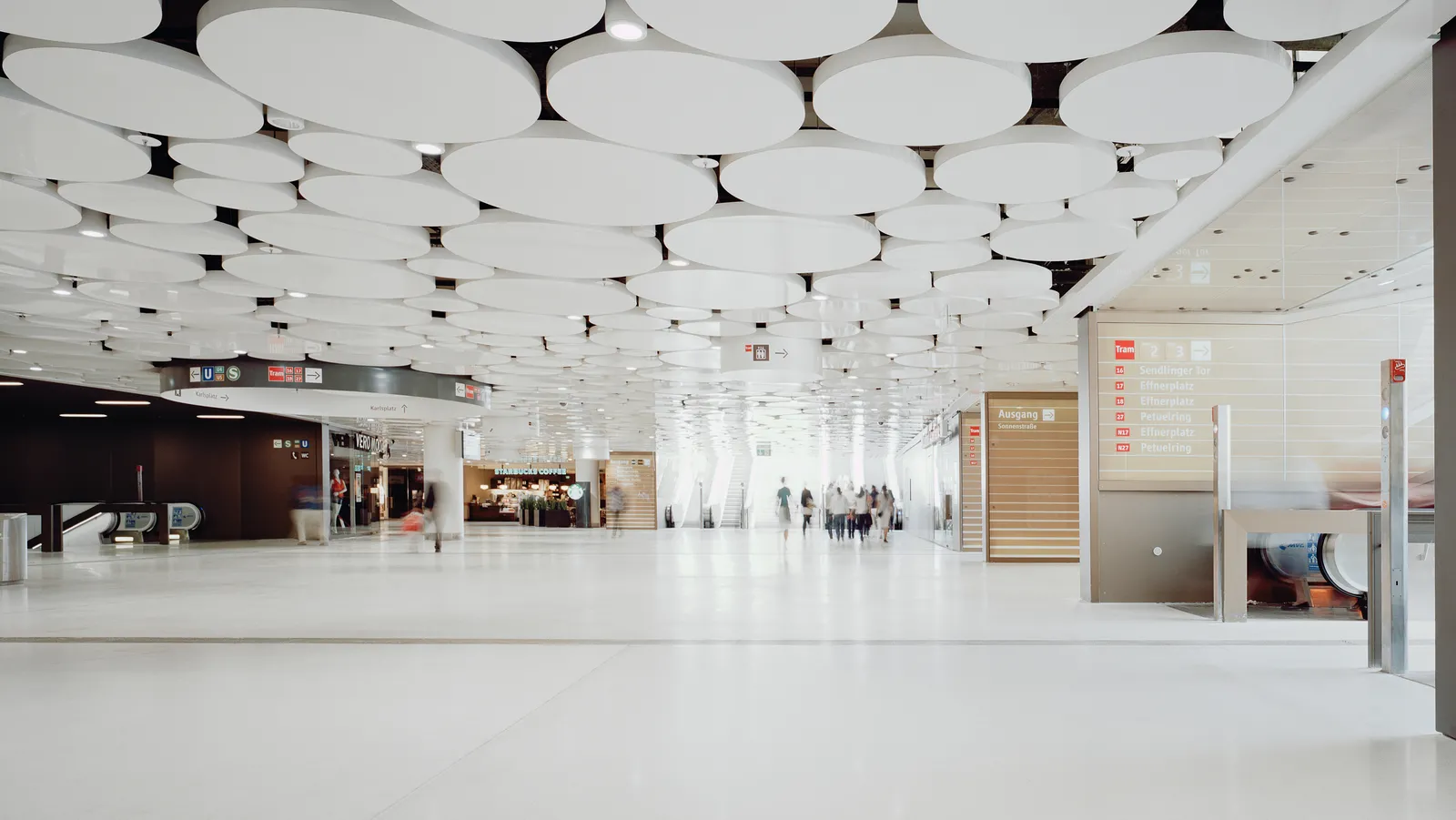 Helle Flächen, hochwertige Bodenbeläge sowie raumbildende Decken- und Wandverkleidungen setzen einen bewussten Kontrast zu einem Stadtraum, der primär funktionalen Anforderungen an Transfer und Zugang zum öffentlichen Nahverkehr folgt.