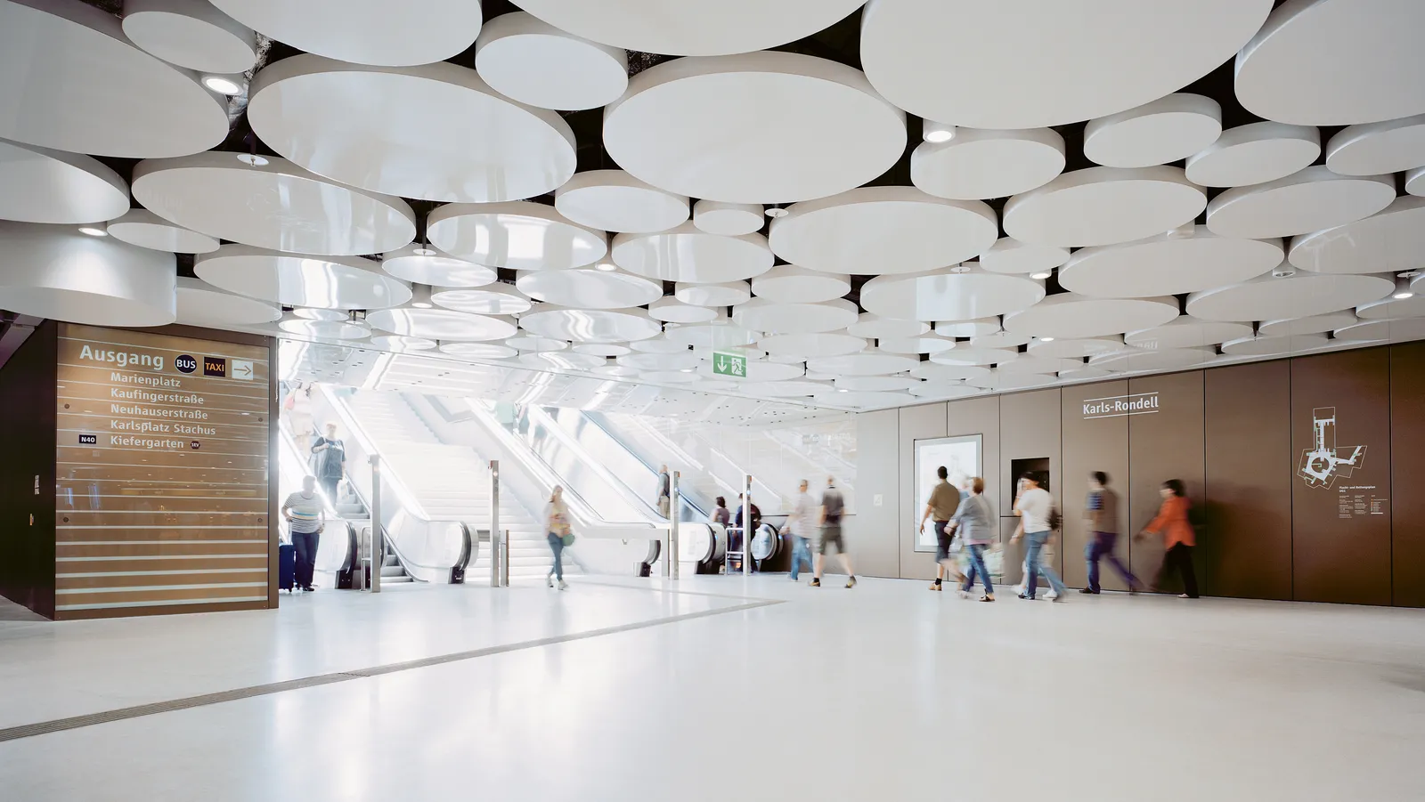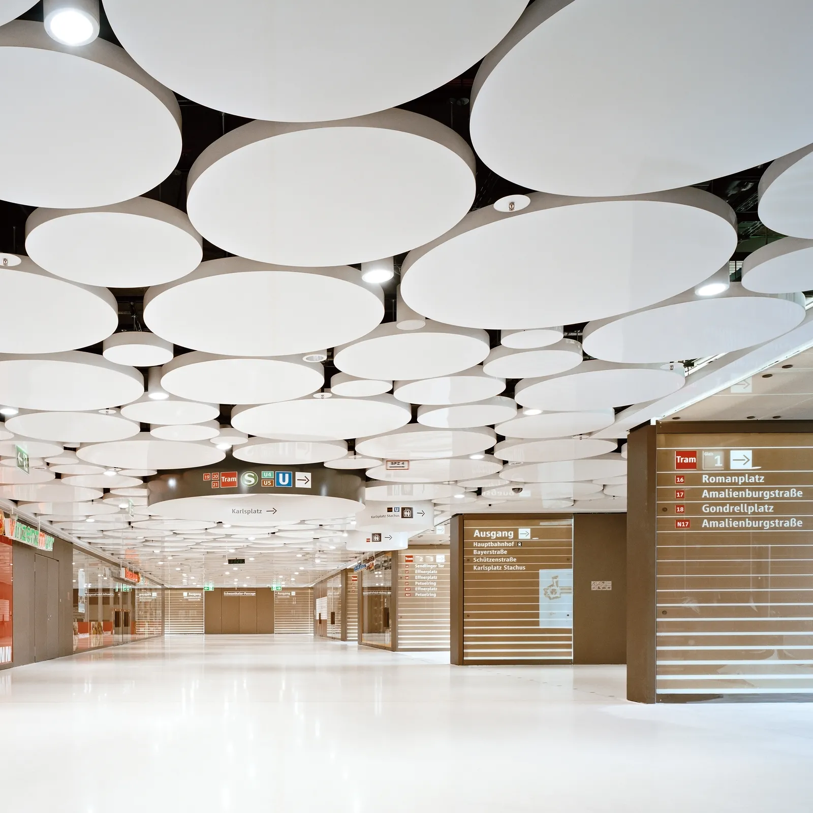 Die Kreisform des signifikanten, darüber liegenden Stachus Rondells ist bei der Gestaltung das wesentliche, identitätsstiftende Motiv. Die dadurch entstehende Korrespondenz zwischen oben und unten schafft Orientierung innerhalb der Passagen.