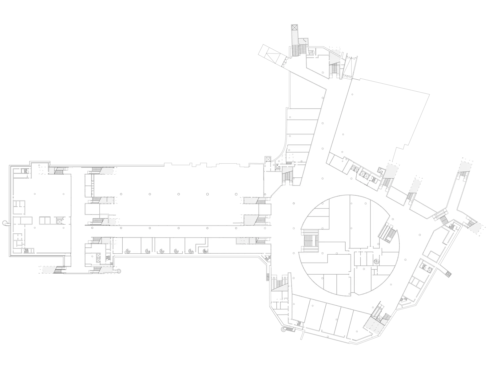 Der vormals unübersichtliche Bestand aus Gewerbe- und Gastronomieflächen wird in einem konzeptionell leicht begreifbaren Raum an einer Stelle zentriert. Ein Leitsystem und schlüssige Signaletik führen durch das Sperrengeschoss und erfüllen alle Anforderungen an Transfer, Zugang und Orientierung im Raum.
