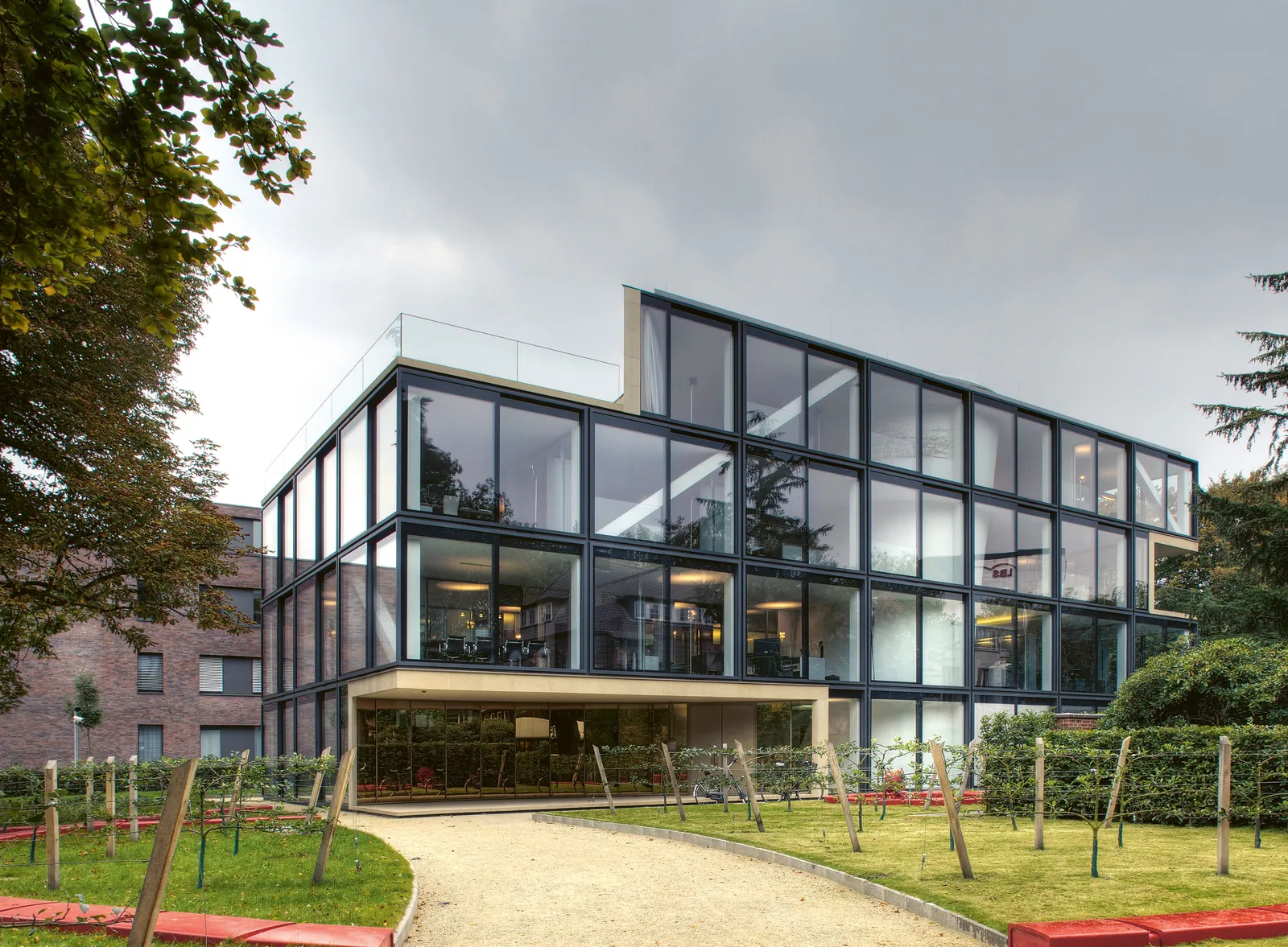 An exponierter Stelle in Münster, in der Nähe des Aasees, bildet das Bürogebäude den Abschluss einer Reihe von zum See hin orientierten Bauwerken.