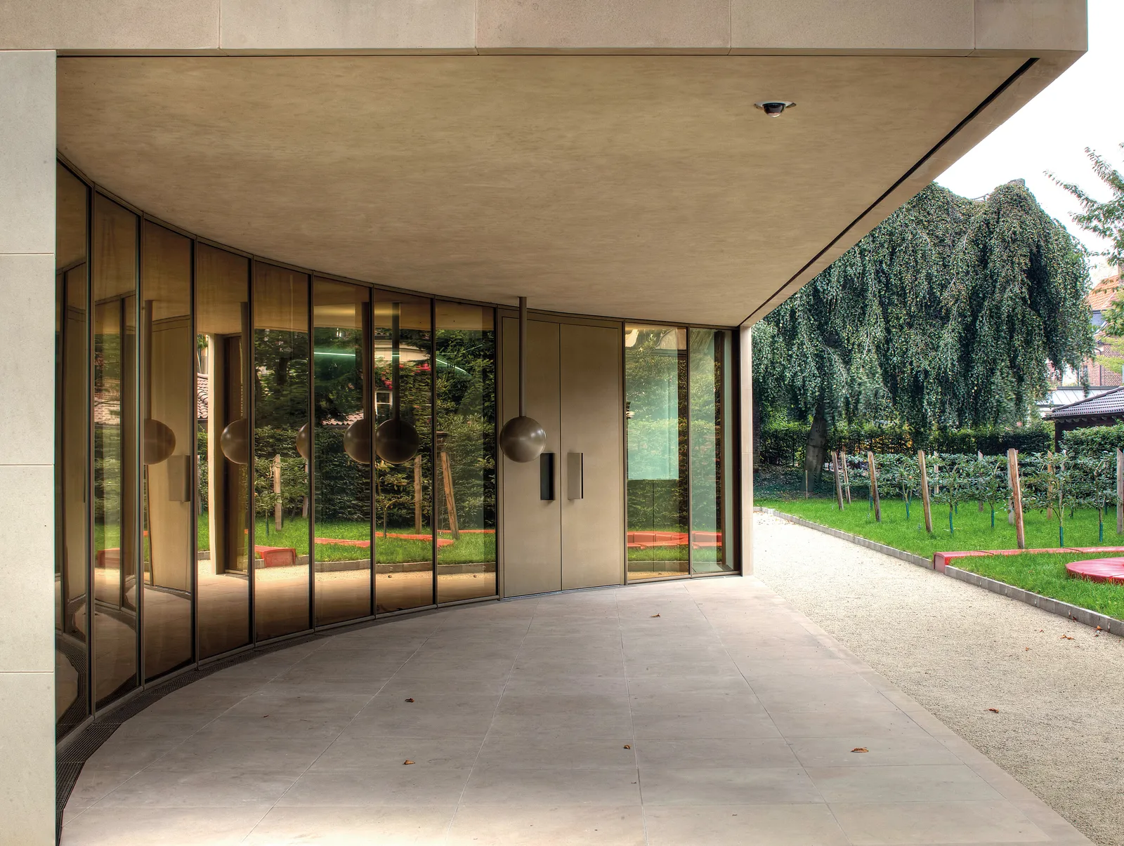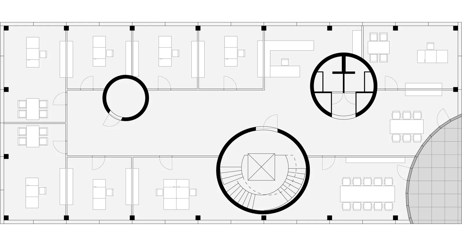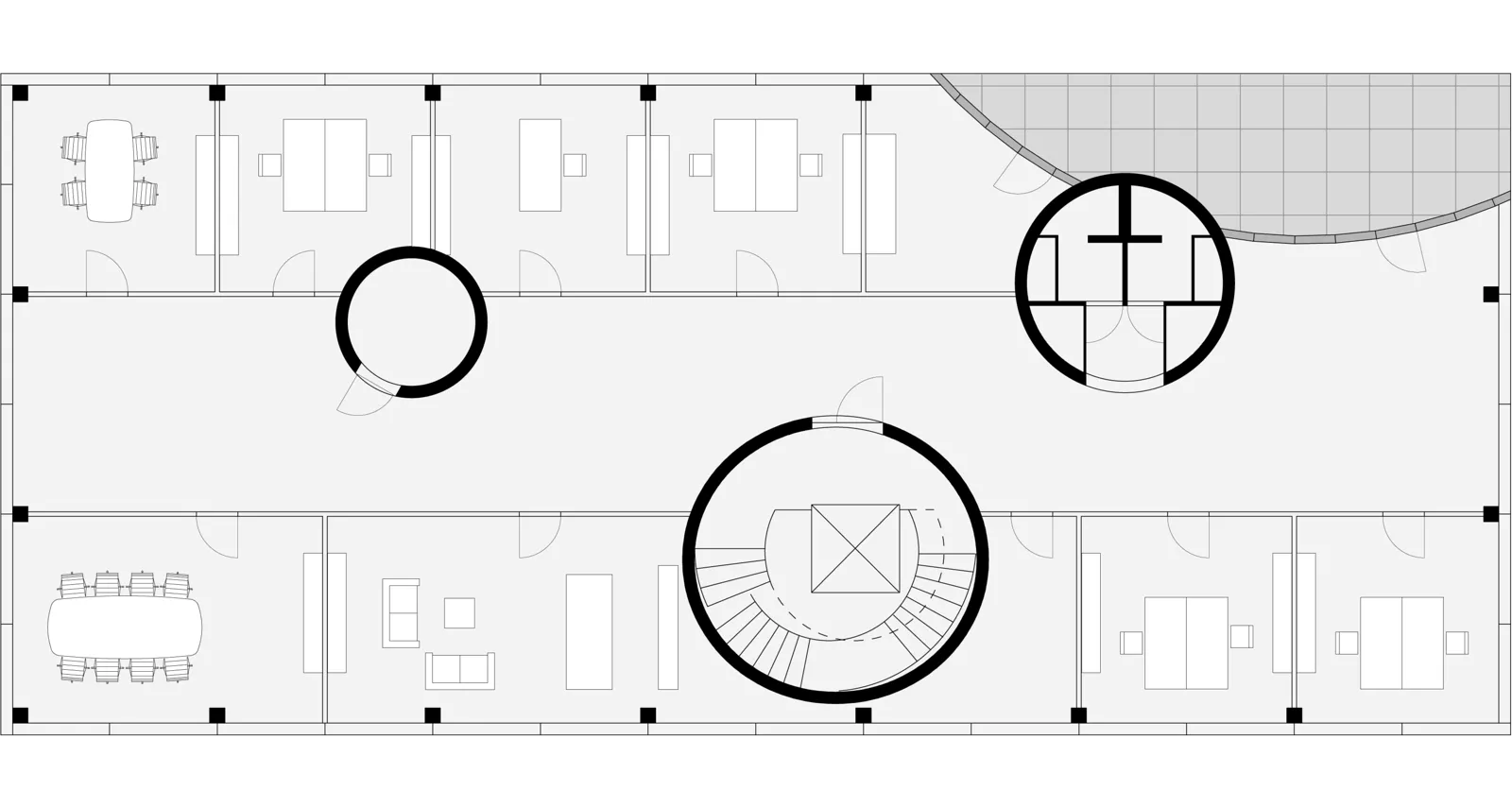Ausgangspunkt für das Konzept war der im Bebauungsplan für alle Gebäude festgelegte Rücksprung im obersten Geschoss. Mit mehreren kreisförmigen Einschnitten wurde dieser Rücksprung nicht nur im obersten Stockwerk ausgebildet, auch in den unteren Geschossen wurden zur Bildung von Terrassen und einem überdachten Eingangsbereich Zylinderabschnitte aus dem Gesamtvolumen subtrahiert.