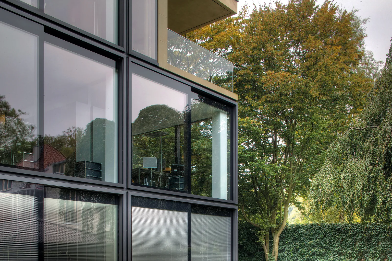Die dadurch entstandenen Auskragungen wurden diagonal zurückgespannt, sodass alle Außenterrassen stützenfrei realisiert werden konnten. Die stabile Form des Quaders scheint dadurch auf irritierende Weise aus der Balance zu geraten. So erhält das Gebäude seine expressive und einprägende Gestalt.