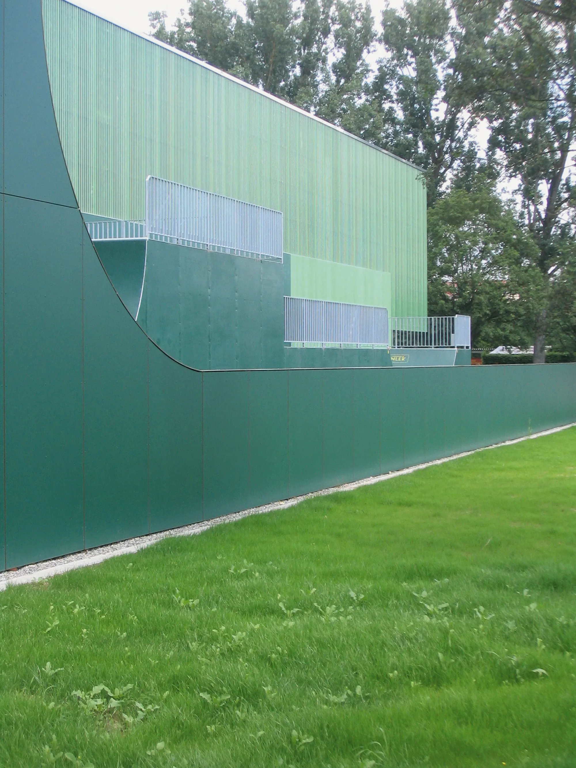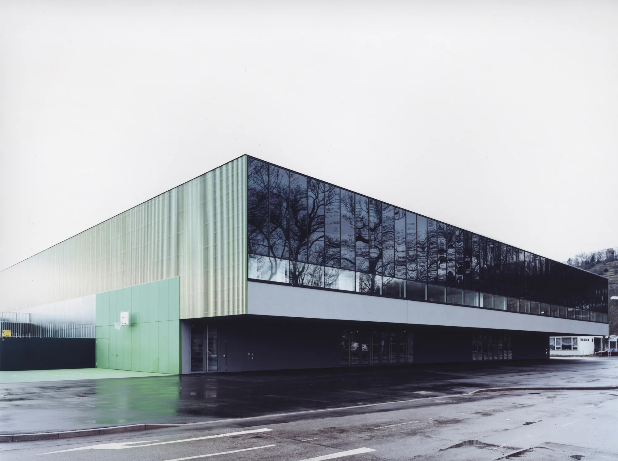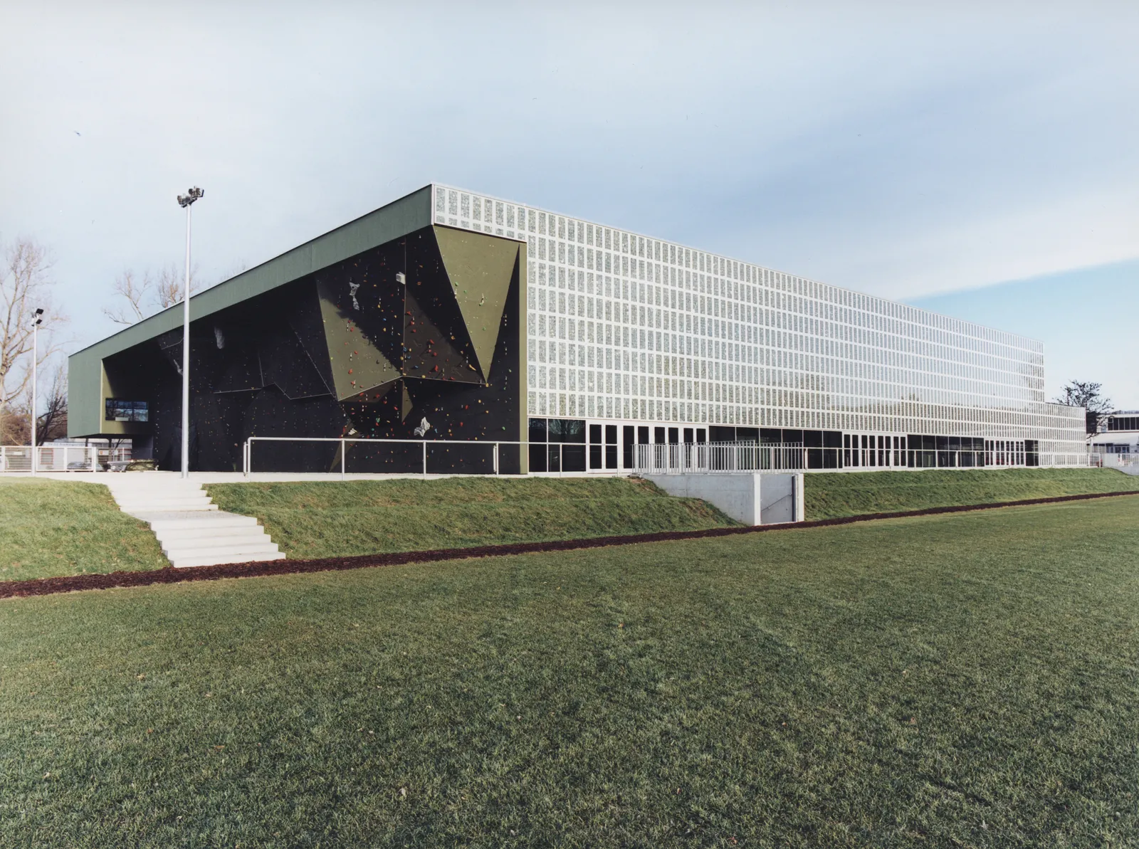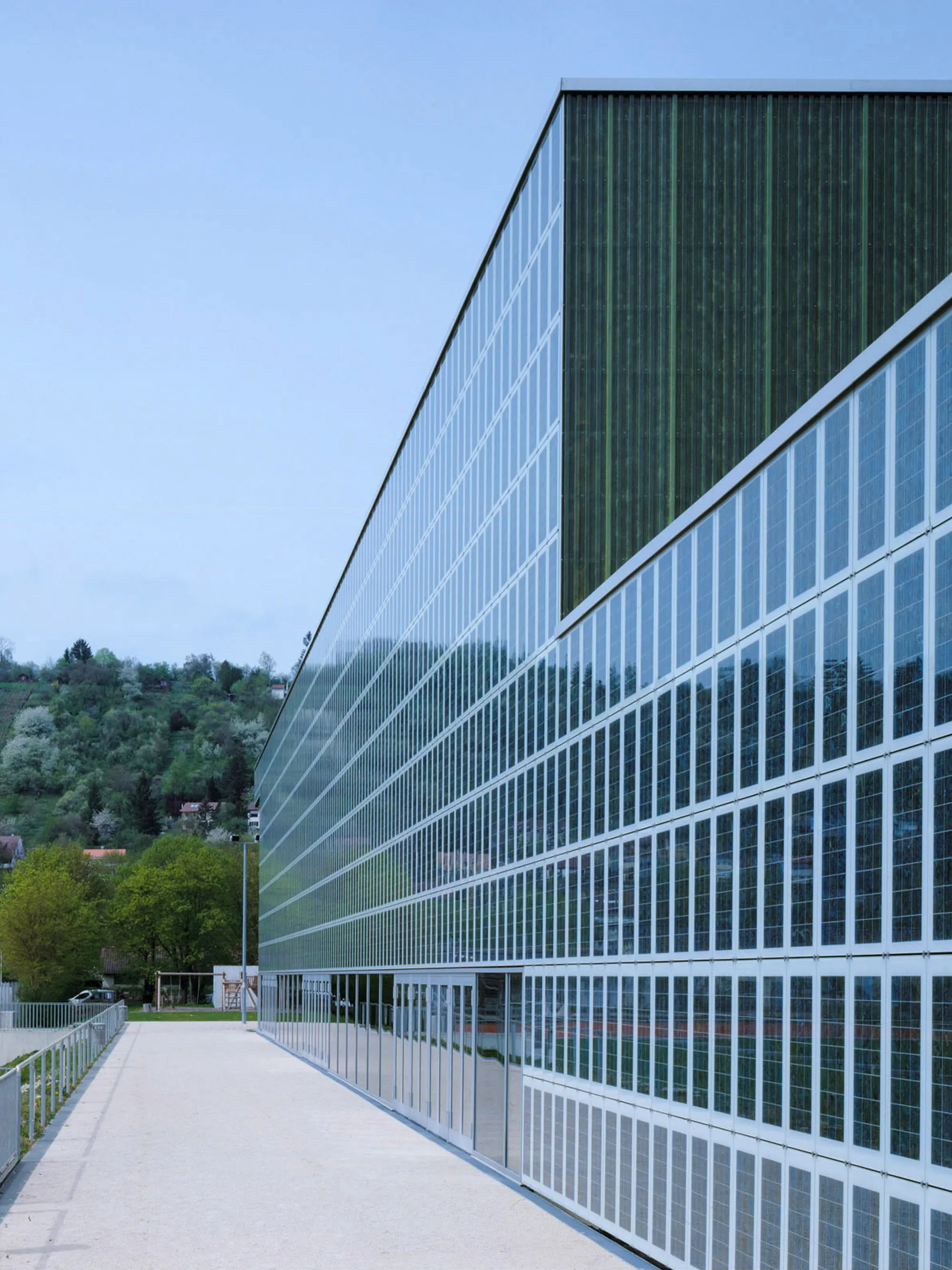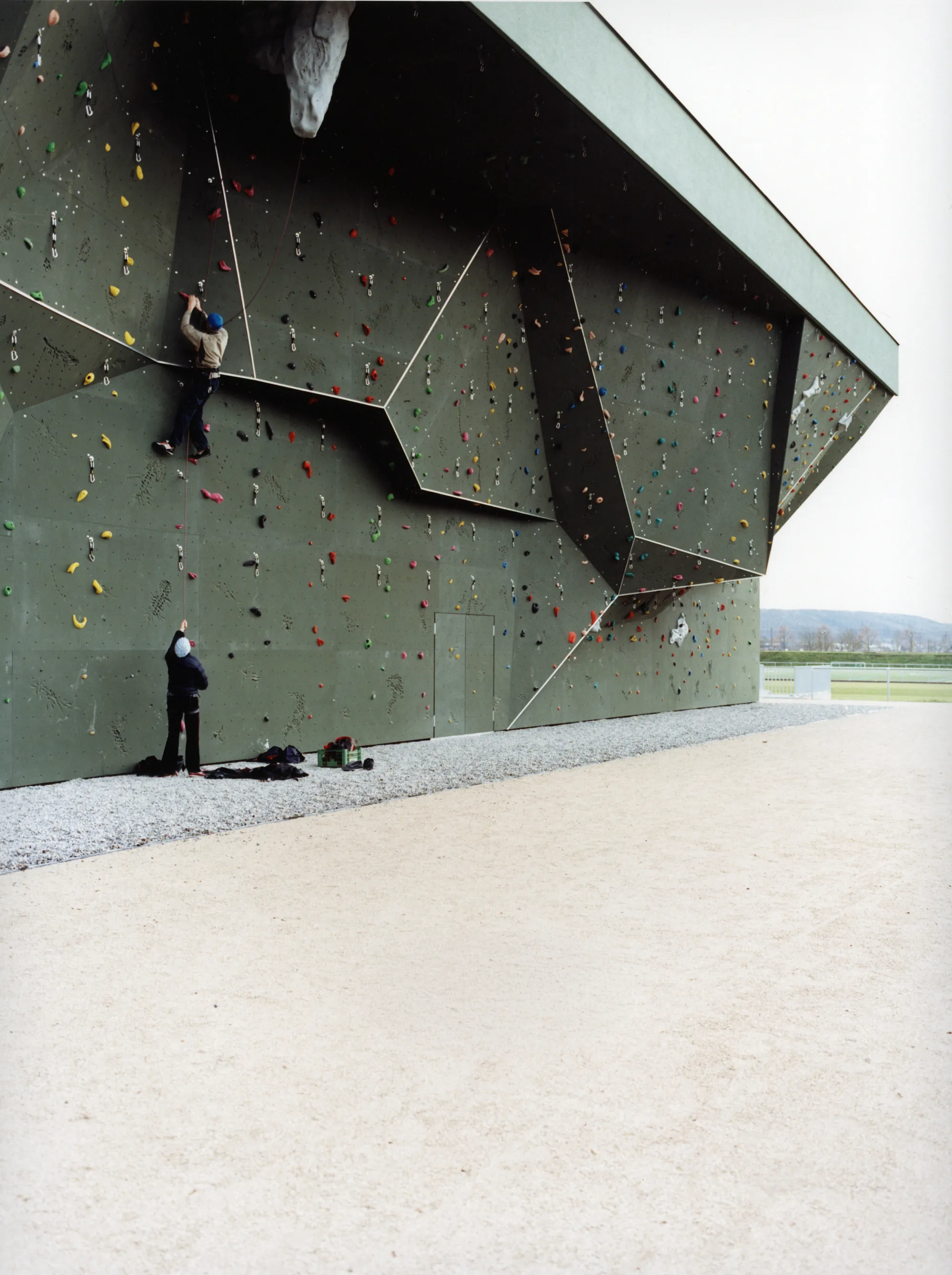 Maximale Nutzungsqualitäten auf knappem Raum – diese Anforderung führt zur Aktivierung der Fassaden über ihre primäre Funktion als Wetterhaut hinaus: Jede übernimmt eine eigenständige Aufgabe als Kletterwand, als Bühnenbild für Trendsportarten wie Skaten oder Streetball, als Photovoltaik-Anlage sowie als einladende Eingangs- und Galeriefassade mit transparenter Verglasung. Trotz dieser unterschiedlichen Ausprägungen und Wirkungen bilden die Fassaden ein Gestaltkanon aus Materialien und Farben, passend zur Hülle einer großen Sporthalle.