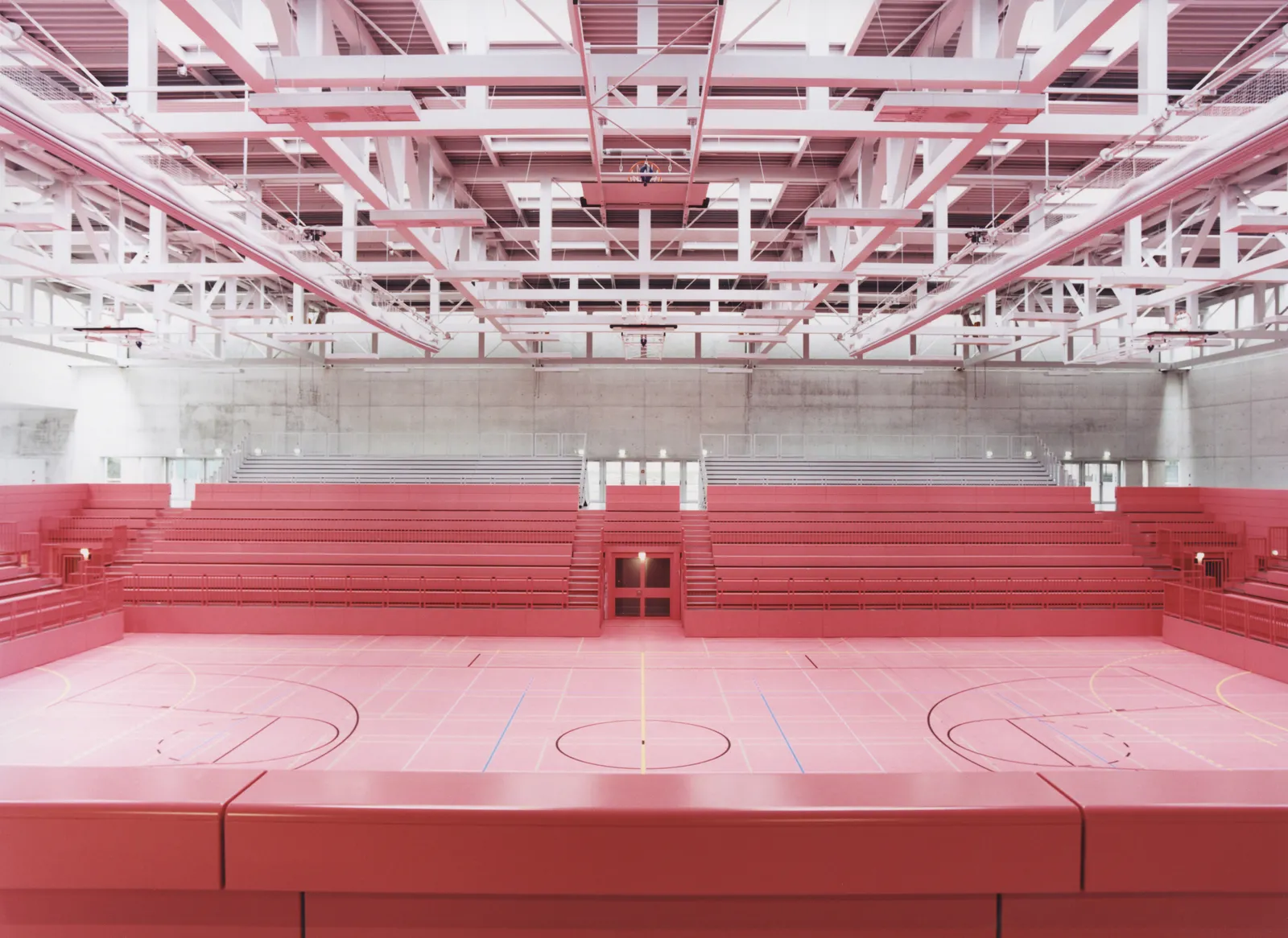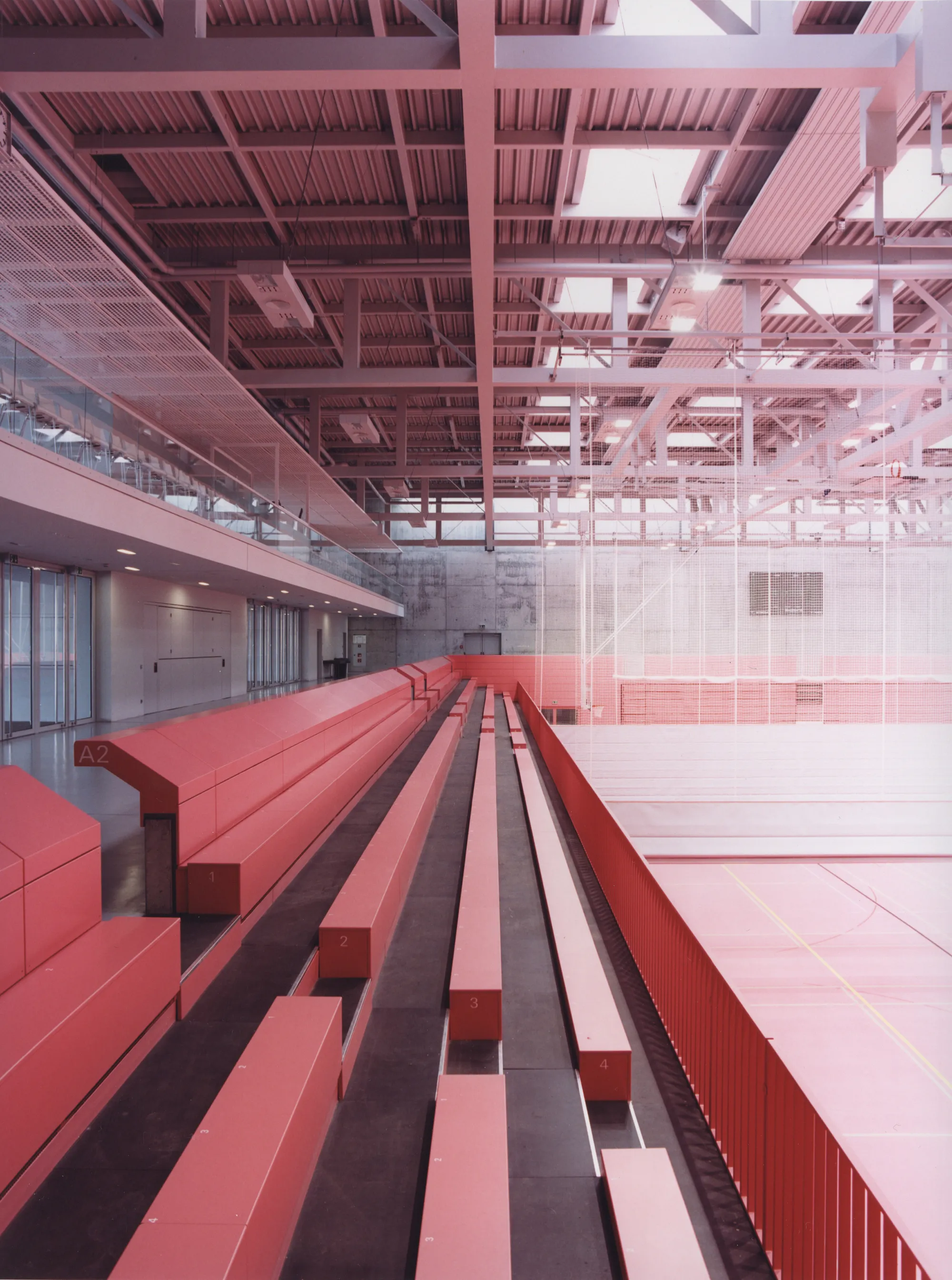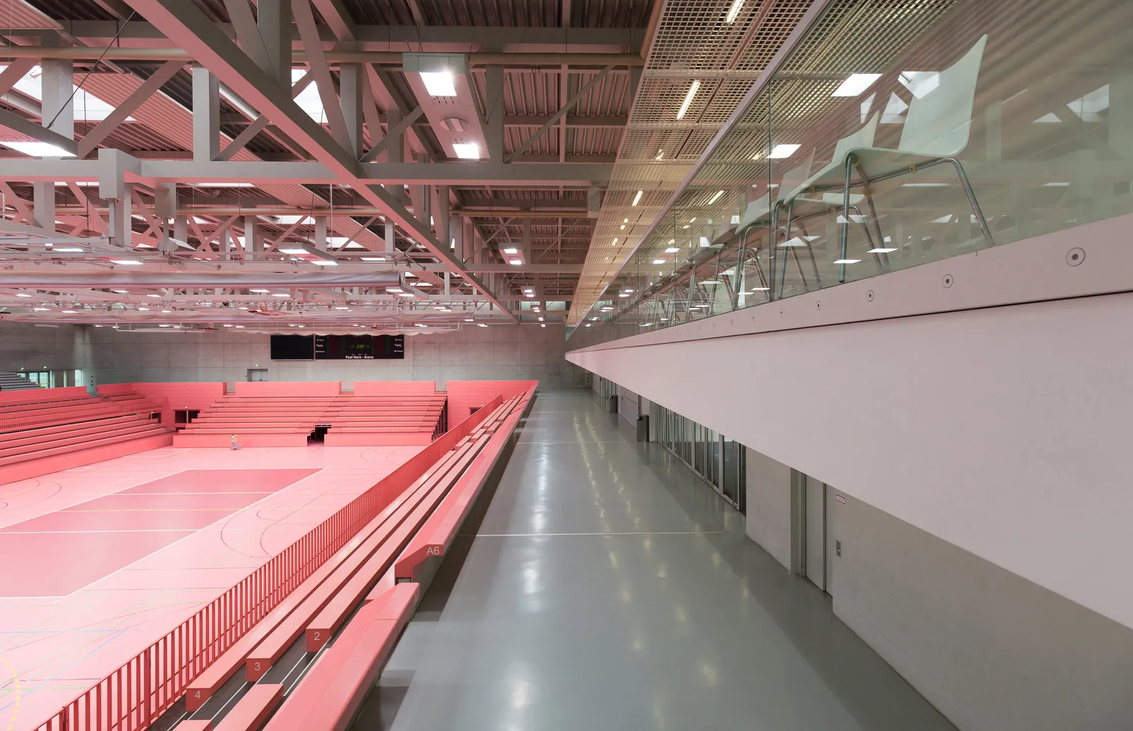 Der Heterogenität in der äußeren Erscheinung wird ein homogener Innenraum entgegengesetzt: ein magentafarbenes, monochromes Futteral für die zentrale Sport- und Veranstaltungsfläche mit einer Umfassung aus rohen Betonwänden. Ein für Sporthallen außergewöhnliches, natürliches Lüftungskonzept ergänzt zusätzlich zur Photovoltaik-Fassade den ganzheitlich nachhaltigen Ansatz des architektonischen Konzepts.